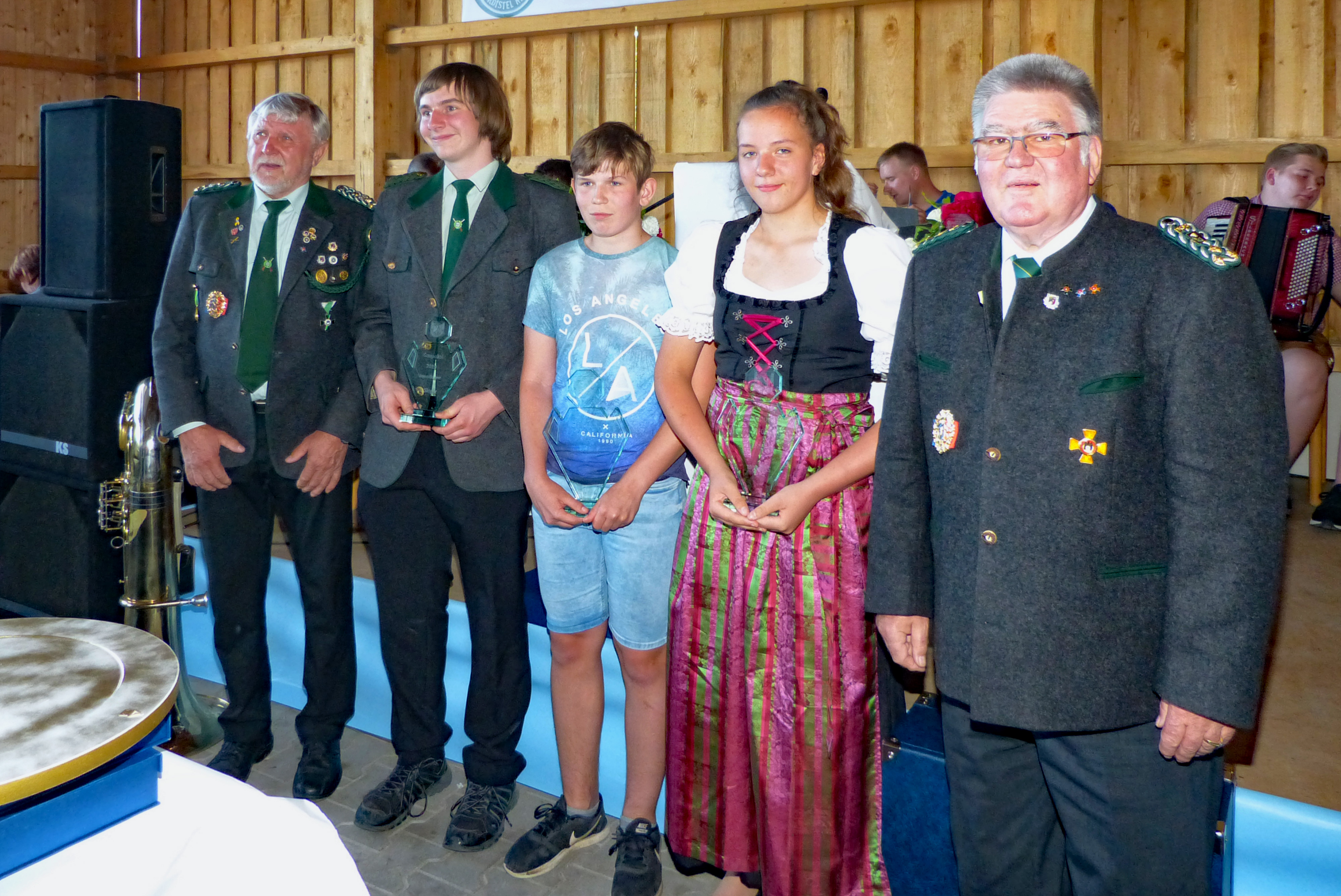 Um 16:00 Uhr ist die Preisverteilung des Jubiläums-, Gau- und Sparkassenpokalschießens angesetzt. Beim Gauschießen ist die Proklamation des Gaukönigs, der Gauliesl und des Gaujugendkönigs mit Rittern und Zofen im Programm. Dazu sind der Schirmherr, der Landrat des Landkreises Amberg-Sulzbach, Richard Reisinger, 1. Gauschützenmeister und Gauehrenmitglied Dietmar Beyer, 1. Gauschießleiter und Gauehrenschützenmeister Wolfgang Moll, Gauehrenschützenmeister und OSB-Ehrenmitglied Karl Federer, Gauehrenmitglied Leo Kurz, so wie der Erste Bürgermeister der Gemeinde Etzelwang, Roman Berr und der Erste Bürgermeister der Gemeinde Neukirchen, Winfried Franz, eingetroffen. Sie begrüßt der Erste Schützenmeister Hans Roth zusammen mit den anwesenden Vertretern der Schützenvereine und den Teilnehmern am Schießen.
