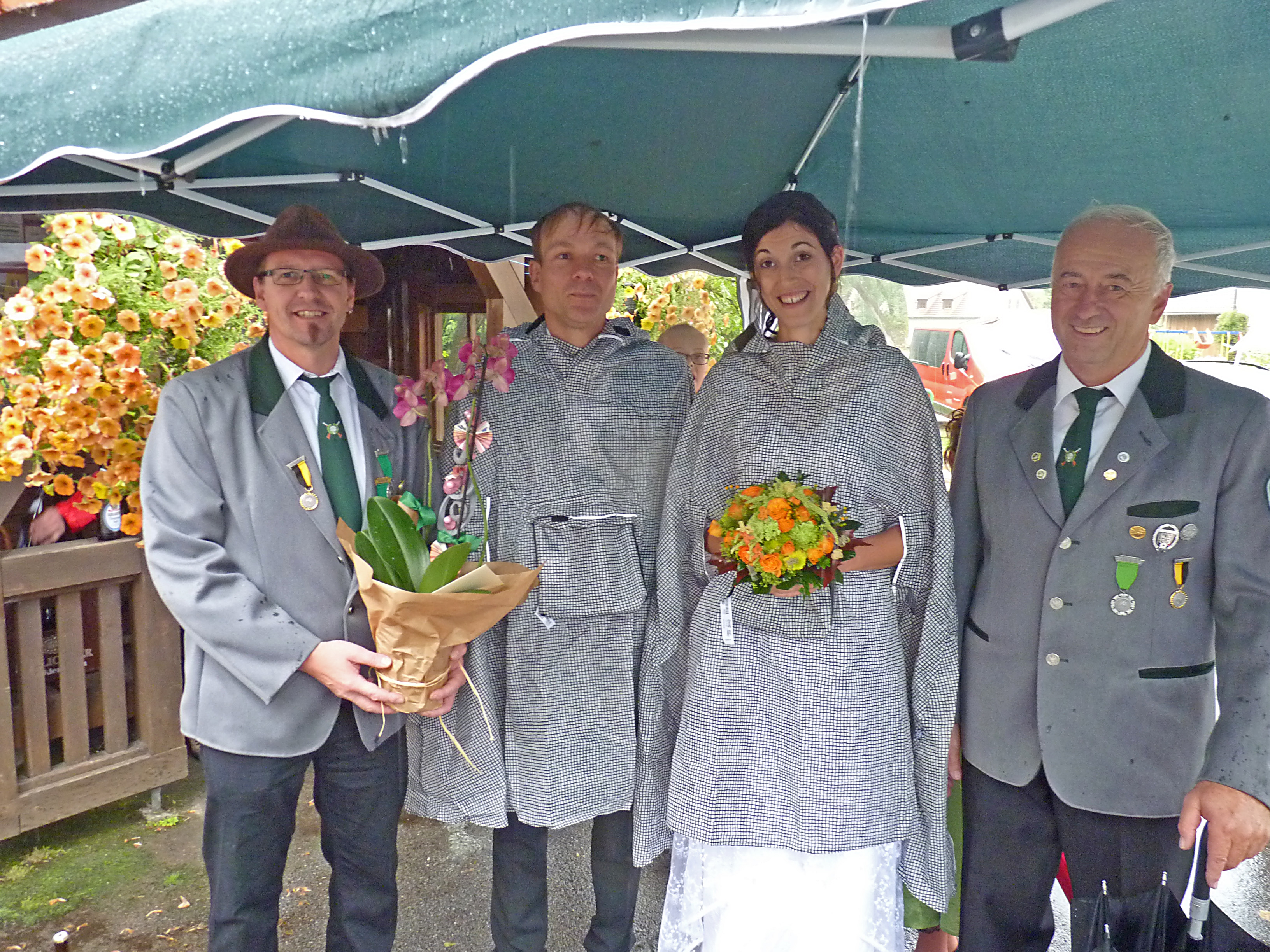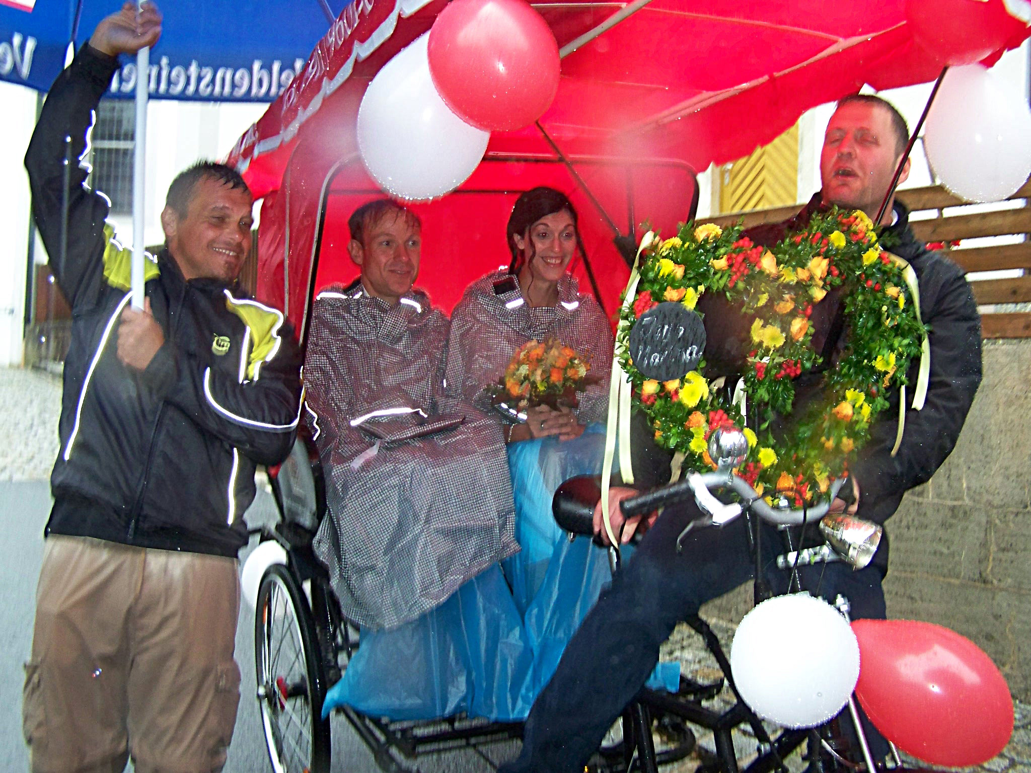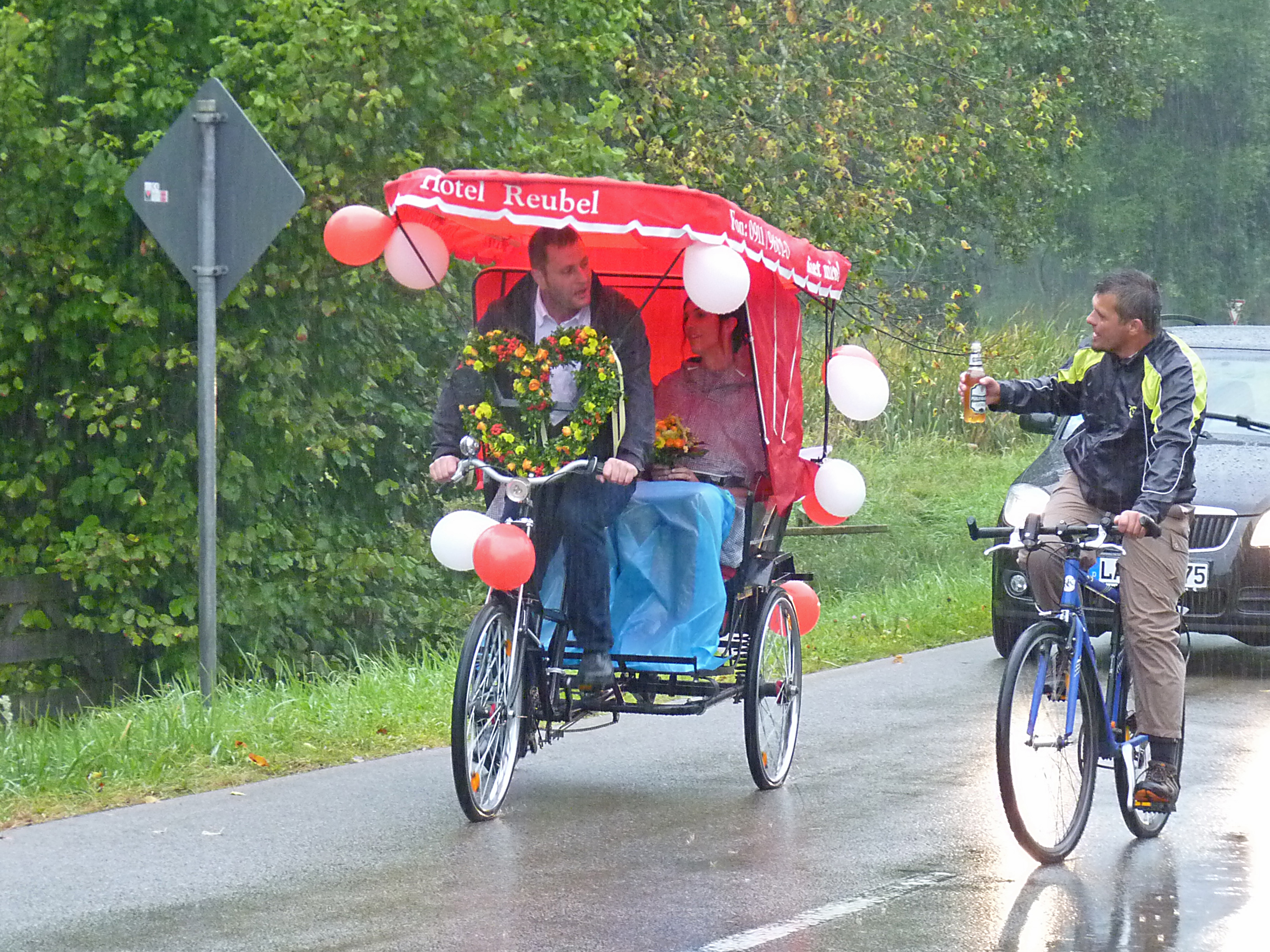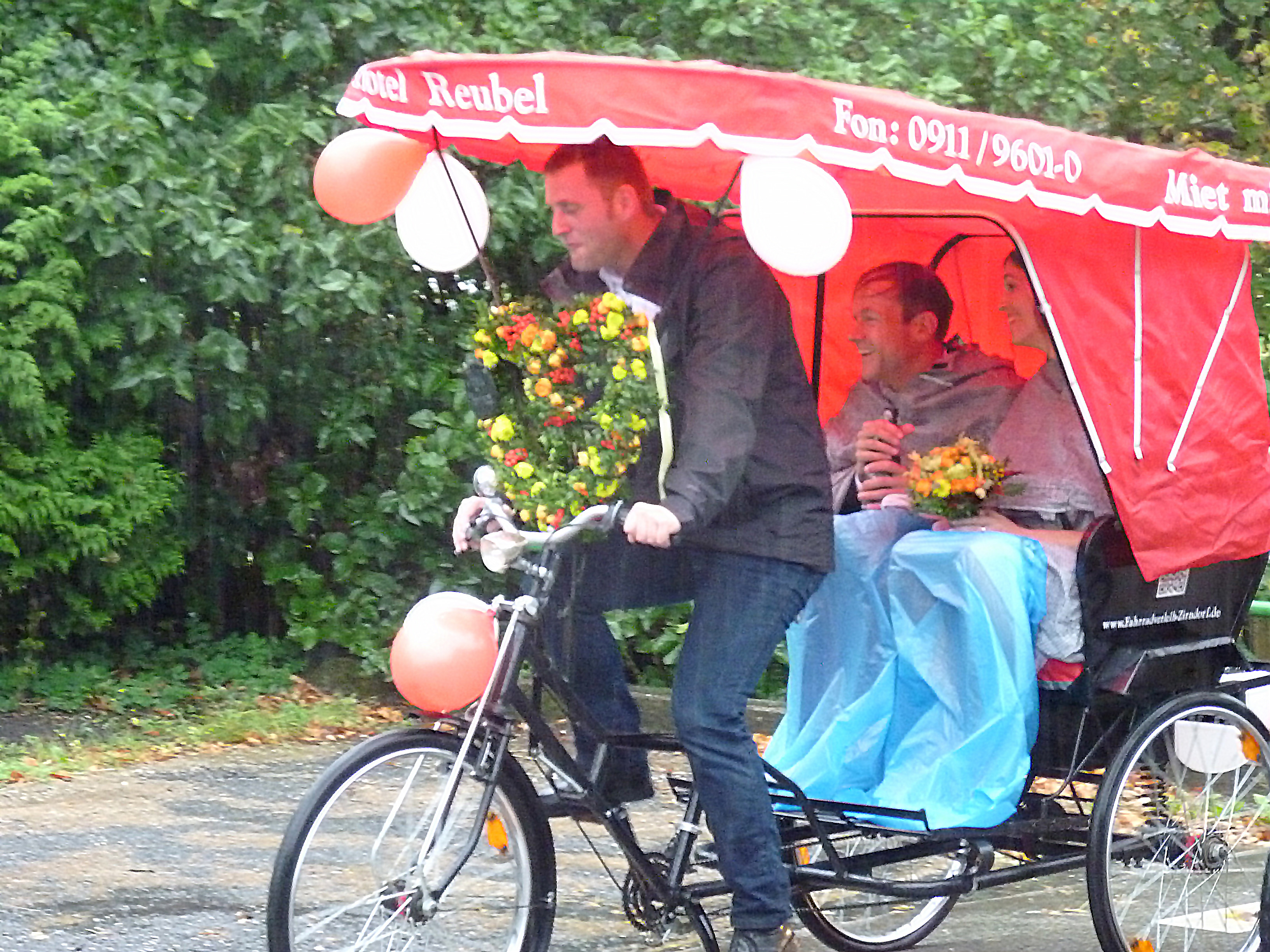 Hochzeit von Marina Regler und Jens Rischan Samstag 17. September 2016 „Der Braut soll es in den Schleier regnen“ sagt ein altes Sprichwort und bei Marina Regler und Jens Rischan hat es an diesem Tag reichlich geregnet. Nach der weltlichen Trauung durch Bürgermeister Hans Durst im Rathaus in Eschenfelden ging es zur kirchlichen Trauung in die St. Wolfgangskirche nach Hirschbach.Den kirchlichen Segen gab den beiden Pfarrer Gerhard Durst. Neben dem Posaunenchor unter der Leitung von Jörg Tippmann umrahmten Evi Strehl mit der Zither, Marco Regler und Petra Rischan den feierlichen Gottesdienst mit einem Hochzeitslied von Evi Strehl dazu zwei Instrumentalstücke mit Zither und Akkordeon. Vor der Kirche erwartete das Hochzeitspaar, neben einem Meer von Regenschirmen, die Wasserwacht Hirschbach unter umfunktionierten Sonnenschirmen und der Skiclub Artelshofen mit einem Ehrenspalier. Ein paar Meter weiter stand dann das Gefährt, mit dem die Jungvermählten zur weiteren Feier nach Eschenfelden gefahren wurden: eine Fahrrad-Rikscha. Das Brautkleid und der Anzug wurden von oben mit