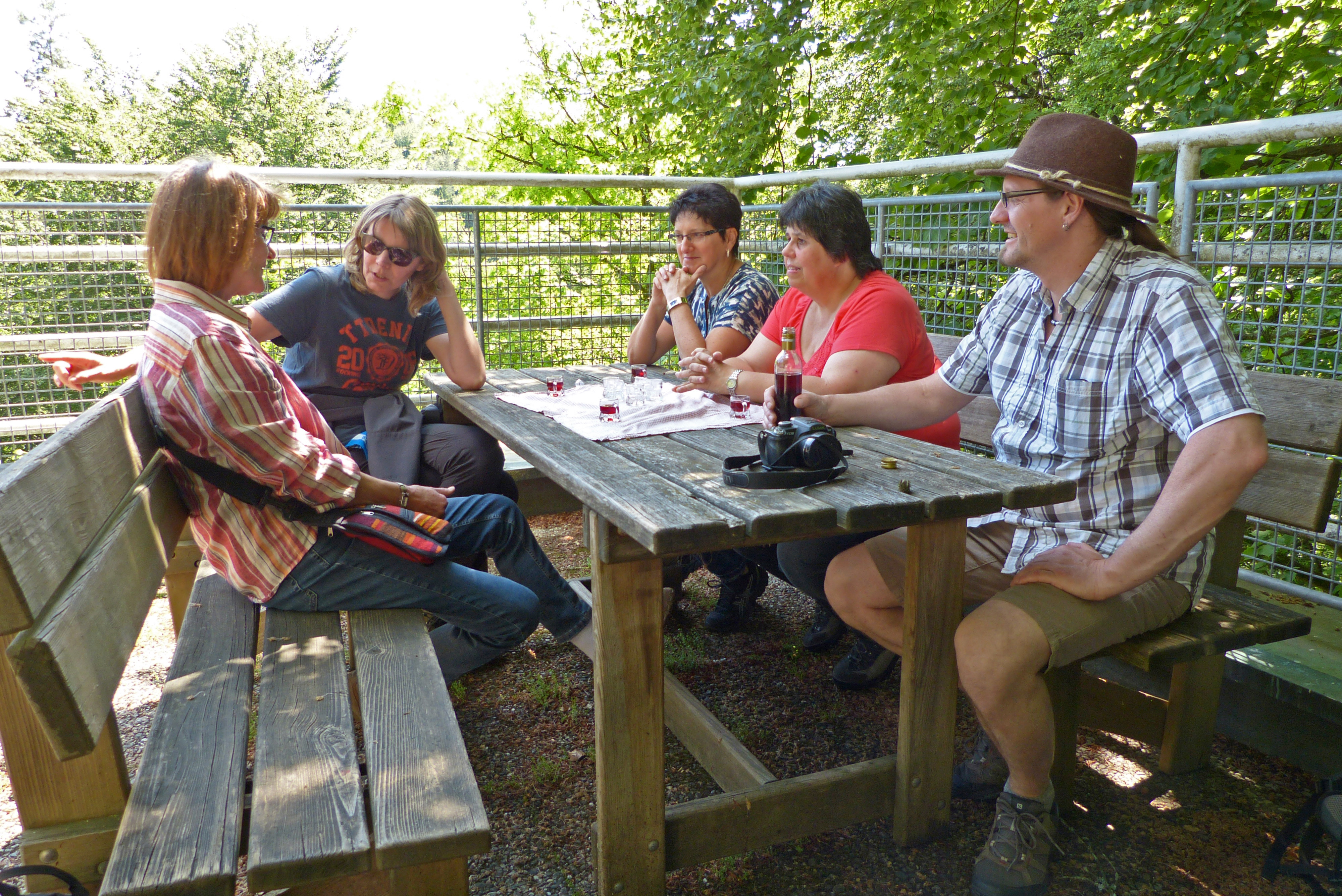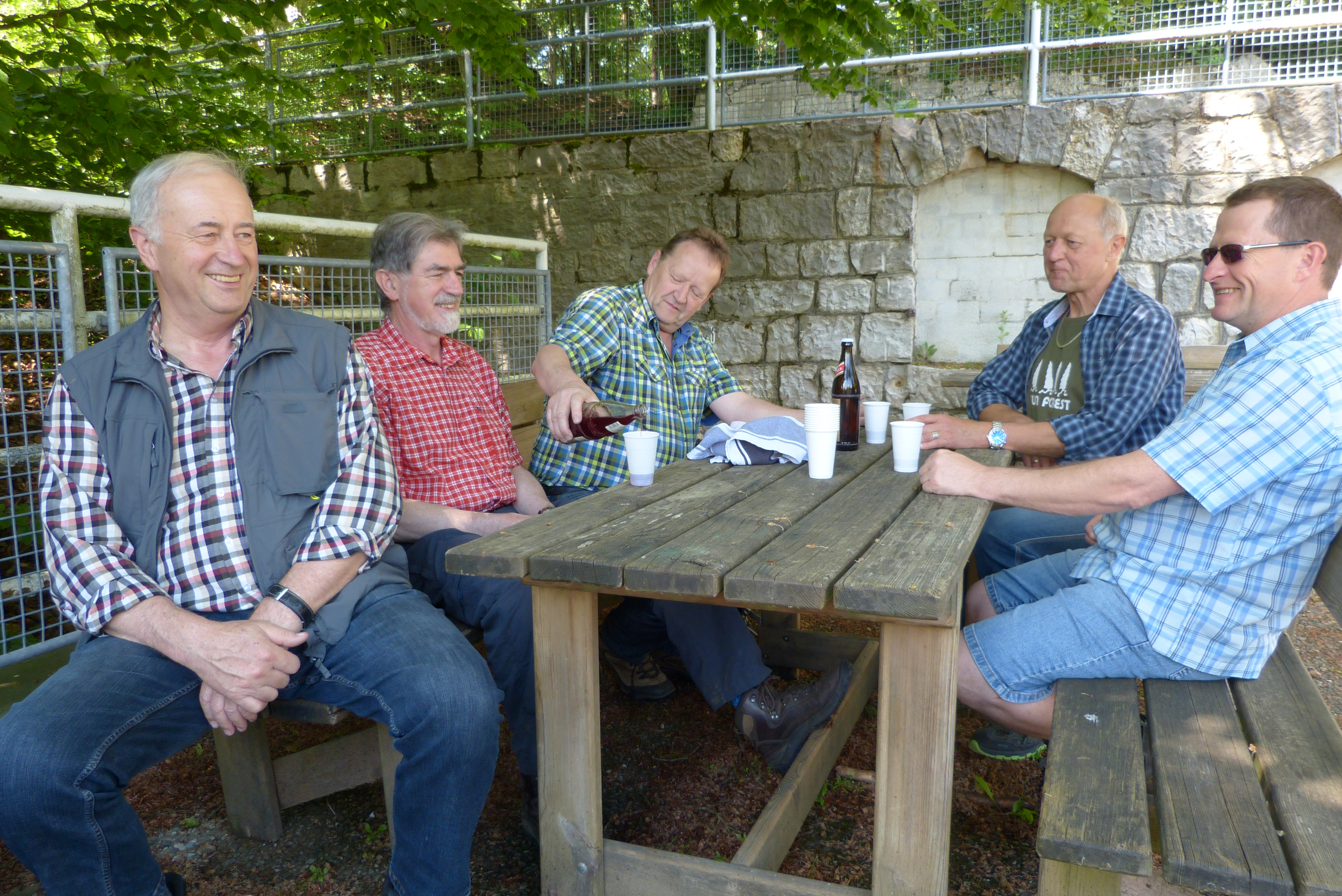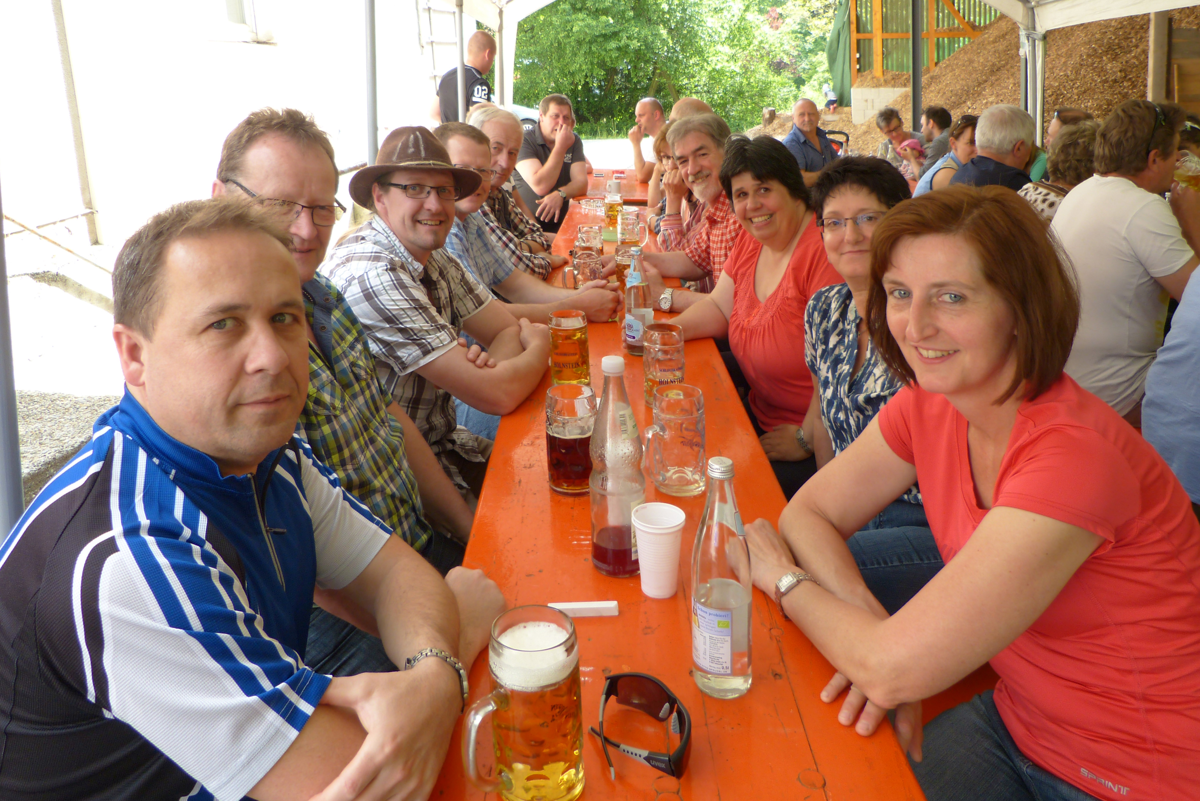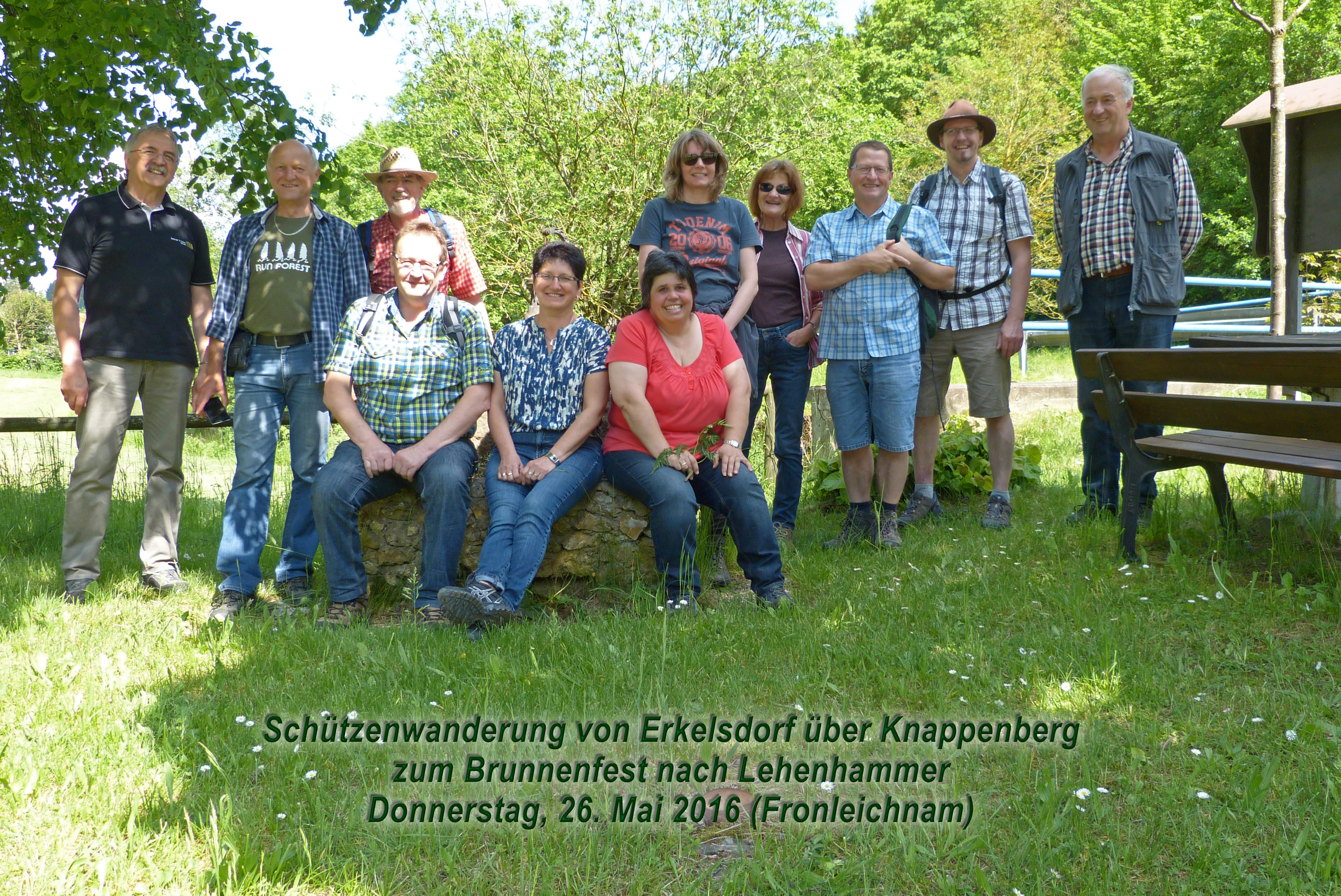 Auf dem Rastplatz des Knappenberges war die erste Rast fällig, wo die süßen, prozenthaltigen Köstlichkeiten der Appel Familien Georg und Bernd genossen wurden.Nach dieser Stärkung ging es mit neuen Kräften zuerst an den Abstieg. Der weitere Weg verlief dann wiederum durch die mit Feldern und Wiesen abwechslungsreich gegliederte Landschaft an der Schiabfahrt und der ehemaligen Sprungschanze am Brennberg vorbei Richtung Lehenhammer. Dort hatte, wie alle Jahre, der Lehentaler Heimatverein für sein Brunnenfest im Biergarten des vormaligen Forellenhofes alles bestens vorbereitet. Der Garten war schon gut gefüllt. Für unsere Wandergruppe war aber noch genügend Platz, so dass sich auch die Nachzügler, die an der Wanderung nicht teilgenommen hatten, einreihen konnten. Bei Kaffee, Kuchen, alkoholischen oder auch non-alkoholischen Getränken und Köstlichkeiten vom Grill und von der reichhaltigen Salattheke ließen wir es uns gut gehen und den Tag ausklingen. Dann bis zum nächsten Jahr.