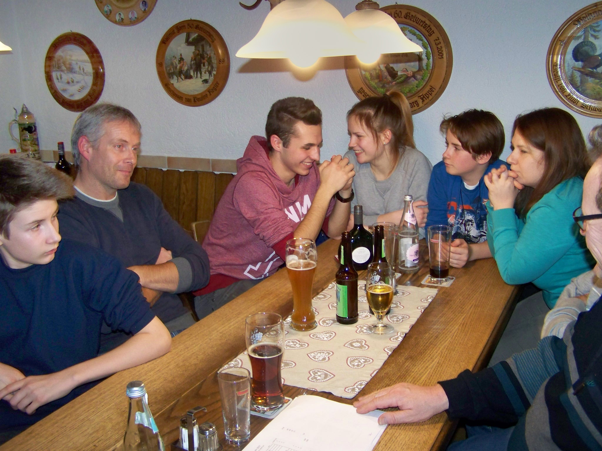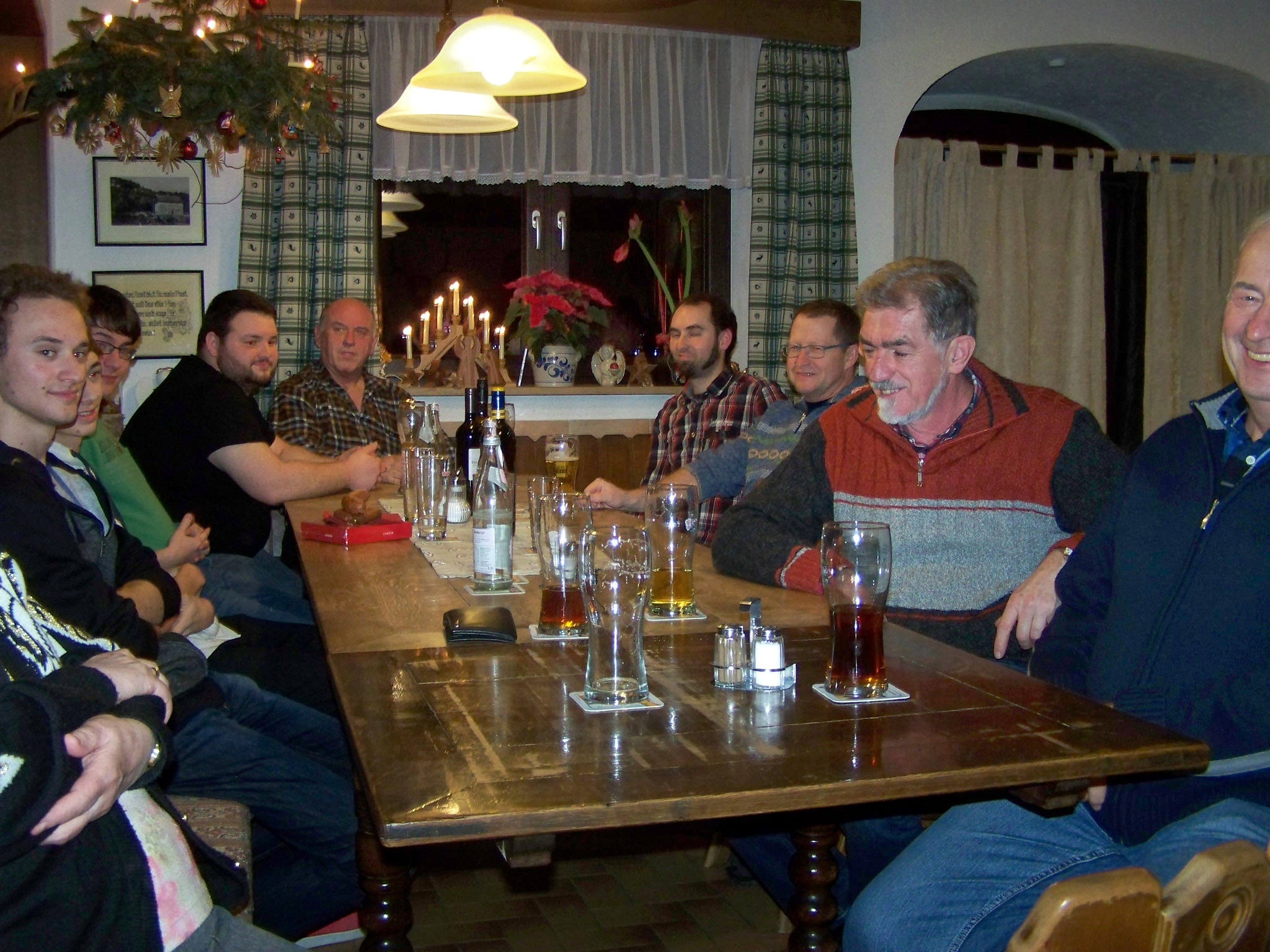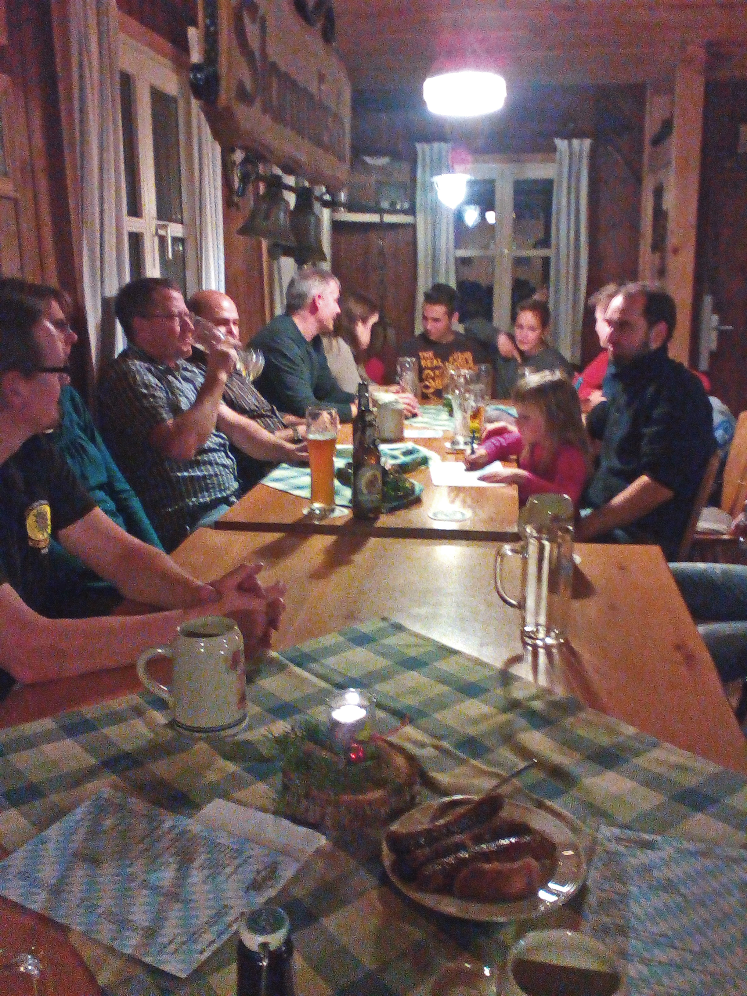 Unsere Wirtsleute, Helga und Rudi Schwab, haben vom 24. November bis einschließlich 01. Dezember ihren wohlverdienten Urlaub angetreten. Aus diesem Grund fielen die Schießtage während dieser Zeit aus. Da der Besuch der Ossinger Hütte im letzten Jahr sehr gut angekommen und stark angenommen war, kümmerte sich unser (Ober)Schießleiter Appel Georg beim Hüttenwirt um einen Termin. Die Hütte ist immer gut besucht und in der Vorweihnachtszeit ganz besonders. So blieb nur Samstag der 26. November für den Besuch. Um 18:30 h war das Treffen auf dem Parkplatz des Sportvereins Königstein angesetzt. Mit den nötigen Beleuchtungsmitteln ausgerüstet trafen alle Teilnehmer pünktlich ein. So wurde bei kühler, aber trockener Witterung bei tiefer Dunkelheit los marschiert. Als jüngste Teilnehmerin der 23 Wanderer war Loos Sophia mit ihren vier Jahren dabei. Zügig ging es den Berg hinauf - manche meinten schon unterwegs den Duft von Glühwein oder Sauerkraut wahr zu nehmen. In der Hütte war wieder bestens eingeheitzt, so dass der Platz direkt am Ofen nicht so sehr gefragt war.