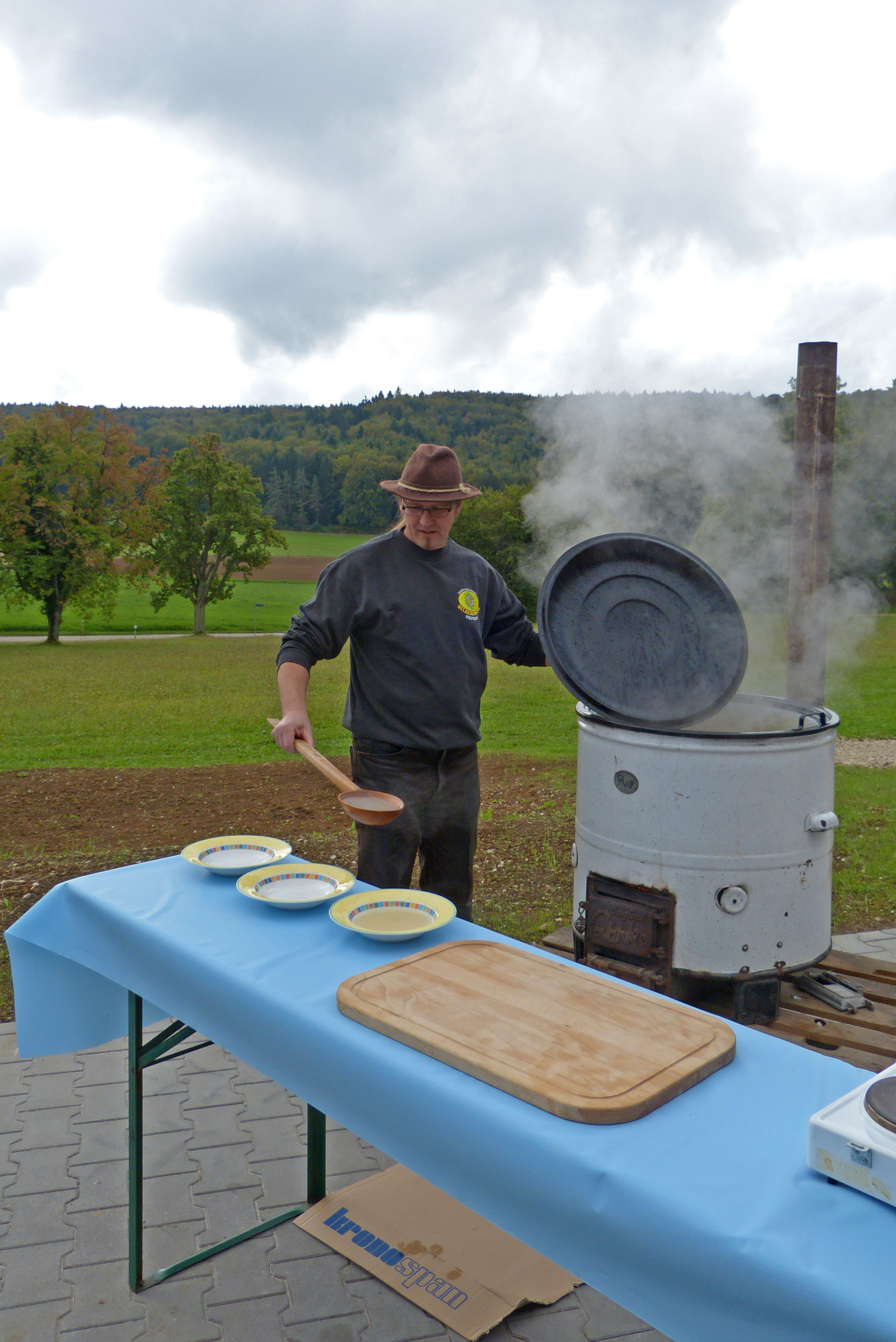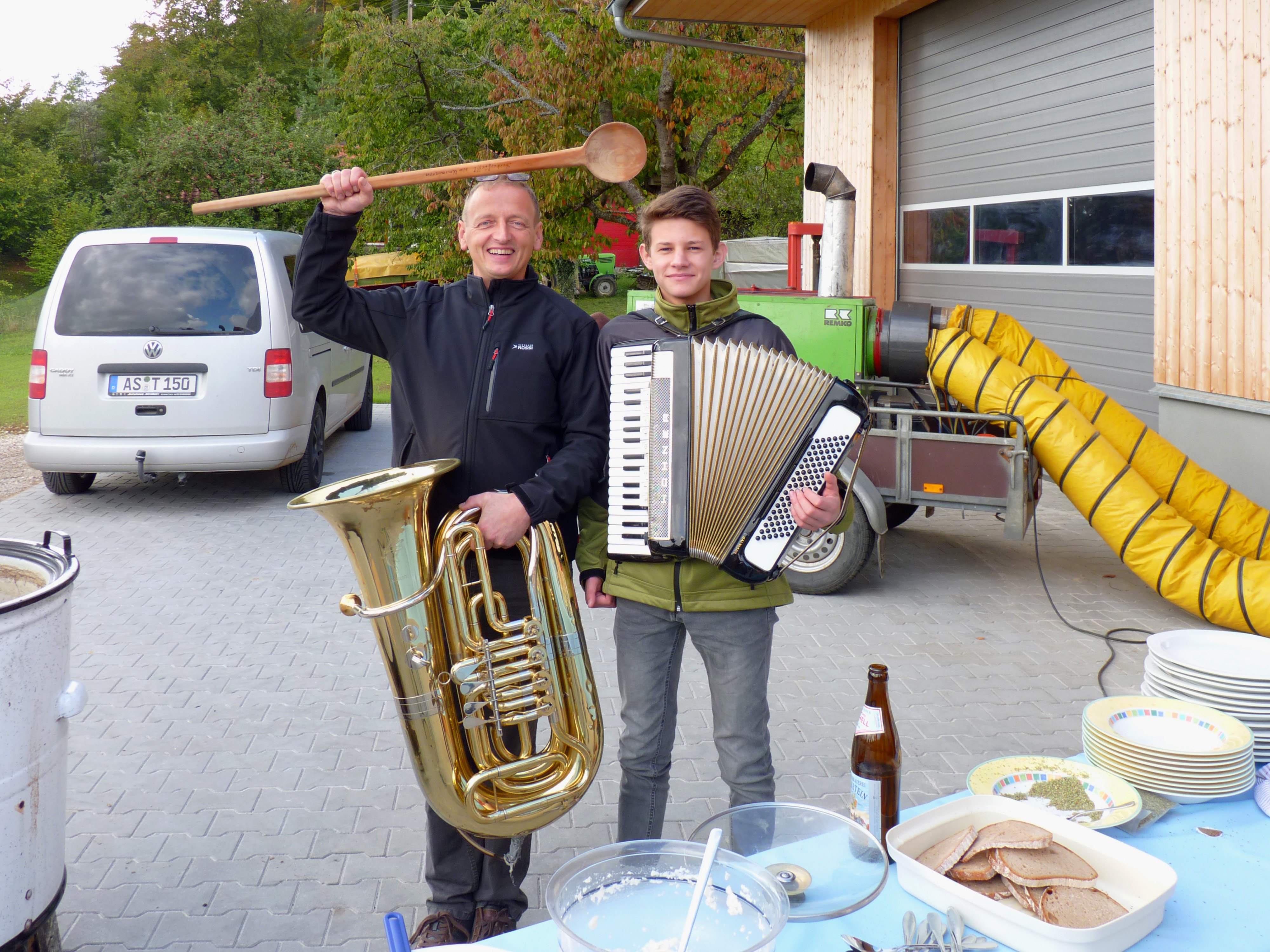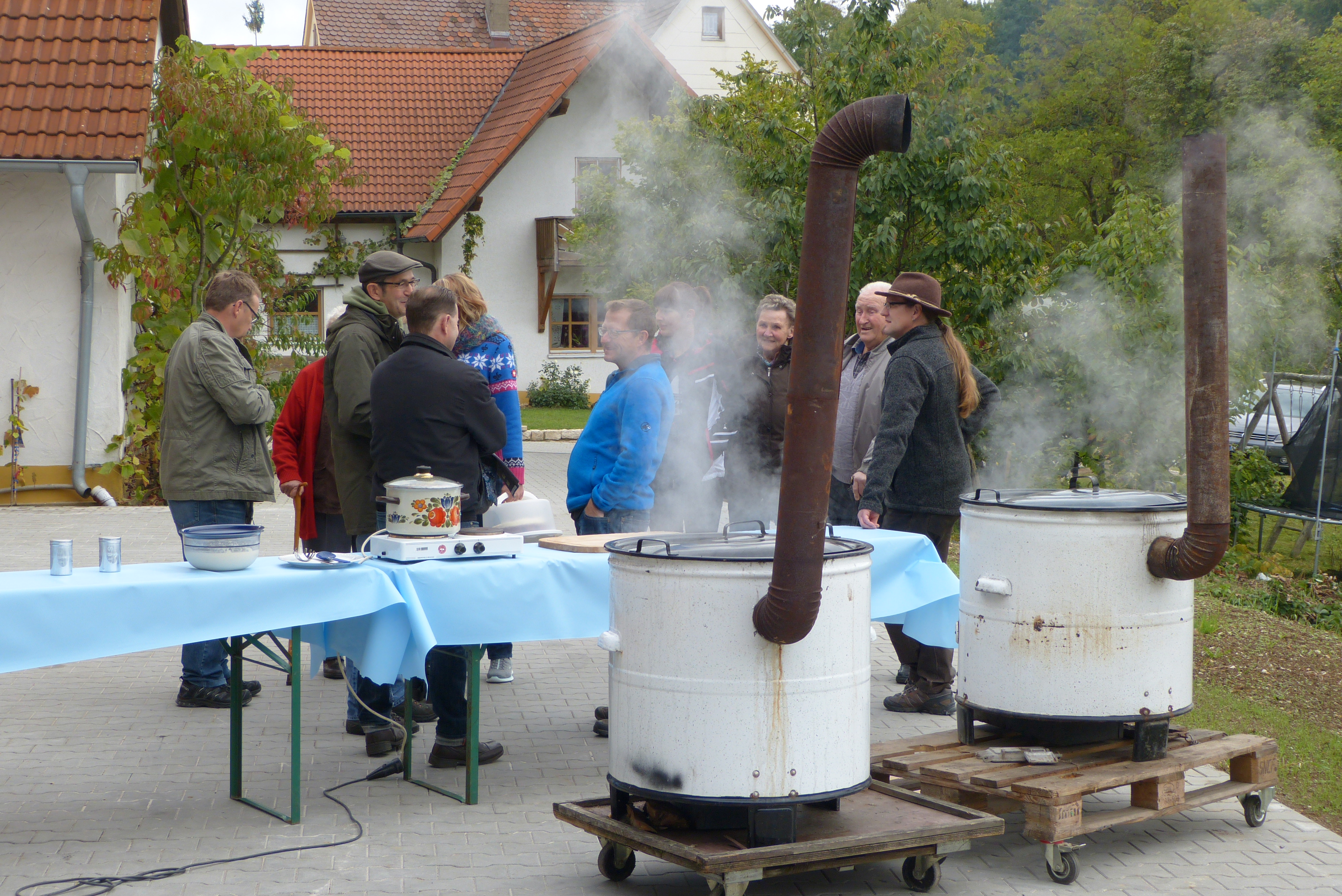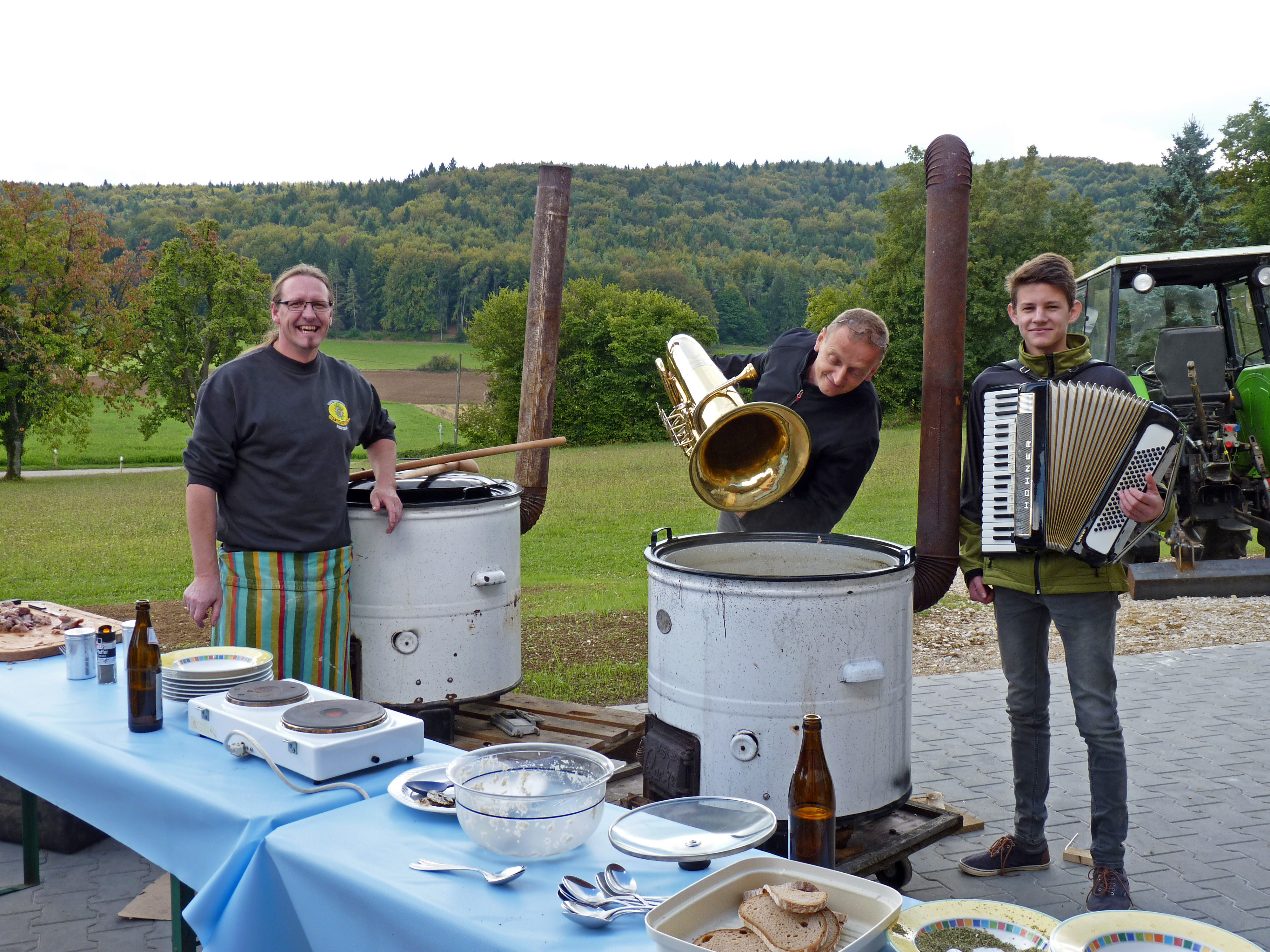 Nach dem Aufbau am Freitag, in der Halle der Drechslerei Appel in Heuchling, der fast ausschließlich in den Händen der Appels lag, nur unterstützt von Haller Gerd und Gradl Hans, hieß es für die fast gleiche Mannschaft, schon früh am Sonntag Morgen, die Kessel anzuheizen. Dies lag wiederum in den bewährten Händen von „Oberkoch“ Bernd Appel. Als die ersten Gäste eintrafen, dampfte es schon anständig aus den Kesseln. Damit war gewährleistet, dass, wie angekündigt, um 11.30h die ersten Portionen genossen werden konnten. Wie es sich für einen zünftigen Frühschoppen gehört, spielten der Appel Andreas („Quetschn“) und der Ertel Roland (Bass) zünftig auf. So versammelte sich in der beheizten Halle doch eine ansehliche Gästeschar, da auch das Wetter mitspielte und sich sogar zeitweise die Sonne zeigte und die im Freien auch noch wärmte.