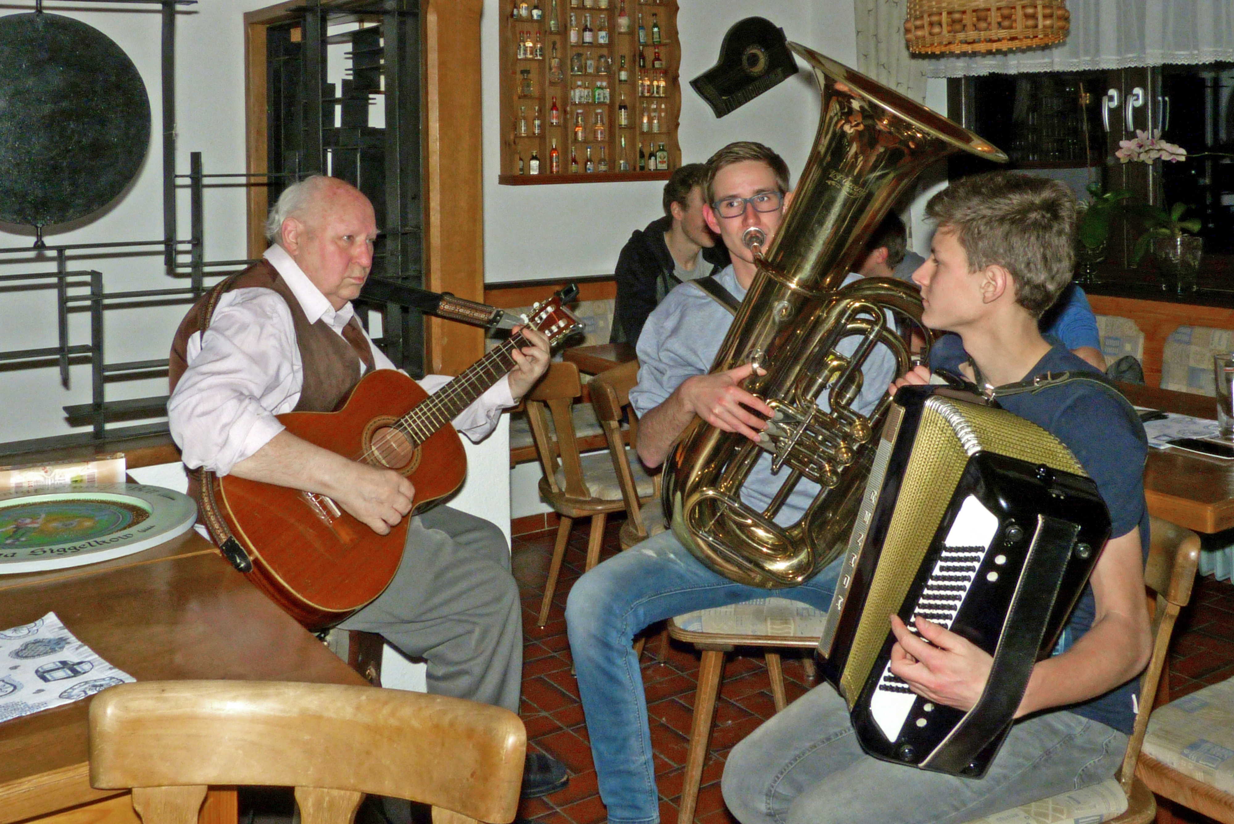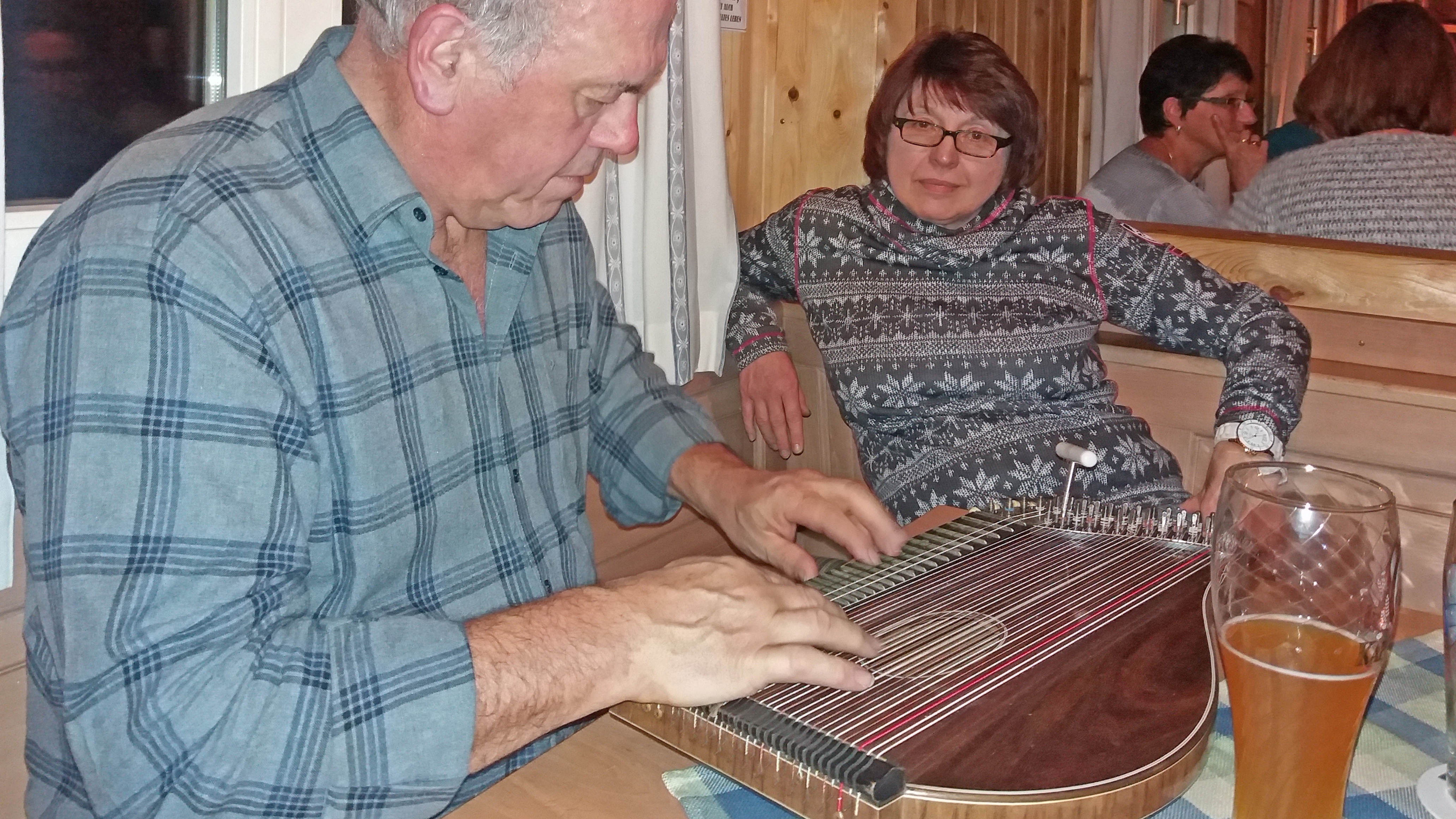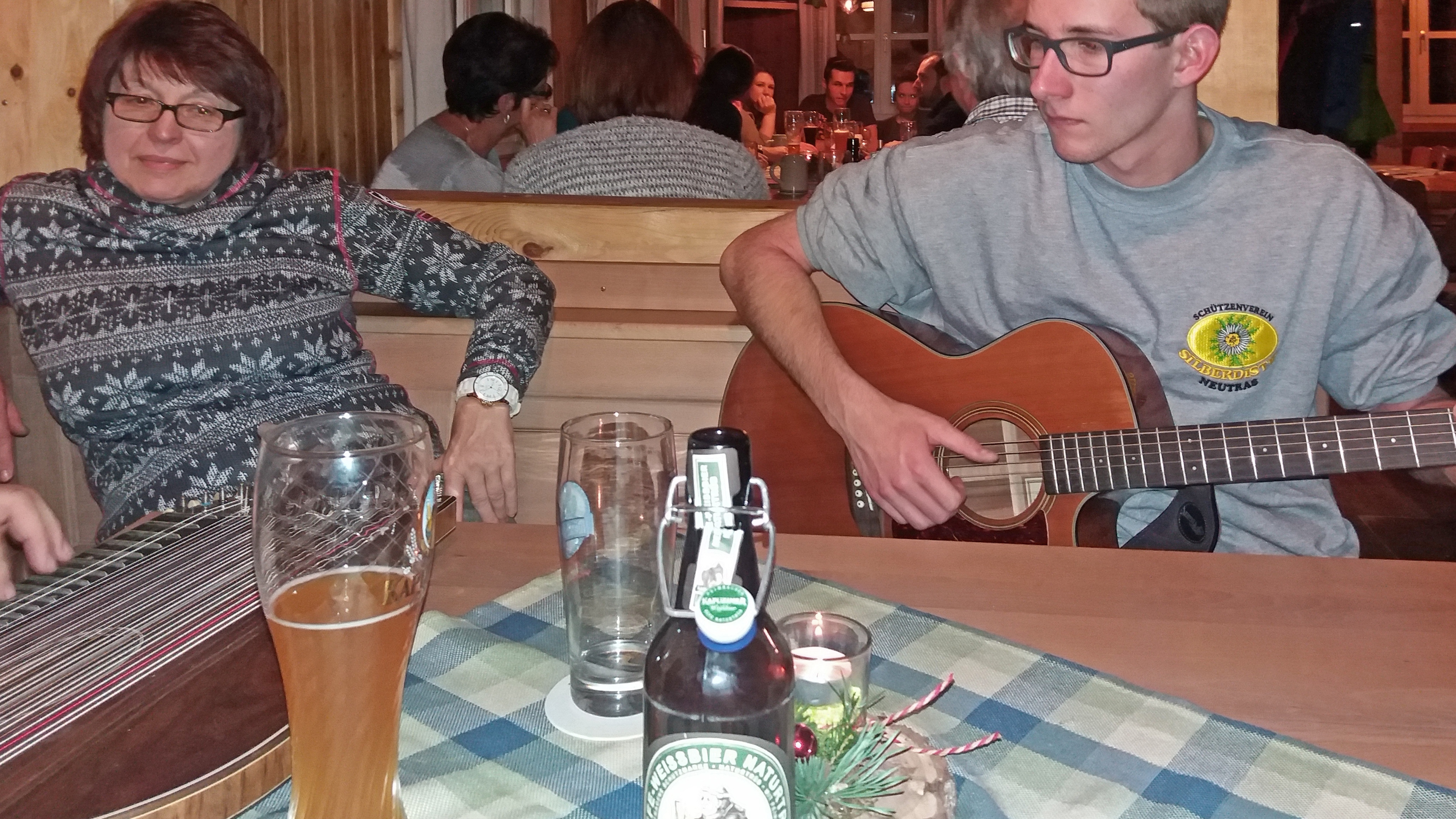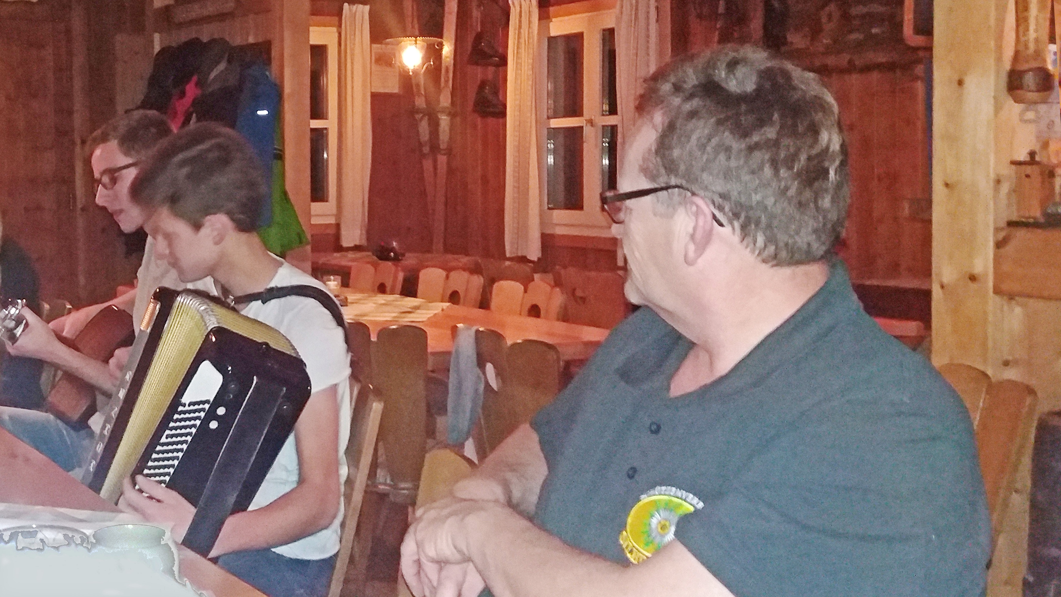 Nachdem der Hunger gestillt war, griffen die Appel Brüder Johannes und Andreas zu ihren Instrumenten - Gitarre und Schifferklavier - die ihr Vater Bernd den Berg hoch geschleppt hatte. Nachdem bekannt wurde, dass der Wirt eine Zither in der Hütte hat, wurde Regler Reinhard überredet, dass er doch wieder in die Saiten greifen soll. Reinhard ließ überreden und zeigte, dass er das Spielen in keiner Weise verlernt hatte. Als gar Hafner Gerald ein in der Hütte abgestelltes Akkordeon hervorholte, konnte der große musikalische Part beginnen. Das Instrument von Gerald wollte aber nicht so recht. Trotz aller möglichen Wiederbelebungsversuche pfiff es weiter aus dem letzten Loch. Der Versuch aber und die dazugehörenden Kommentare sorgten für die richtige Stimmung. Gegen Mitternacht traten alle den „Abstieg“ an. Heuer ohne Sturm und Regen. Für das kommende Jahr hat Appel Georg schon mal wegen eines günstigen Termins beim Hüttenwirt vorgefühlt.