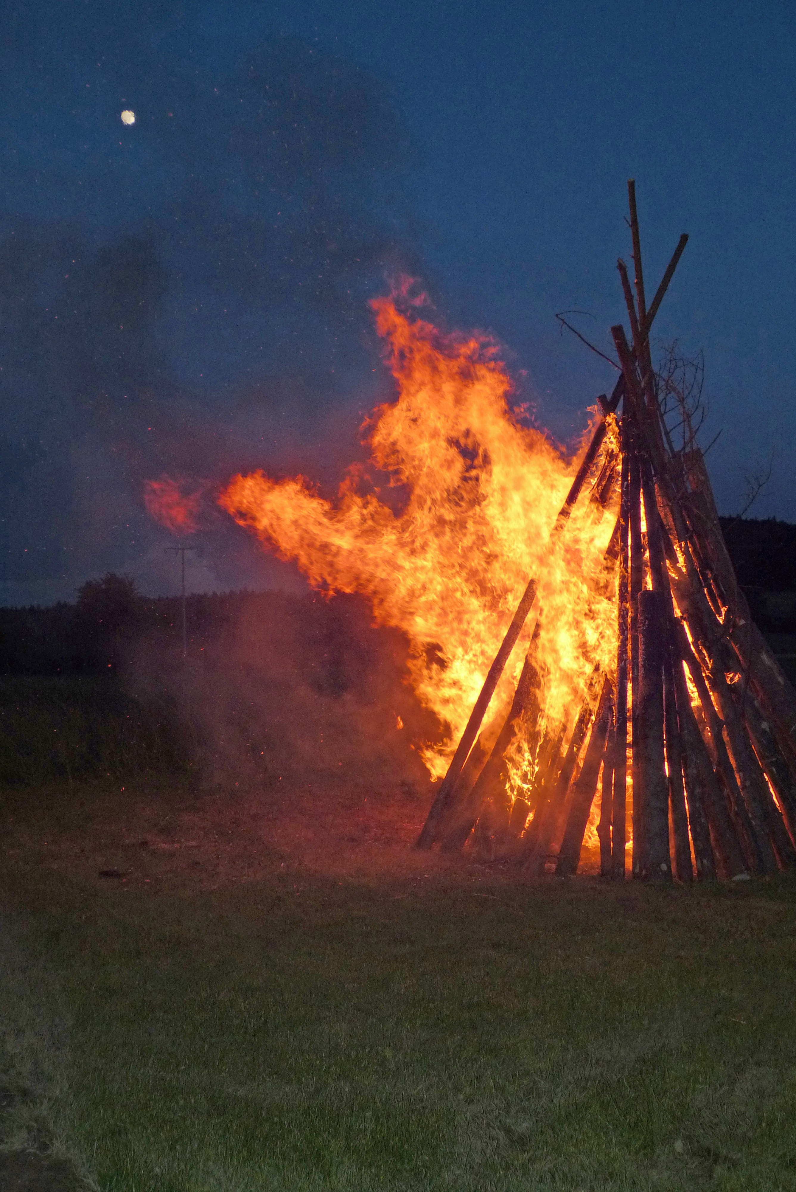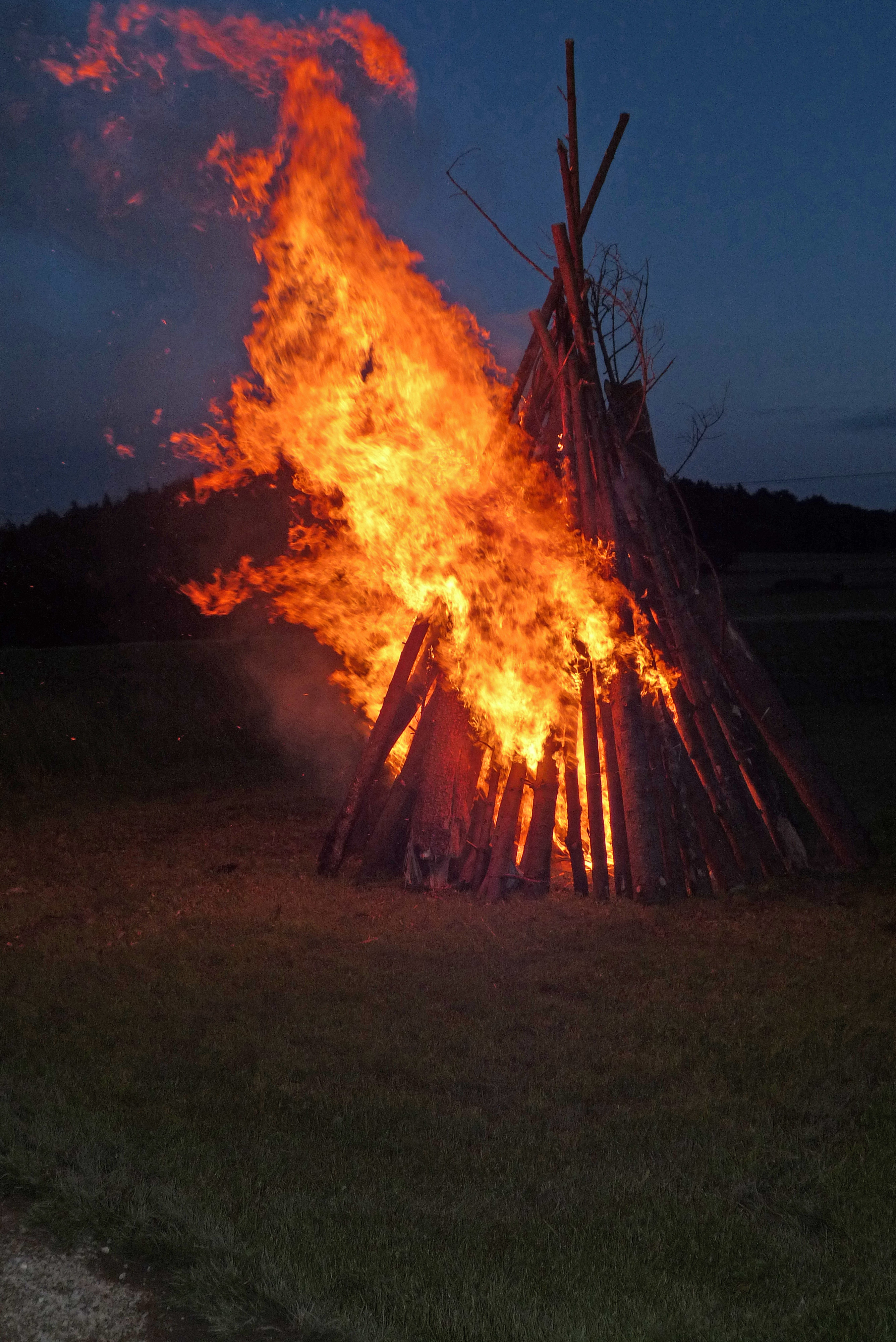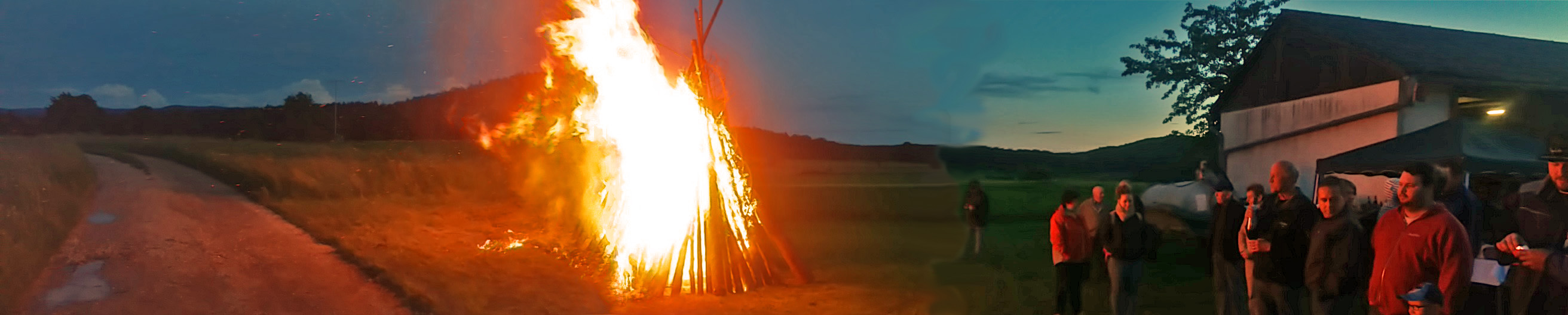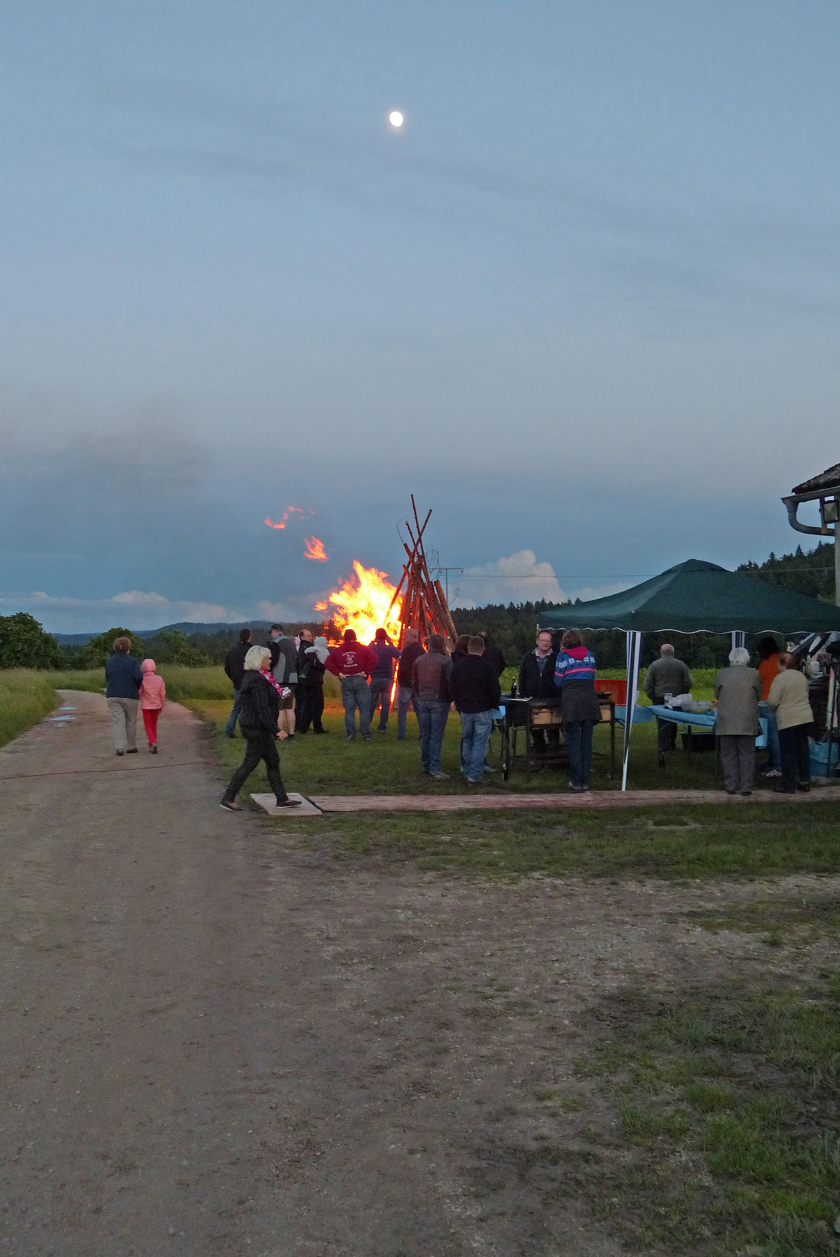 Sonnwendfeier in Bürtel Freitag 17. Juni 2016 Wir haben es wieder einmal, trotz der schlechten Wettervorhersagen, versucht, die Sonnwendfeier in Bürtel abzuhalten. Bis Mittag regnete es ununterbrochen und da hieß es abwarten, wie sich die Witterung bis zum Nachmittag entwickeln würde. Als die Helfer bei der Reiser Halle eintrafen, schien die Sonne. Die Aussicht schien gut zu sein und so wurde mit dem Aufbau begonnen. In weiser Voraussicht wurde die Halle ausgeräumt. Die Außentemperatur war zum Sitzen im Freien doch zu kühl. Aber kaum war man mitten im Aufbau, setzte um 16.00 h nochmals ein gewaltiger Regenguss ein. Appel Bernd sagte: “ Hätte es eine halbe Stunde früher so geschüttet, hätten wir die Veranstaltung abgesagt.” Der Regen aber hörte wieder auf und die Sonne ließ sich wieder sehen. So wurde weiter aufgebaut und der Holzstoß für das Sonnwendfeuer hergerichtet. Da die Stangen - die äußere Umhüllung des Feuers - zu nass waren, rückte Lett Sebastian kurzentschlossen mit gut einem Kubikmeter, oder mehr, trockenem, gespaltenem Meterholz an, das mittig wie für eine Feuerbestattung professionell aufgeschlichtet wurde. Dann wurden zeltmäßig rundherum die Stangen aufgestellt. Ab 18.00 h füllte sich die Halle. Die Fleißigen am Grill, der Kasse, der Essens- und Getränkeausgabe waren gerüstet. Für jeden Geschmack war was geboten. Angefangen von Bratwürsten, Steaks, Burger mit der entsprechenden Unterlage, über Obatzten und Käse war alles geboten.