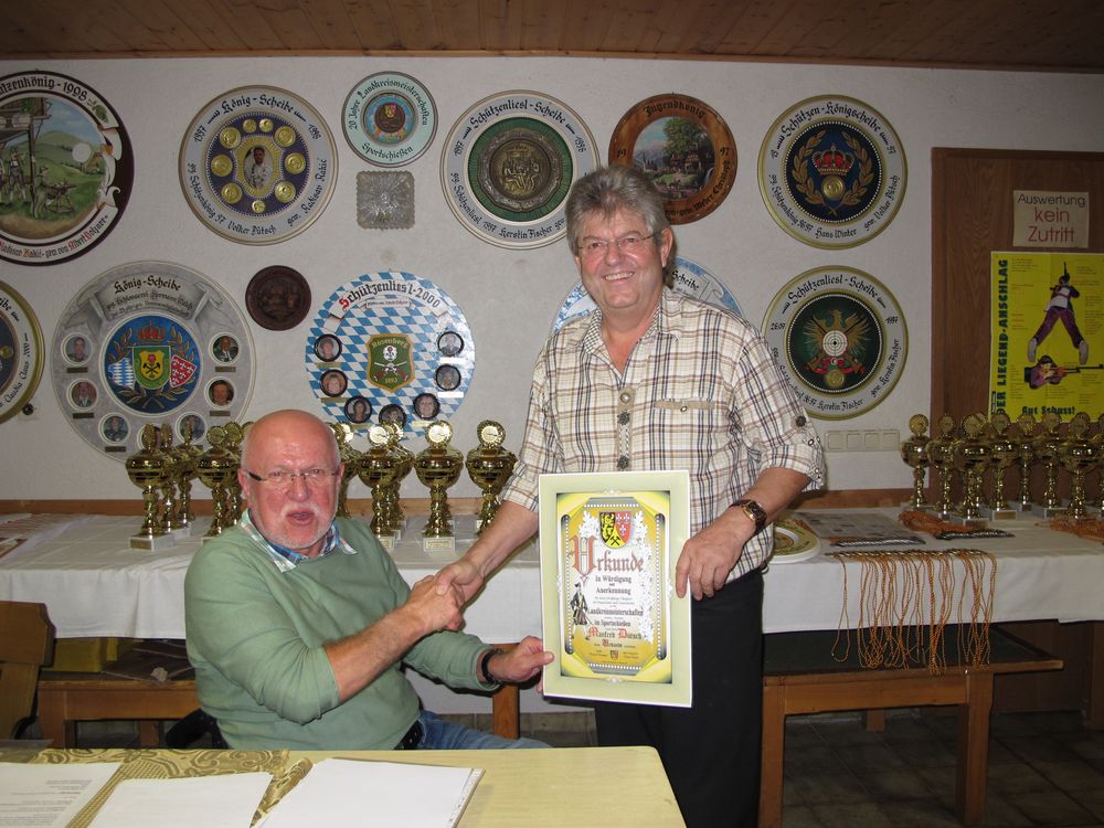 In seiner Rückschau erinnerte der Schützenmeister auch an die gesellschaftlichen Ereignisse des Vereins, wie dem beliebten Ostereierschießen, das 49 Schützen an den Stand brachte. Schlechtes Wetter ließ die Sonnwendfeier sozusagen ins Wasser fallen. Dafür gab es im letzten Jahr erstmals am 3.Oktober ein Saukopfessen in der Appel-Halle in Heuchling . Wer gern Saukopf isst, kann sich den Termin schon vormerken, denn der steht auch heuer wieder auf dem Programm. Die alljährliche Fronleichnamswanderung ging von Hirschbach zum Brunnenfest des Lehentaler Heimatvereins nach Lehenhammer. Auf dem Wege dorthin besichtigten die Schützen unter der Führung von Pauline Regler die heimischen Orchideen, vor allem den Frauenschuh, der gerade in voller Blüte stand.Bei der Nachtwanderung zum Ossinger fanden sich auch fast 40 Mitwanderer ein, wenn auch der Abstieg doch recht stürmisch und regnerisch war. Leider sank der Mitgliederstand von 83 vom Vorjahr auf jetzt 79, da es neben dem Tod von Friedrich Wirth auch noch vier Austritte gab und dem nur ein Eintritt gegenüber stand. Auch Kassier Hans Roth hatte ein Minus zu verzeichnen, es wurde aber dafür ein Laptop angeschafft. Oberschießleiter Georg Appel konnte von guten Erfolgen seiner Schützen berichten. Petra Stenzel, Pauline Regler und Georg Appel belegten bei der Gaumeisterschaft jeweils den ersten Platz, jeweils in ihrer Klasse. Desweiteren belegte Pauline Regler bei Landesmeisterschaftebenfalls den ersten Platz, der ihr eine Teilnahme an der Deutschen Meisterschaft einbrachte. Bei der Landkreismeisterschaft gab es einen 1. Platz von Michael Loos mit der Luftpistole in der Schützenklasse. Gute Erfolge erzielten auch die Teilnehmer am Gauranglistenturnier Johannes Appel, Georg Appel, Gerd Haller und Pauline Regler. Im Rundenwettkampf sicherte sich die Mannschaften ihren Klassenerhalt in der Bezirksliga bzw. die LP- Mannschaft in der Bezirksoberliga. Die LG 2 stieg von der A-Klasse in die Kreisliga auf und die LG 3 kam von der B in die A-Klasse. Jugendleiter Bernd Appel hat im letzten Jahr zum ersten Mal mit einigen Helfern am Ferienprogramm der Gemeinde Etzelwang ein Schießen mit dem Lasergewehr angeboten und wurde mit 14 Teilnehmern belohnt. Mit dem Lasergewehr können Jugendliche ohne Altersbeschränkung schießen. Auch die Ergebnisse seiner Jungschützen konnten sich sehen lassen. Bei der Landeskreismeisterschaft konnte die Jugend mit folgenden Platzierungen punkten: Mit der Luftpistole Schützenmeister Rudi Schwab zeichnete neben Edi Pickel auch Volker Keck aus, der es auf 25 Jahre Mitgliedschaft brachte. Im Jahre 2019 feiert der Schützenverein Silberdistel Neutras sein 50-jähriges Bestehen. Über das wie und in welchem Umfang wurde diskutiert, aber noch keine Entscheidung getroffen. Der Oberschießleiter möchte auch Werbung an dem neuen Sichtschutz im Schießstand anbringen, um die Vereinskasse etwas aufzubessern, außerdem sollte die Beleuchtung auf Vordermann gebracht werden. Auf der Anschaffungsliste für das kommende Jahr steht auch eine linke Griffschale für eine Luftpistole, um den Linksschützen gerecht zu werden. Ein neues Out-fit brauchen die Schützen ebenfalls. Dazu will Vereinsmitglied Rainer Siggelkow Farbmuster mitbringen, damit neue Shirts angeschafft werden können. Der Schützenmeister bedankte sich beim Ehrenschützenmeister Johann Zimmermann, der die Vereinshomepage betreut und immer mit den neuesten Daten füttert. .