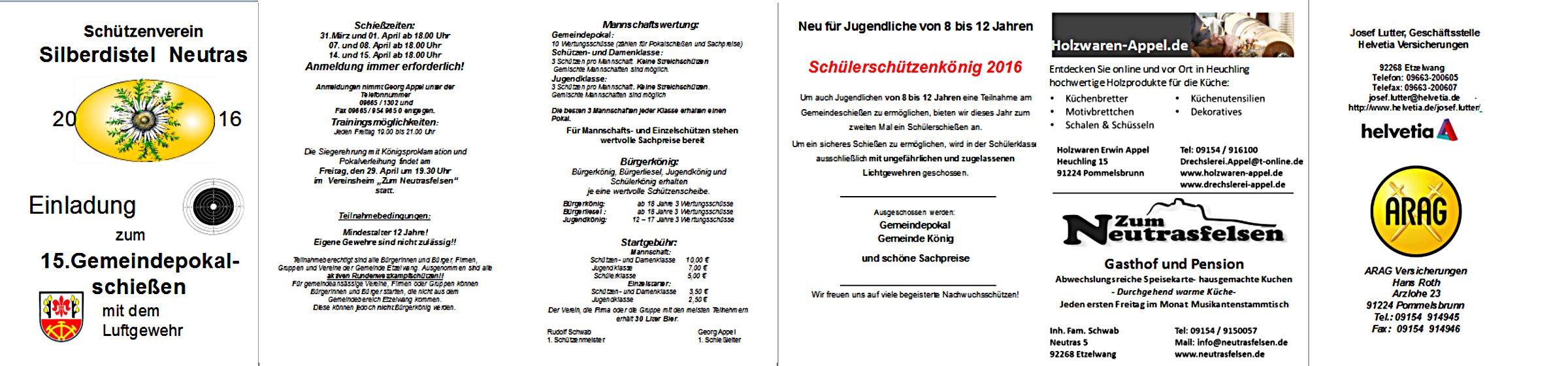 Ein besonderer Dank gilt den Sponsoren, ARAG Hans Roth, Helvetia Versicherung Lutter, Holzwaren Appel, Metzgerei u. Gastwirtschaft Dorn, Metzgerei Bayer, Megatec und Gasthof Zum Neutrasfelsen, durch deren Engagement ein solches Schießen erst möglich ist.