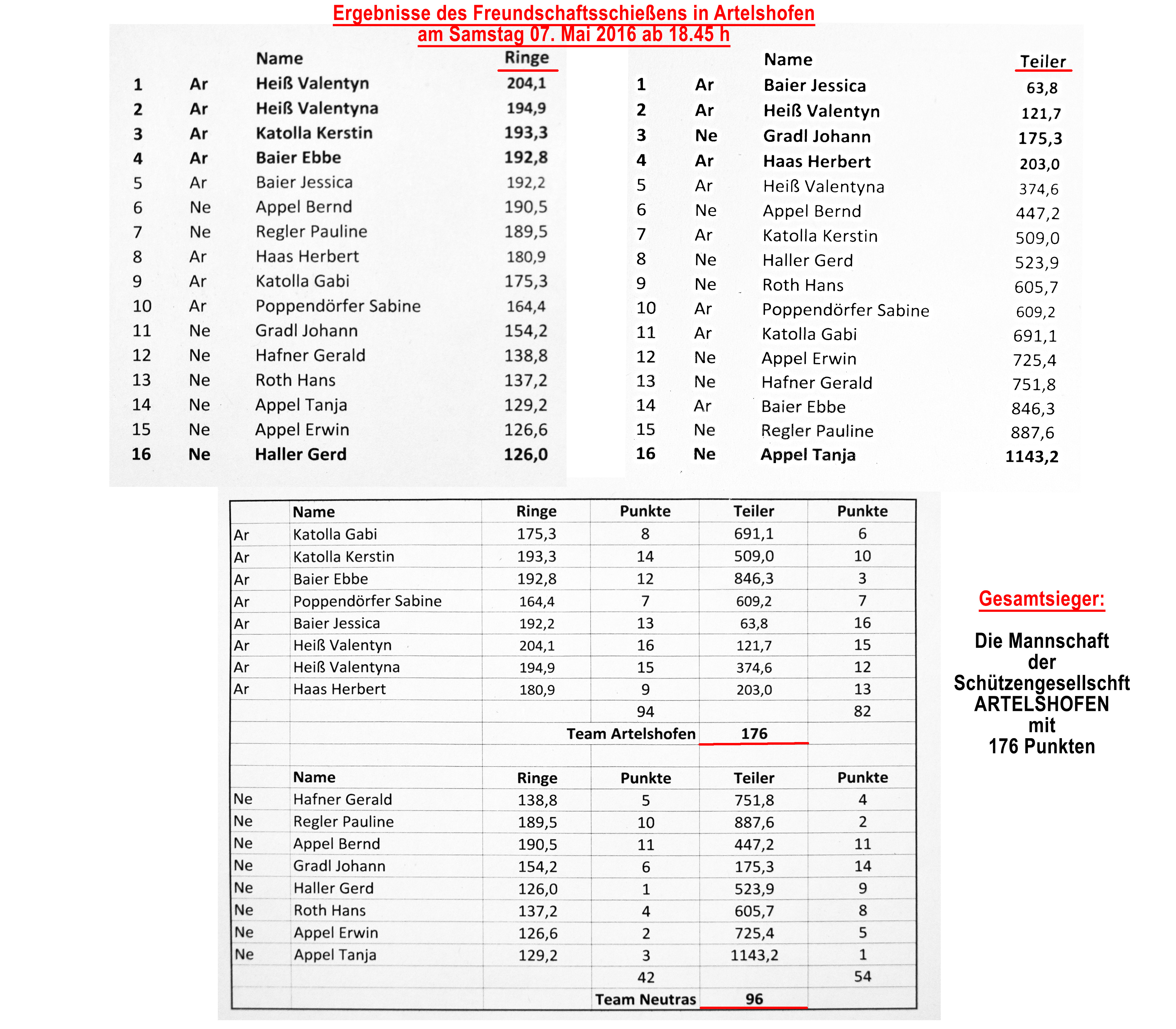 Freundschaftsschießen mit der Schützengesellschaft Artelshofen Samstag 07. Mai 2016 ab 18.45 h Nach verschiedenen Terminabsprachen ist es nun doch gelungen, dass wir mit den Schützen/innen der Schützengesellschaft 1930 Artelshofen einen passenden Termin für den Rückkampf des Freundschaftschießens von 2015 finden konnten. So trafen sich im Schützenheim „Beim Pechwirt“ in Artelshofen am Samstag am frühen Abend die Teilnehmer der beiden Vereine. Von jedem Verein gingen acht Teilnehmer an den Stand, um sich zu messen. Die Wertung erfolgte wiederum über eine Punkte-Wertung. Bei einer Serie von 20 Schuß wurden die erreichte Ringzahl und das beste Blattl in die Wertung übernommen. Nachdem es insgesamt sechzehn Teilnehmer waren, bekam der Schütze/ die Schützin mit dem höchsten Ringergebnis und Der-/ Diejenige mit dem besten Blattl die höchste Punktzahl von sechzehn Punkten. Die weiter Platzierten wurden dann mit jeweils einem Punkt weniger bewertet. Die Auswertung nahmen Schießleiter Eppe Baier/ Artelshofen und Jugendleiter Bernd Appel/ Neutras gemeinsam vor. An die vier Sieger bei der Ring- und bei der Blattlwertung, sowie an die/ den Letztplatzierte/n konnte Schießleiter Eppe Baier schöne Sachpreise überreichen. Er bedankte sich bei den Spendern dieser Preise. Den Mannschaftssieg konnten unsere Schützen/innen den mit hervorragenden Leistungen glänzenden Teilnehmern/innen von Artelshofen in keiner Weise streitig machen. Das Team Artelshofen hatte mit 176 Punkten, gegenüber 96 Punkten des Teams Neutras, ganz klar die Nase vorne.