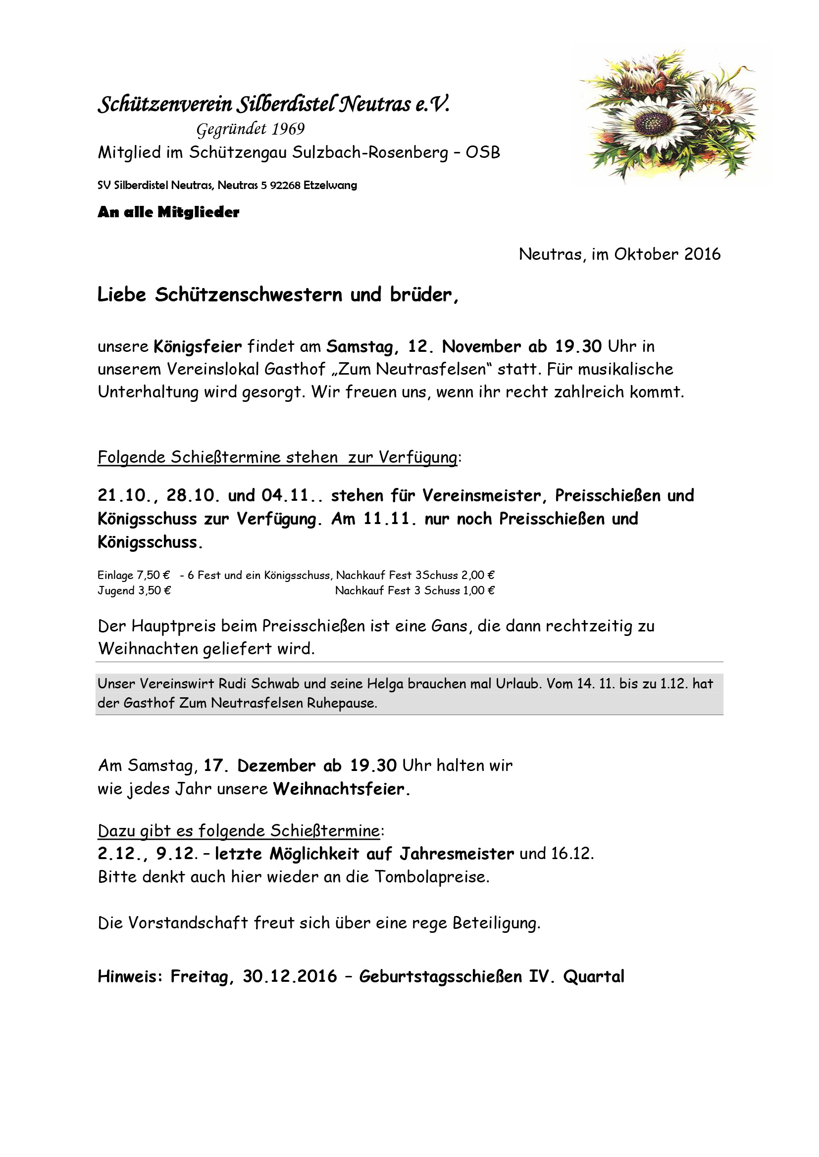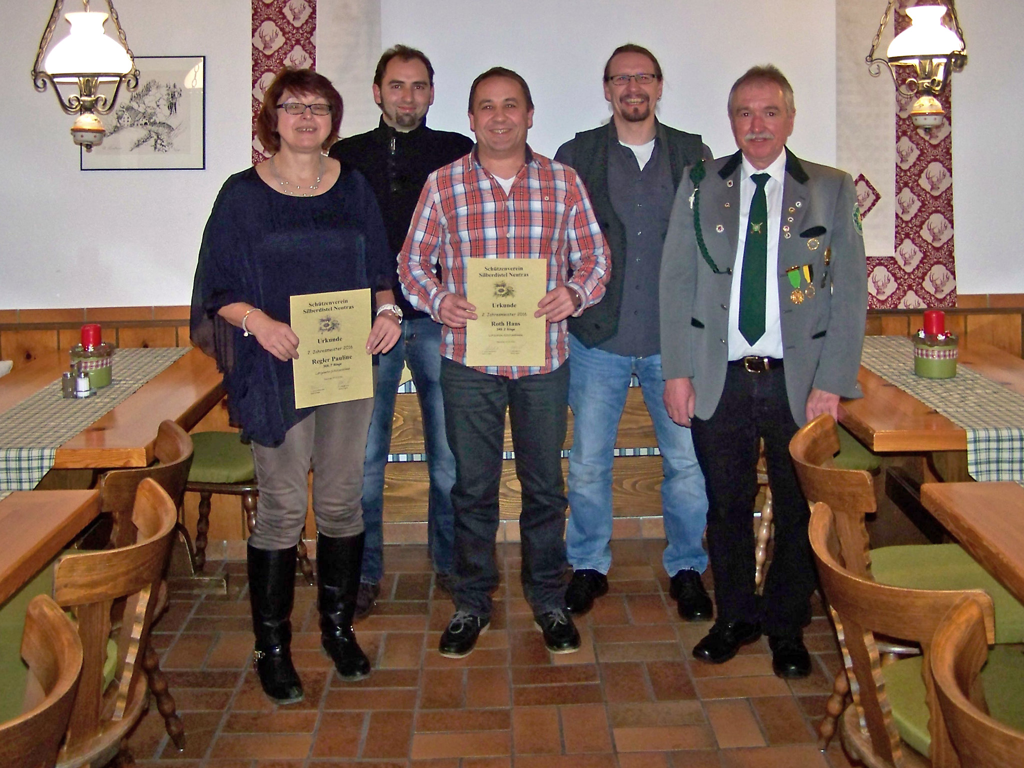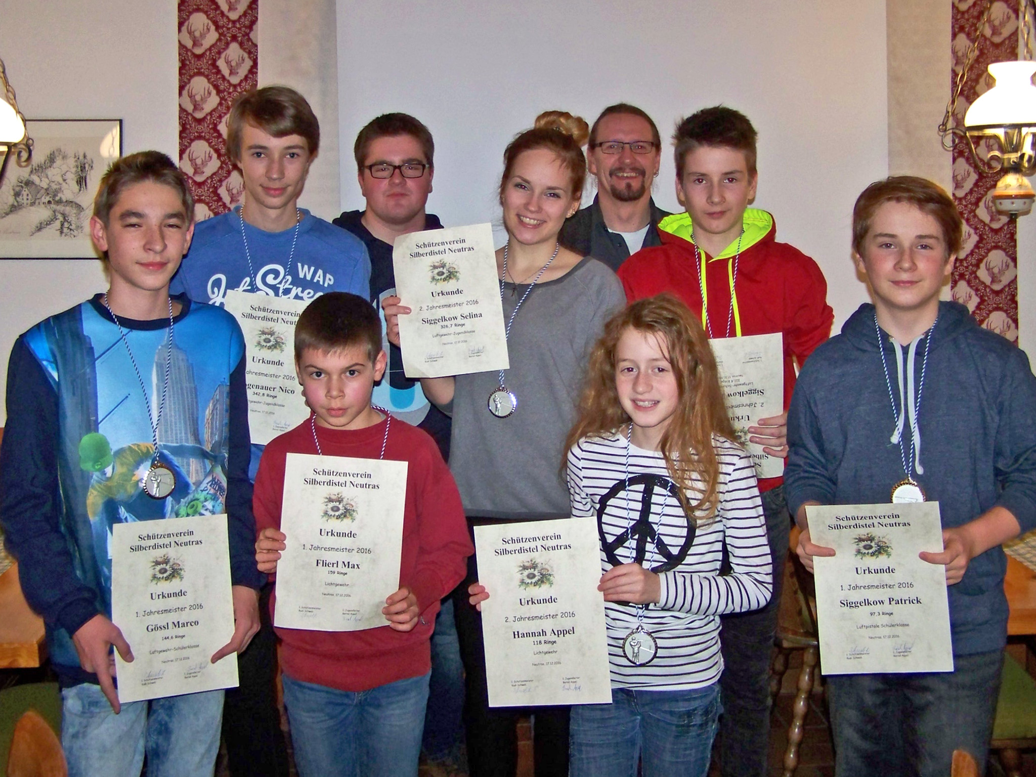 Königsfeier und Ehrung der Vereinsmeister Samstag 12. November 2016 Dass die Königswürde bei den "Silberdistel"-Schützen von Neutras in der Schützen- und Jugendklasse in die Hand einer Familie fielen, hatte es in der Vereinsgeschichte bisher noch nicht gegeben. Bei der Königsfeier im Gasthof "Zum Neutrasfelsen" wurden die Gewinner des Königspreisschießens, die Jahresmeister und die neuen Würdenträger bekannt gegeben. Beim Königspreisschießen in der Jugendklasse war Siggelkow Selina ihren Kameraden mit einem 22 Teiler klar überlegen und sicherte Beim Königspreisschießen in der Schützenklasse war der erste Preis wieder ein „tierischer“. Die Weihnachtsgans sicherte sich Kassier Roth Hans mit einem 46 Teiler. Die Appel-Brüder, Jugendleiter Bernd und Schießleiter Georg, schlossen sich mit Platz zwei ( 62 Teiler ) und drei ( 104 Teiler ) in dieser Reihenfolge an. Bei der Vereinsmeisterschaft in der Disziplin Schützenklasse Luftgewehr unterschieden sich die Erstplatzierten nur um wenige Ringe. Mit 372 Ringen setzte sich Gohl John Oliver vor seine Verfolger Appel Bernd ( 370 Ringe ) und Regler Pauline ( 369 Ringe ). Die Beteiligung an der Vereinsmeisterschaft bei den Luftpistolenschützen war sehr gering. Erster Vereinsmeister wurde Loos Michael mit beachtlichen 372 Ringen. Ihm folgten auf die Plätze zwei und drei Kassier Roth Hans ( 355 Ringe ) und Schießleiter Appel Georg ( 332 Ringe ). Jugendleiter Bernd Appel konnte in der Luftgewehr Schülerklasse Siggelkow Fabian mit 101 Ringen als Vereinsmeister auszeichnen. In der Luftgewehr Jugendklasse wurde Nico Vogenauer Erster mit 351 Ringen und Kilian Reif Zweiter mit 324 Ringen. Den dritten Platz belegte Siggelkow Selina mit 313 Ringen. Den ersten Platz in der Luftpistole Schülerklasse belegte Siggelkow Patrick mit 97 Ringen. In der Luftpistole Jugendklasse war mit 334 Ringen Gössl Mario auf Platz eins. Mit dem Lichtgewehr auf Platz eins kam mit 77 Ringen Flierl Max gefolgt von Appel Hannah mit 75 Ringen. Für die Jungschützen gab es Pokale und die Schützenklasse wurde mit Medaillen ausgezeichnet. In der Jugendklasse löste Siggelkow Selina den letztjährigen Jugendkönig Vogenauer Nico mit einem 199 Teiler ab. Ihr stehen Gössl Mario ( 347 Teiler ) und Vogenauer Nico ( 597 Teiler ) als ihre Ritter zur Seite. “ Der neue Schützenkönig in der Schützenklasse freut sich bestimmt über diesen Titel“, das Mit Akkordeon und Tuba unterhielten Andreas und Johannes Appel, an der Gitarre begleitet von Zorn Hellmut, die Schützen mit bester Musik beim gemütlichen Beisammensein.