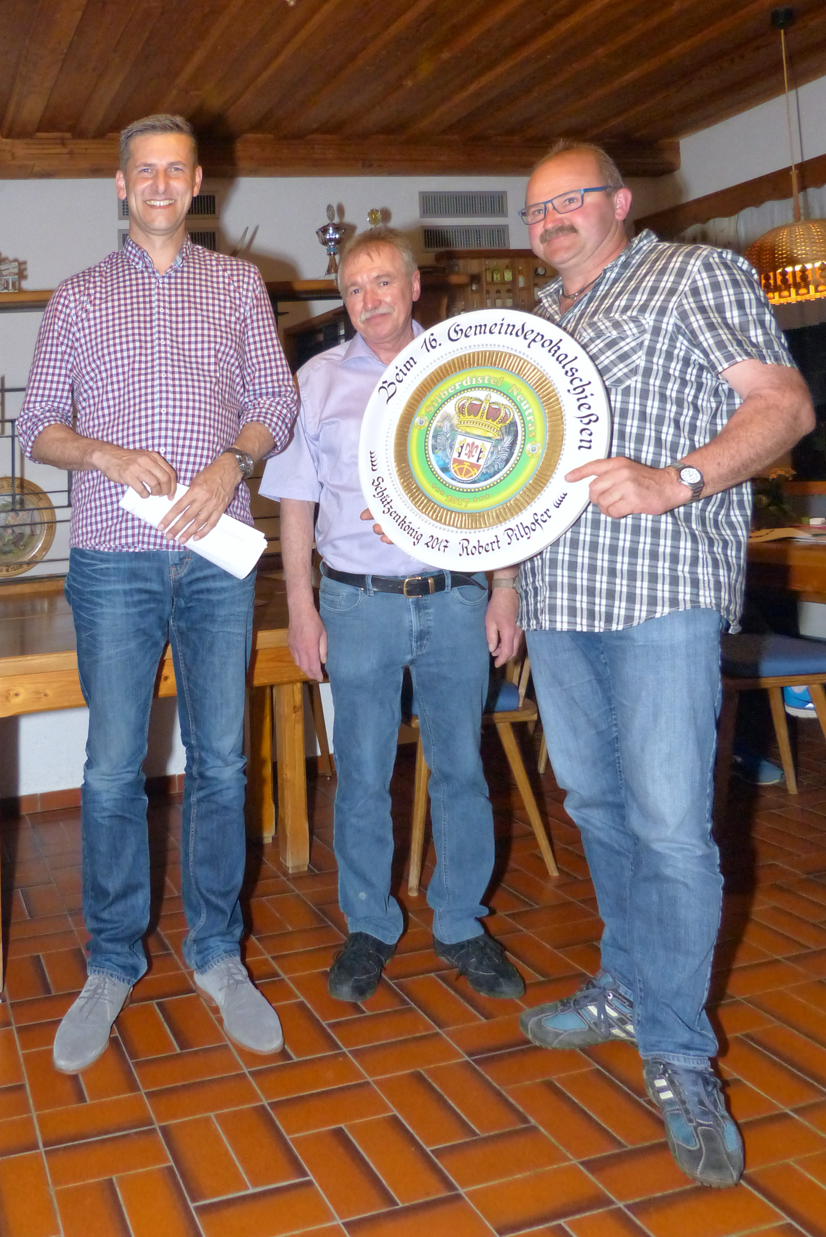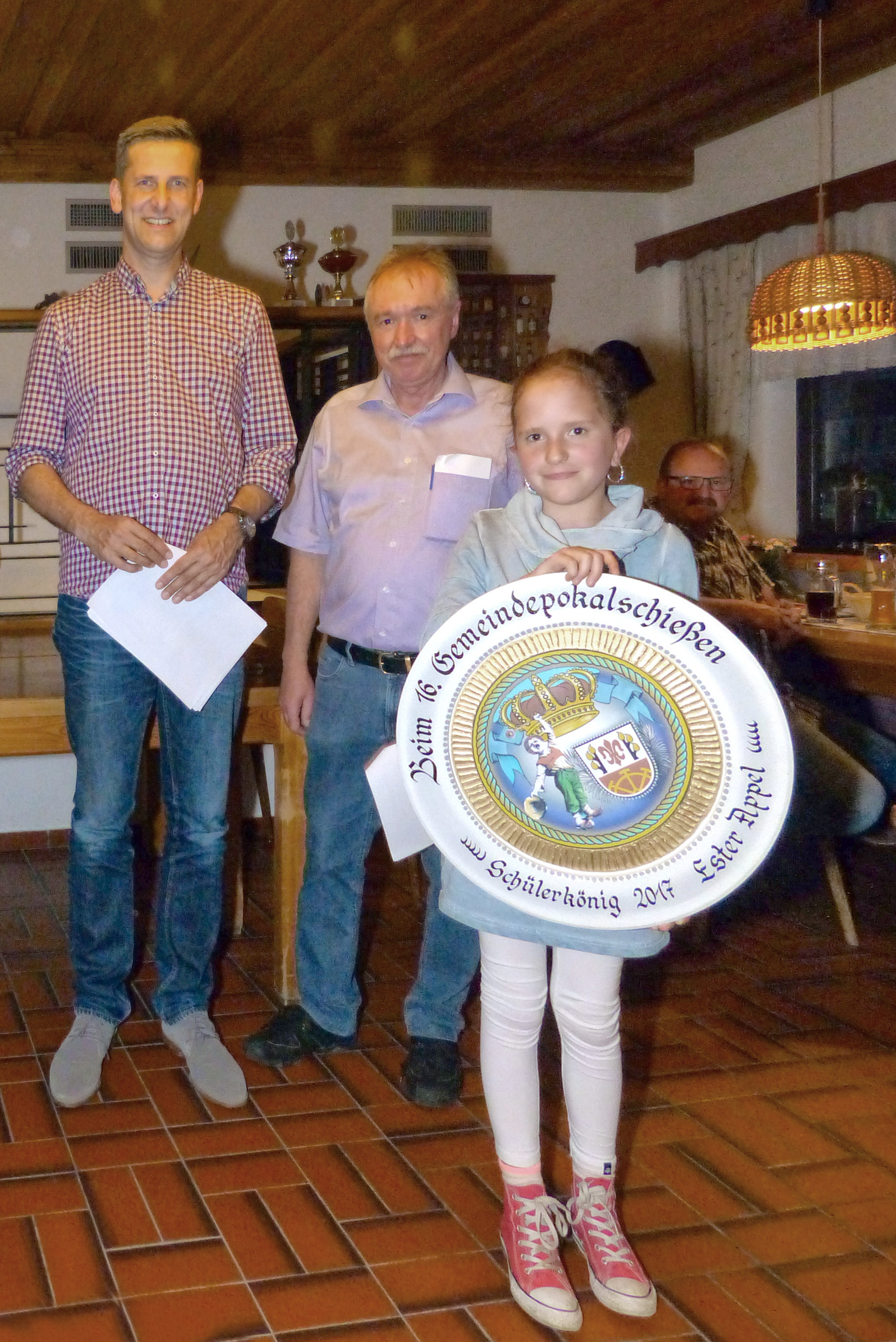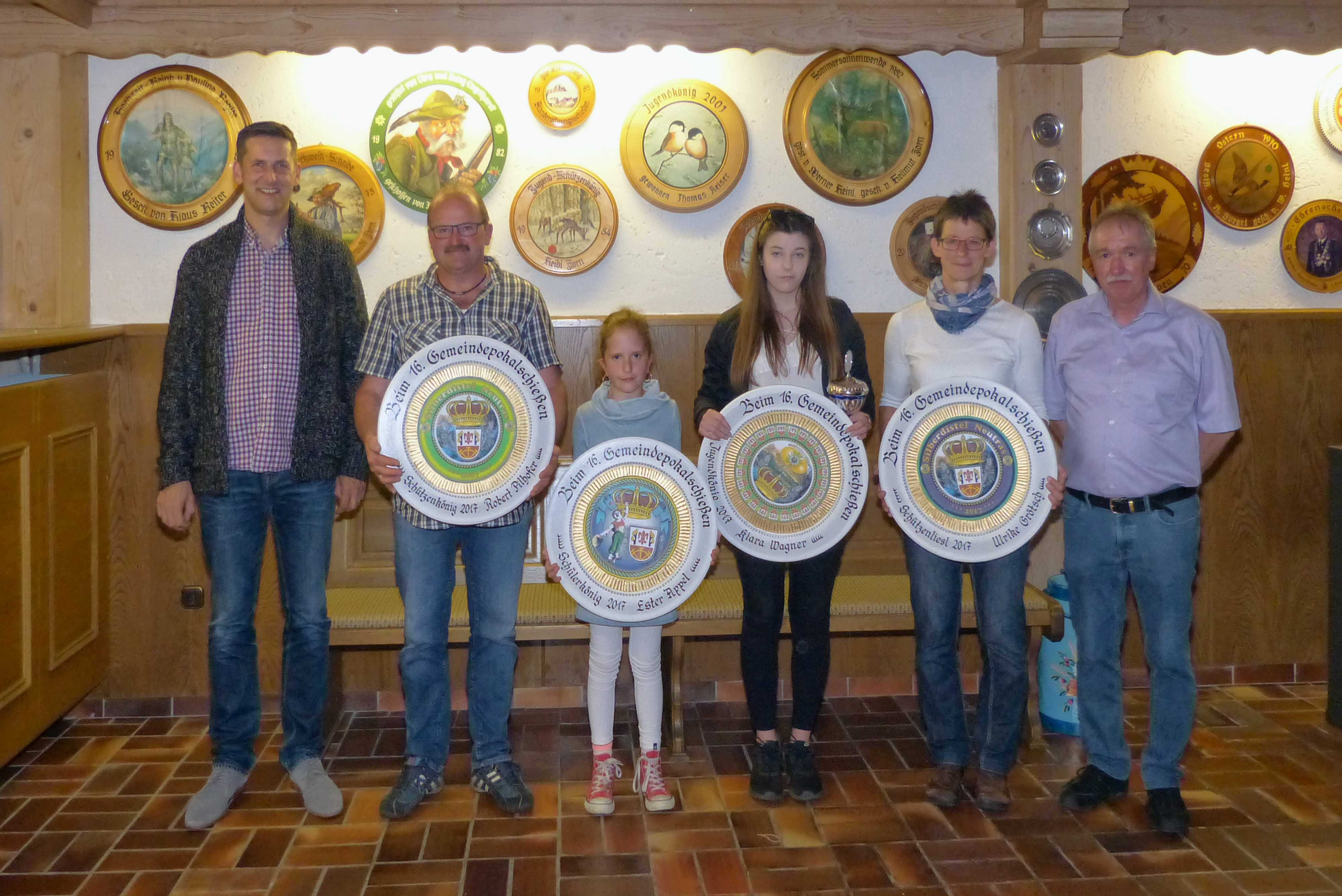 Aus drei Teilnehmern/innen, die zehn Wertungsschüsse abgeben mussten, bestand jeweils eine Mannschaft beim Schießen auf den Gemeindepokal. Gewertet wurde der beste Teiler aus der Zehnerserie, addiert mit der fehlenden Ringzahl auf die höchstmögliche Ringzahl von einhundert. Die Summe daraus ergab die Zahl der Punkte. Die drei erstplatzierten Mannschaften in jeder Klasse erhielten einen Pokal. Diese Pokale stifteten ARAG Hans Roth, HELVETIA Versicherung Lutter und MEGATEC Pirner.