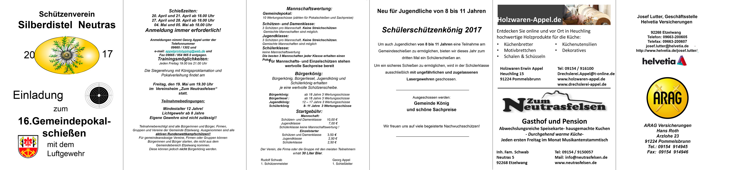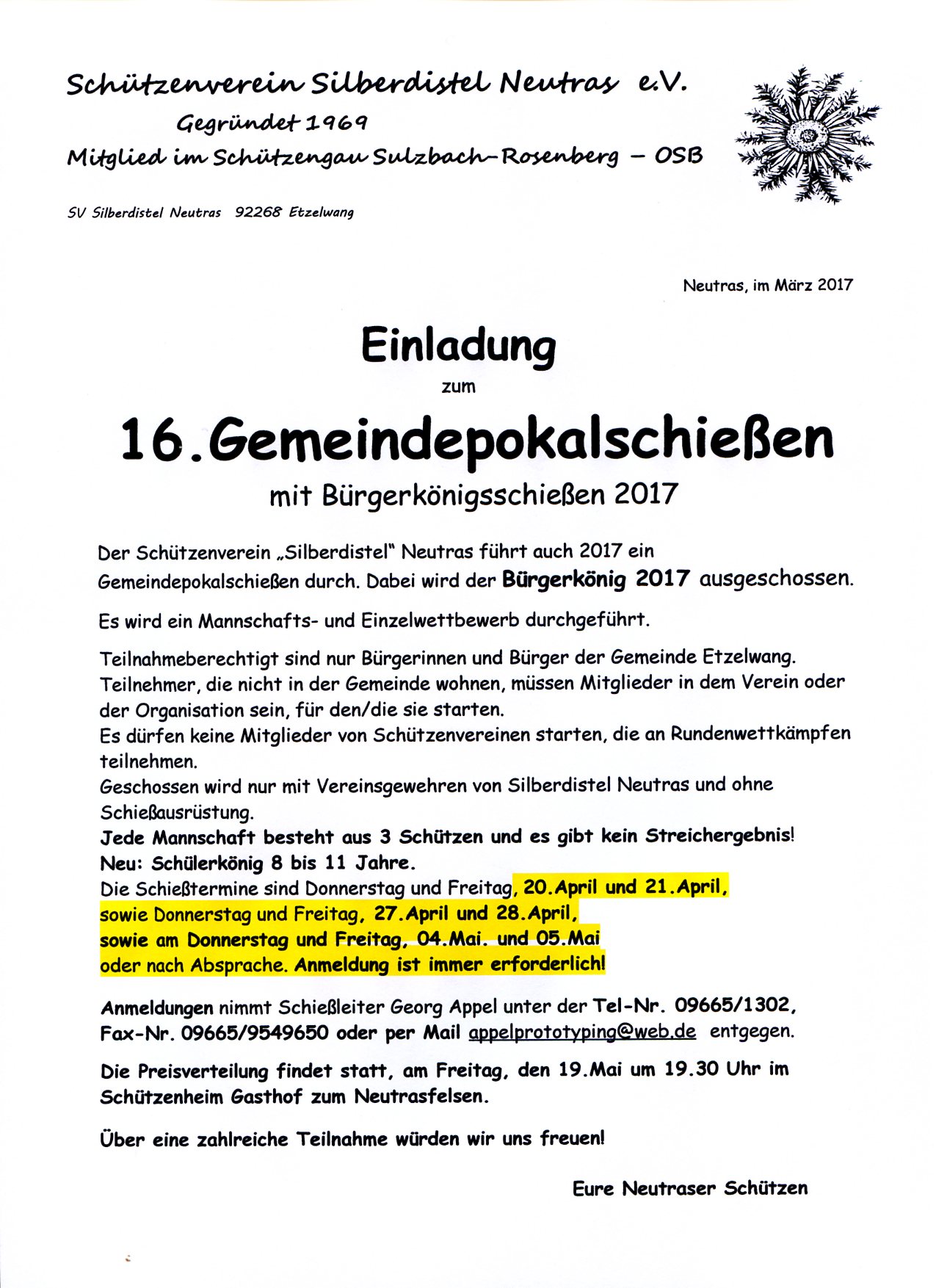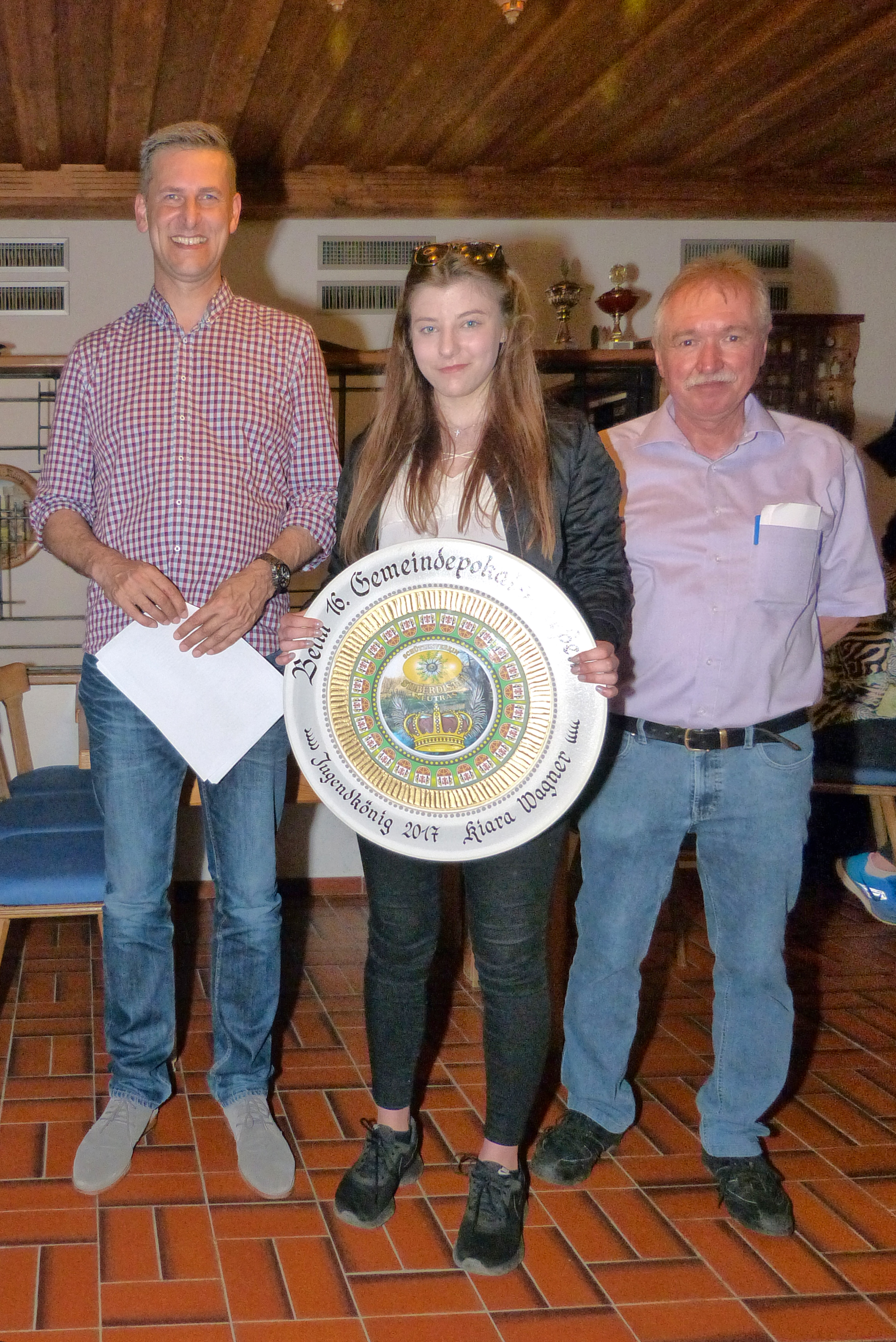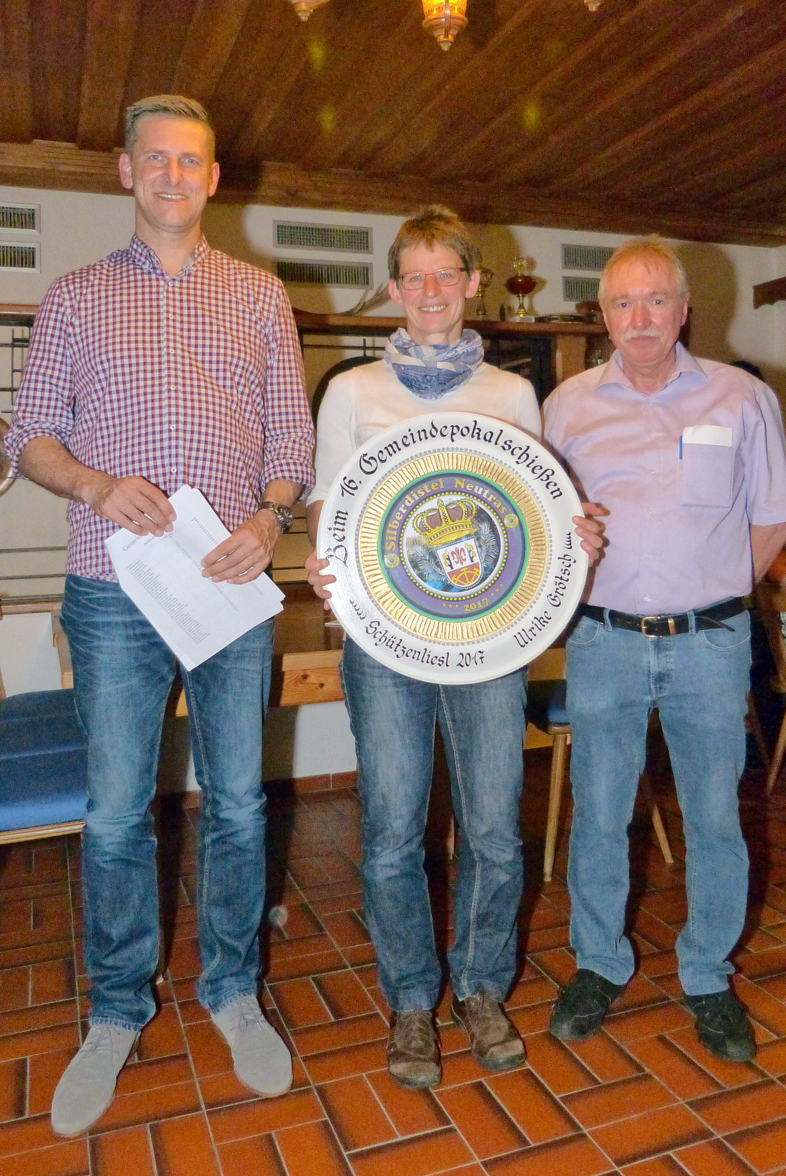 Aus drei Teilnehmern/innen, die zehn Wertungsschüsse abgeben mussten, bestand jeweils eine Mannschaft beim Schießen auf den Gemeindepokal. Gewertet wurde der beste Teiler aus der Zehnerserie, addiert mit der fehlenden Ringzahl auf die höchstmögliche Ringzahl von einhundert. Die Summe daraus ergab die Zahl der Punkte. Die drei erstplatzierten Mannschaften in jeder Klasse erhielten einen Pokal. Diese Pokale stifteten ARAG Hans Roth, HELVETIA Versicherung Lutter und MEGATEC Pirner.
