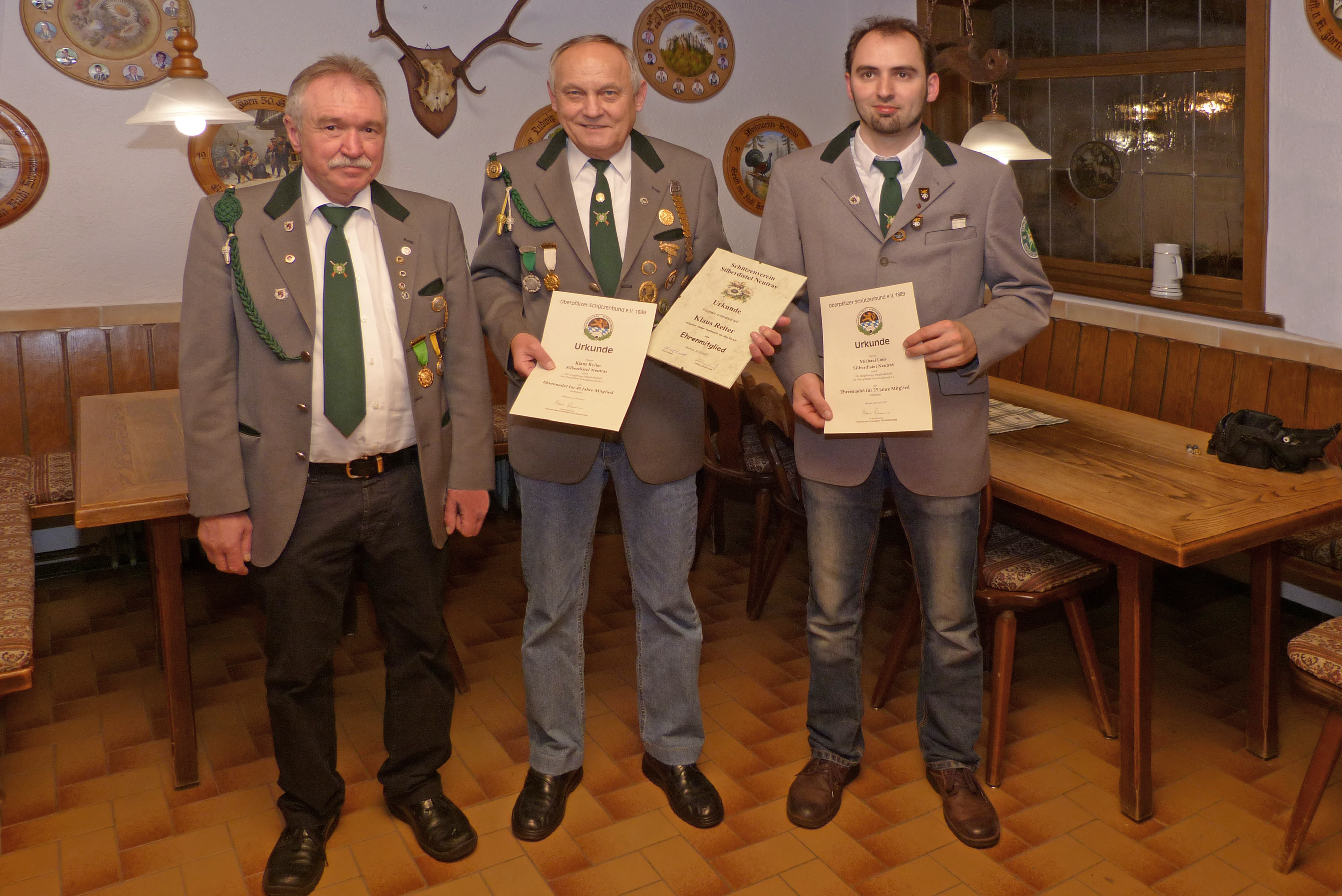Beim Punkt Ehrungen wurde Klaus Reiter der Versammlung zur Ernennung als Ehrenmitglied vorgeschlagen. Klaus war lange Jahre erfolgreich als aktiver Schütze und in der Vorstandschaft tätig. Die Versammlung stimmte der Ernennung einstimmig zu. Schützenmeister Rudi Schwab überreichte Klaus Reiter die Ernennungsurkunde und bedankte sich für sein Engagement. Für 25-jährige Mitgliedschaft im OSB konnte der Schützenmeister „Das Ehrenzeichen für langjährige Mitgliedschaft im OSB in Silber“ an folgende Mitglieder überreichen: 2. Schützenmeister Loos Michael und Loos Matthias. Für 40-jährige Mitgliedschaft überreichte er das Ehrenzeichen in Gold an Klaus Reiter.