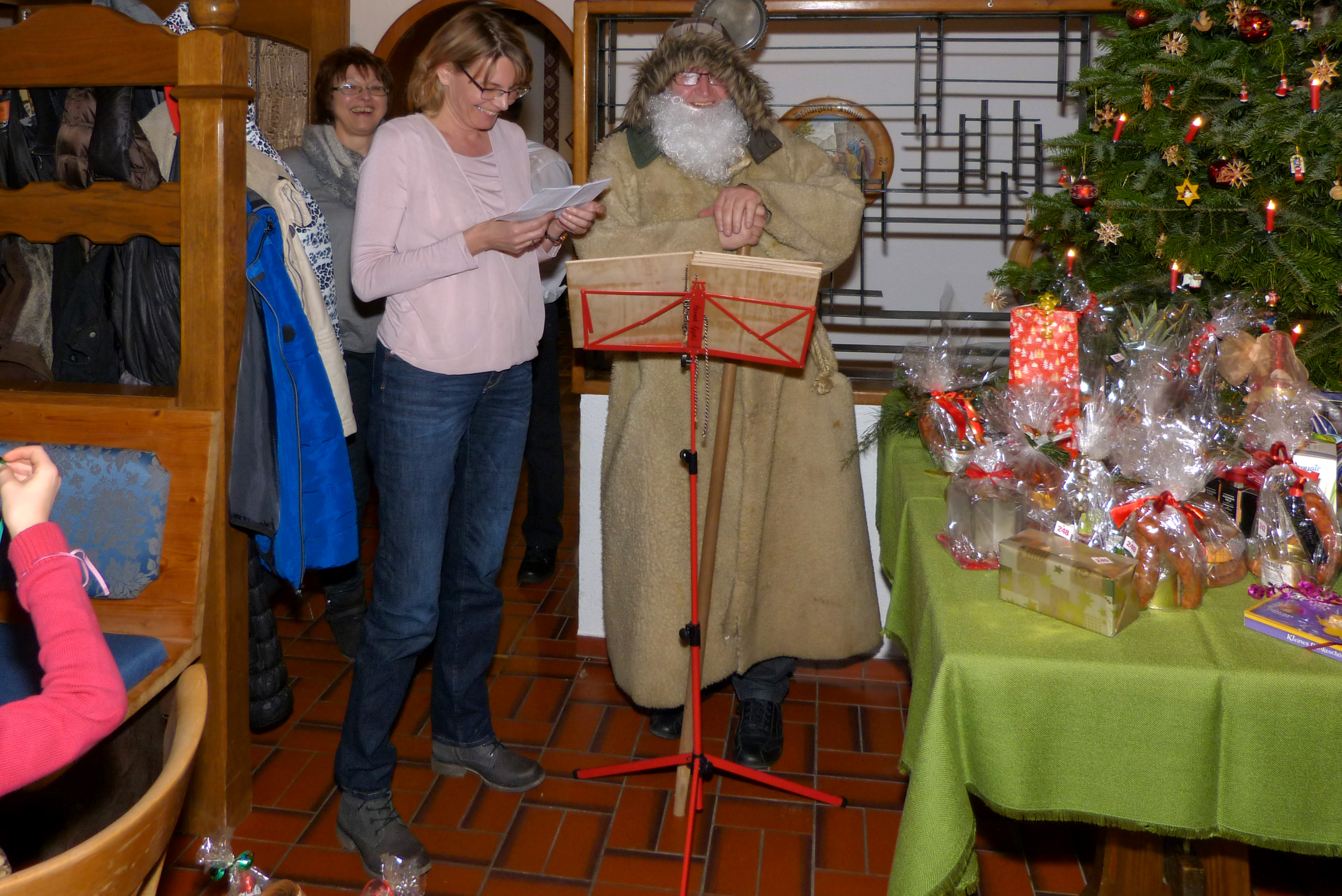 Nach diesem Medaillen- und Urkundensegen kommt der besinnliche Teil des Abends, auf den Johannes und Andreas Appel musikalisch einstimmen. Zwischen den Musikstücken lesen Irmgard und Renate humorvolle Geschichten vor, die sich im Umfeld des Weihnachtfestes abspielten. Dann hört man auch schon den Nikolaus, oder besser bezeichnet, den Rumpeldammer hereinpoldern. Der hat wieder in seinem