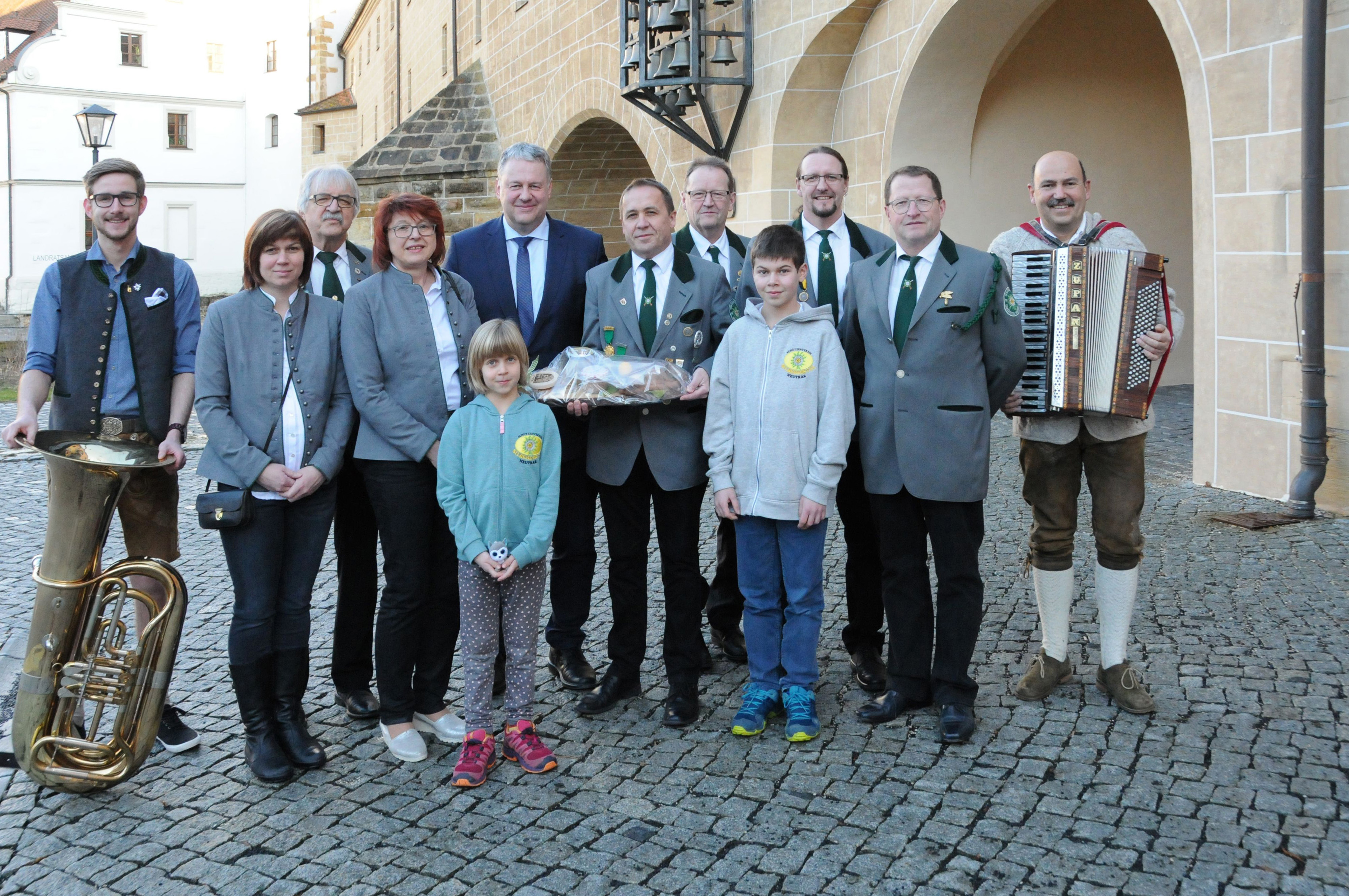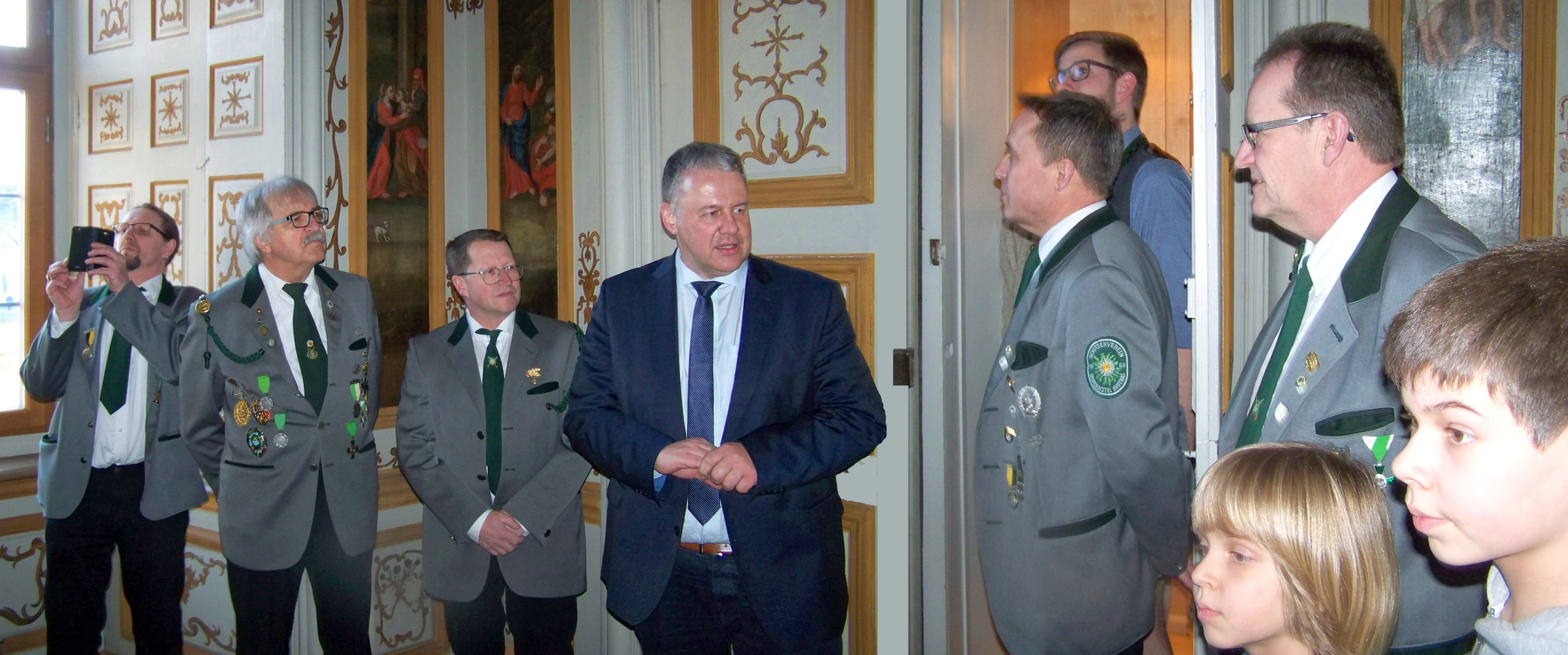 In der Eingangshalle empfängt uns der Pressemann des Landrats, Herr Schröter Michael. Die Stücke unserer beiden Musikanten klingen in der Halle gewaltig. Pünktlich um 17:00 Uhr begrüßt uns der Landrat. Roth Hans begrüßt ihn und trägt die offizielle Patenschaftsbitte vor. Er überreicht das Patengeschenk; ein von Appel Erwin mit dem Landkreiswappen versehenes Holzbrotzeitbrett, das mit verschiedenen Köstlichkeiten bestückt ist. Dann gehen wir zum „Fotoshooting“, das Herr Schröter vornimmt, in den Landratsamtshof. Danach geht es in den ersten Stock des Hauses, wo die Räume des Landrats liegen. Herr Reisinger zeigt uns seinen Arbeitsbereich und die Schlosskapelle, die unmittelbar an sein Arbeitszimmer anschließt. Sie ist ein Überbleibsel des ehemaligen Herrschersitzes der Wittelsbacher. Von der Terrasse aus haben wir einen Blick auf die Vils und den Ring.
