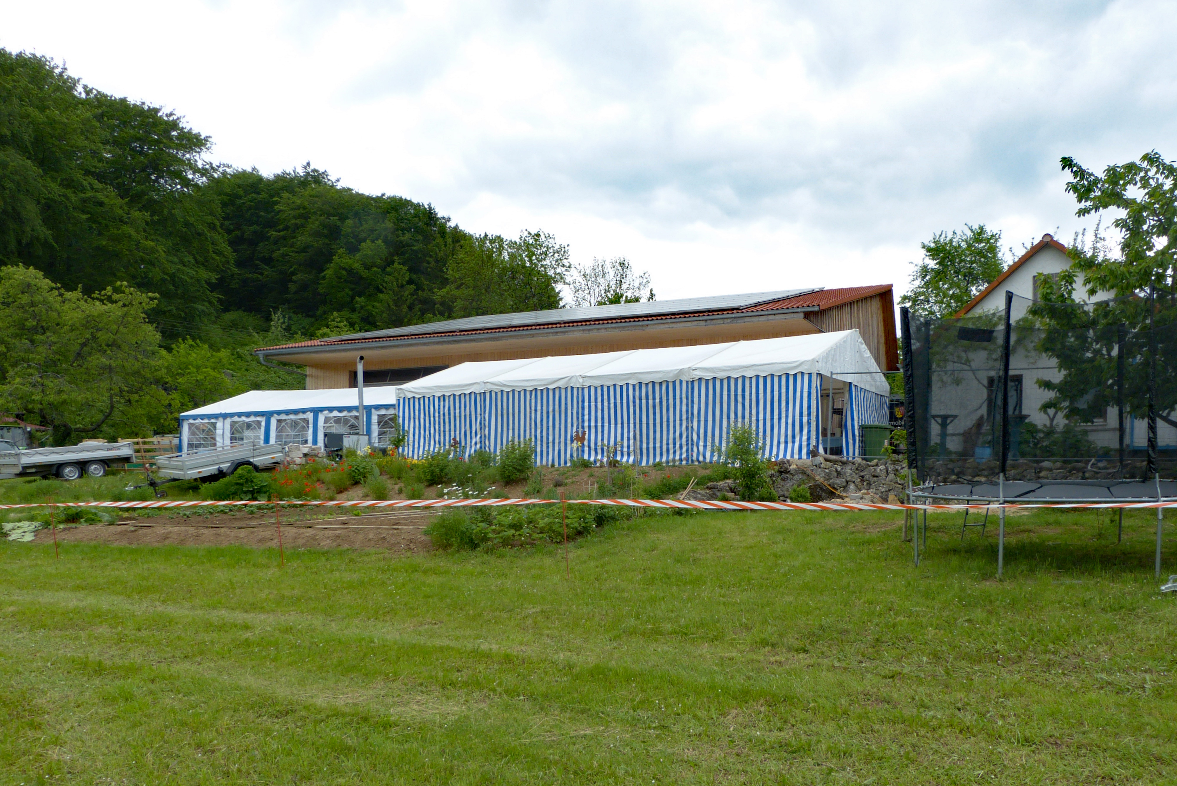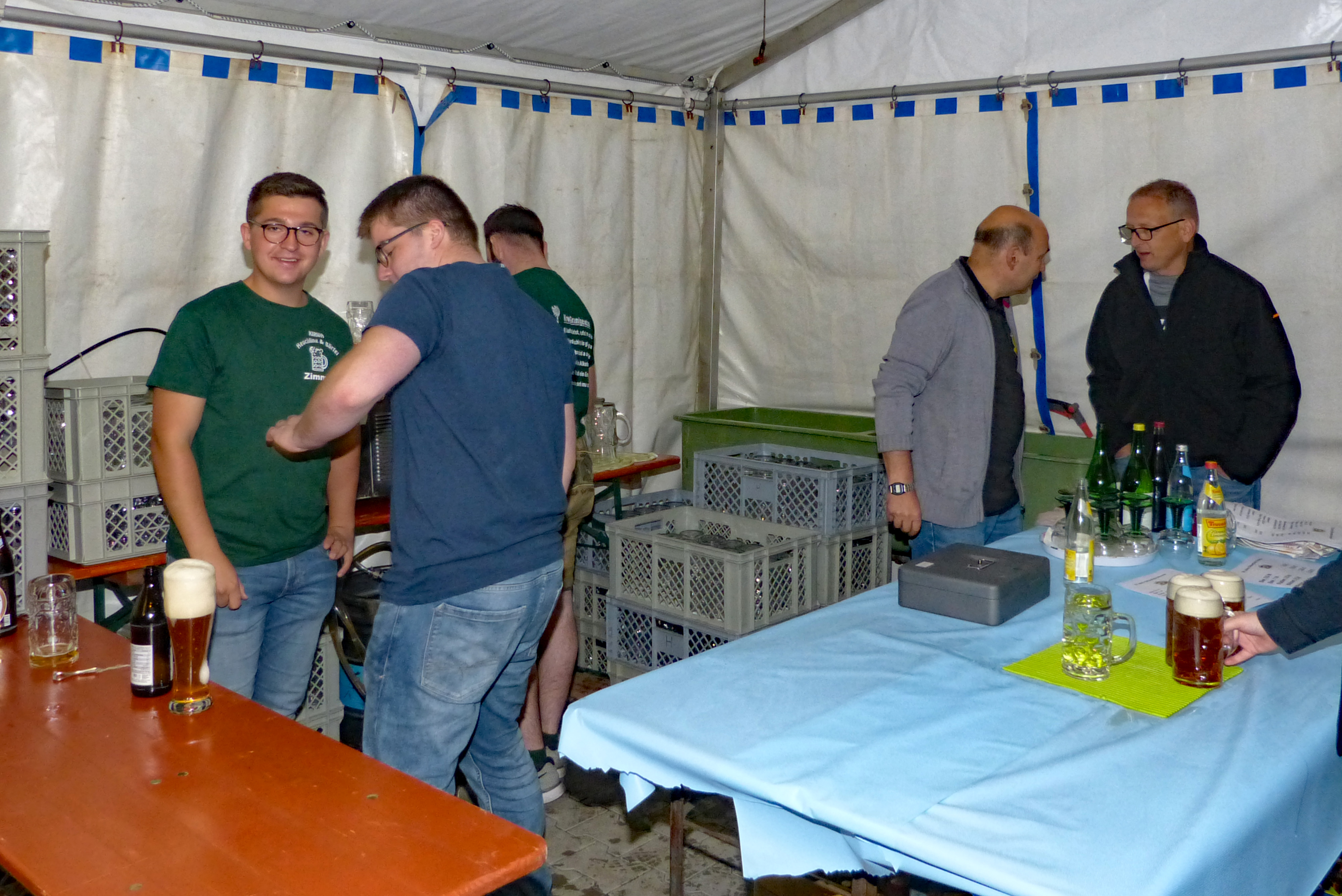 Ab Montag 27. Mai heißt es für die Aktiven schon wieder „Ran an die Arbeit“. Der Aufbau für die zwei Festage am 29. und 30. Mai in der Appel-Halle in Heuchling steht auf dem Programm. Im Vorfeld haben schon einige fleißige Helfer mit Erwin die Halle ausgeräumt. Jetzt ist bis Mittwoch Nachmittag angesagt: Halle sauber machen, Bühne aufbauen, Fenster putzen, Herbeischaffen von: Clo-Wagen, Tische und Bänke, Schankanlage, Kühlwagen,Geschirrmobil vom Kreisbauhof Gailoh, Grills, Stehtische, Zelt der Feuerwehr Hubmersberg, Getränke, Essen und, und , und..., dann das Aufstellen der Zelte und das Bestücken derselben. Alles ist mit Strom-, Wasser- und Abwasserleitungen zu versorgen. Die Stromversorgung nehmen die beiden „Stromer“ Sebastian Lett und Gerald Hafner verantworlich und kompetent in die Hände. Das Barzelt entsteht souverän unter der Leitung von Sebastian und Martin Schmidt. Das Versorgungszelt, gemietet von der Brauerei Heldrich, Edelsfeld entsteht ebenso probemlos unter der Anleitung des Zeltmeisters Wolf Helmut. Das Wetter hält sich dabei mit dem Regen einigermaßen in Grenzen.