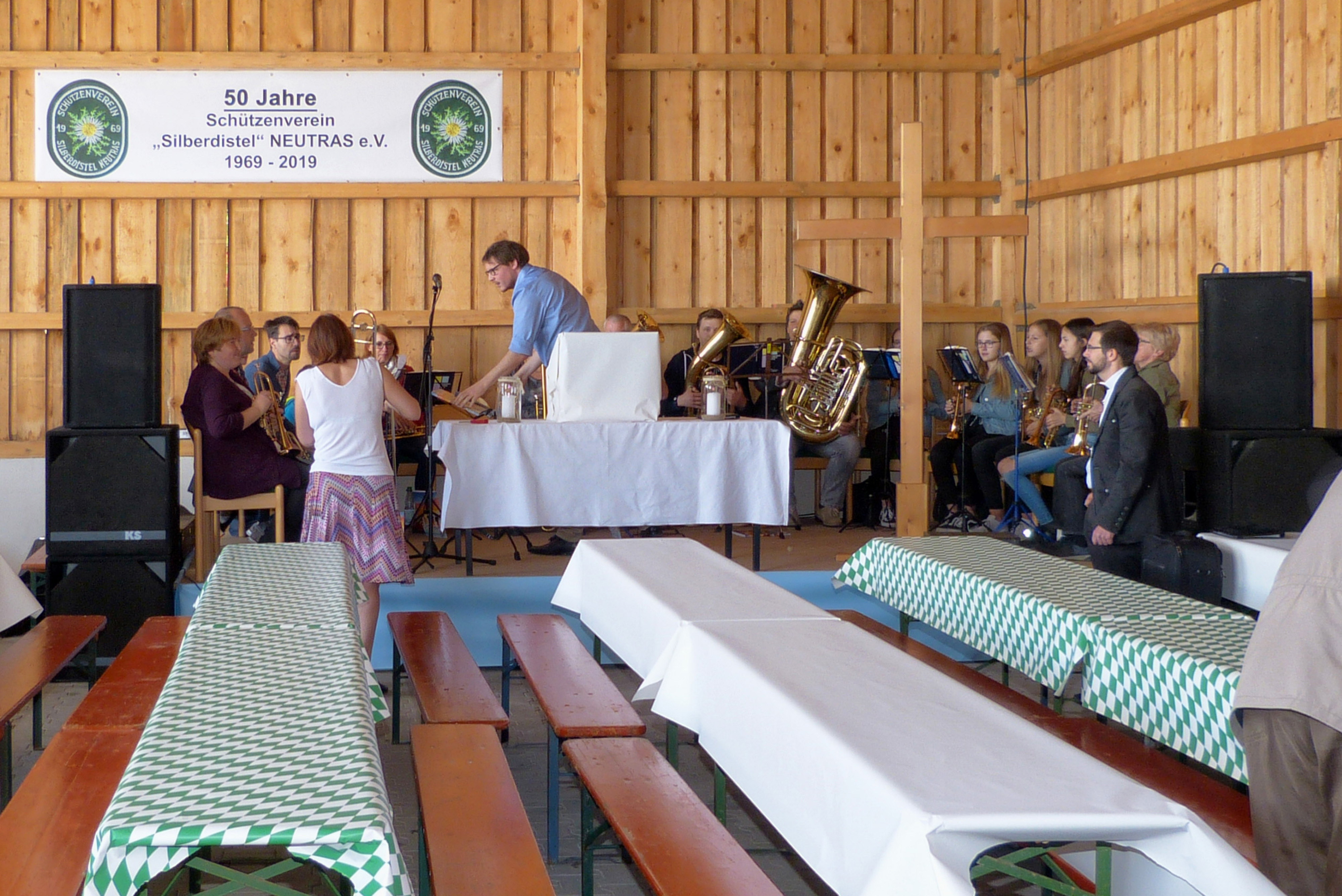 In der Zwischenzeit ist die elf Mann starke Feuerwehrkapelle eingetroffen, die schwungvoll aufspielt. Sie wechselt zwischen der Halle und dem Freigelände.