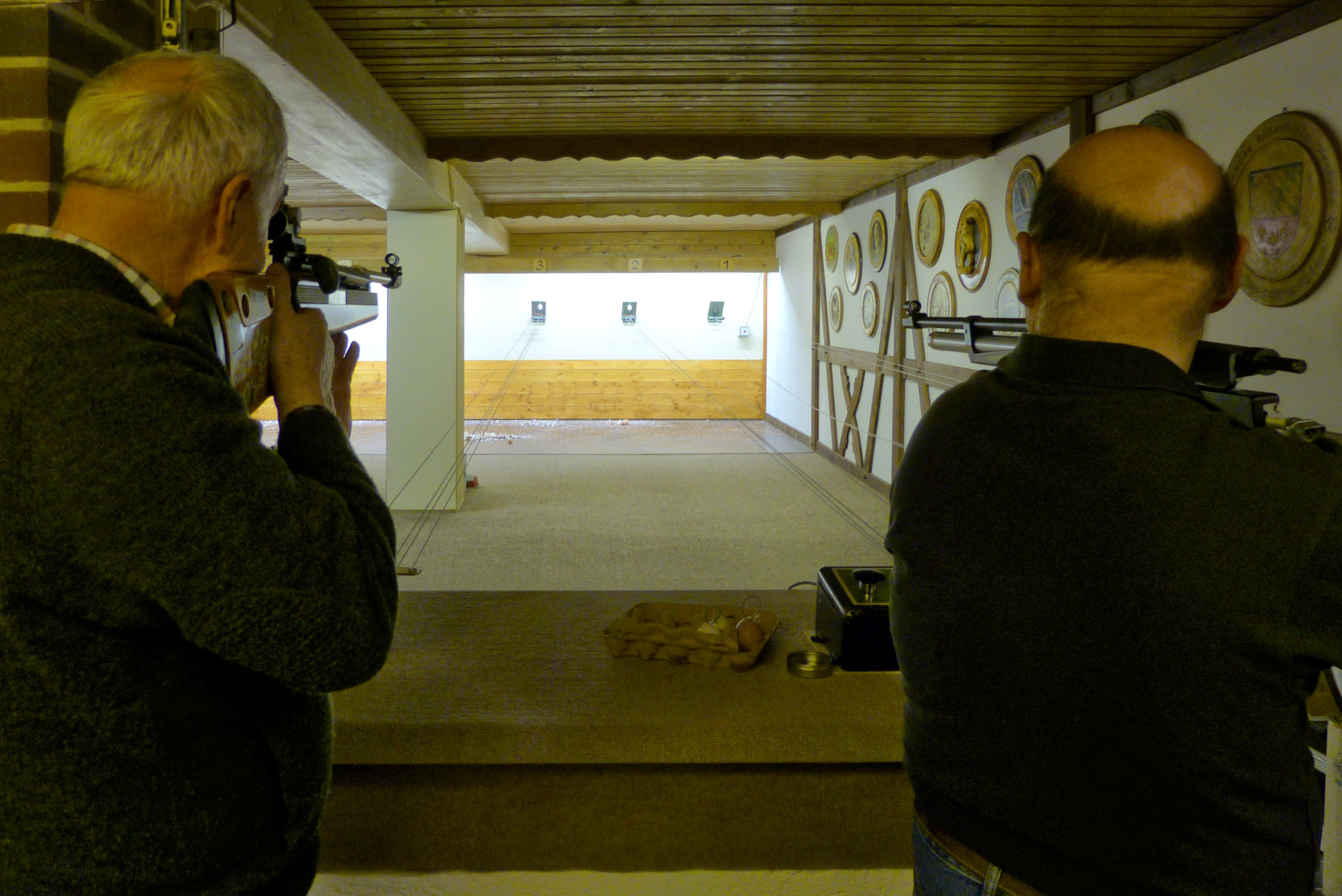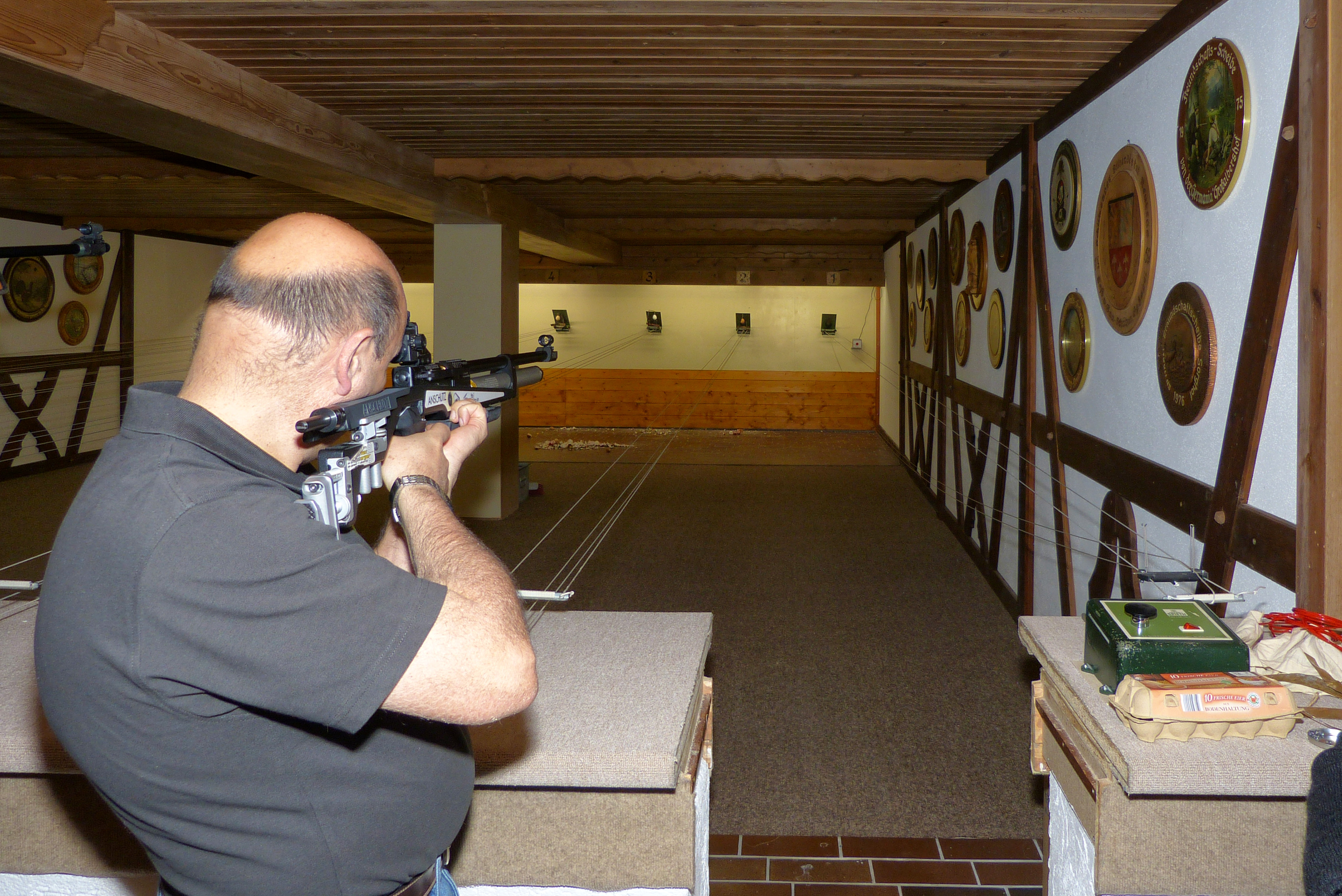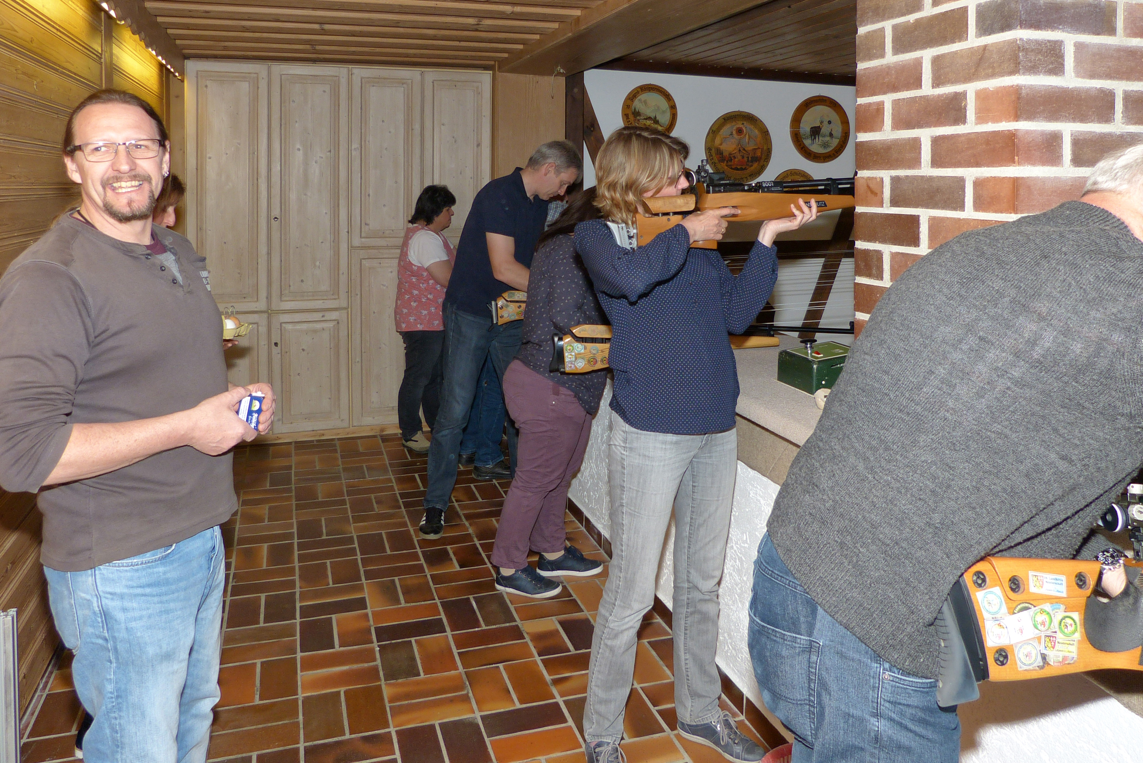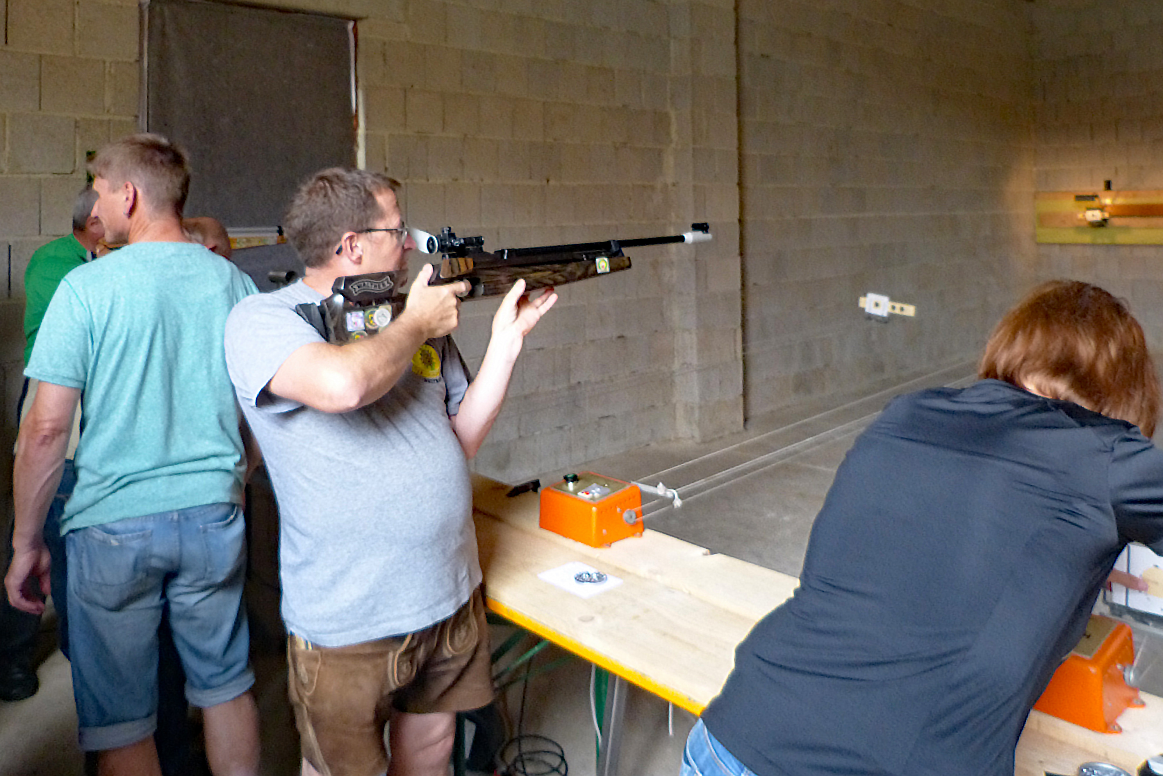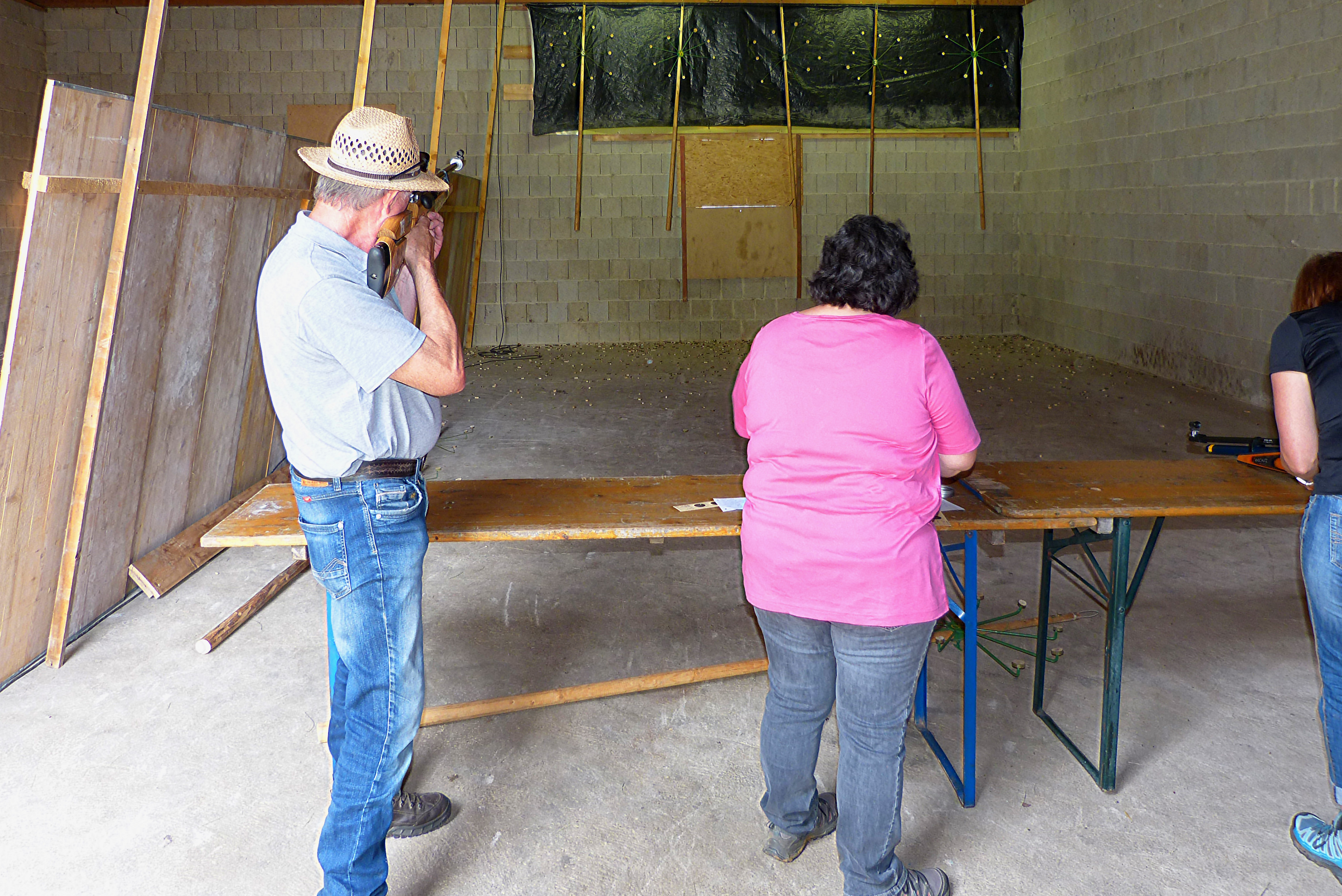 Nach etwas Erholung sind wir dann in der Lage, zum Schießen anzutreten. Fast sind wir schon die Nachhut, obwohl noch ziemlicher Andrang herrscht. Das Schießprogramm besteht aus maximal fünf Schuss auf den normalen Scheibenstreifen und aus zehn Kugeln, mit denen alle zehn auf dem Stern aufgesteckte Haselnusscheibchen herunter geschossen werden sollten. Die Erfolgsquote beim Schießen auf die Sterne ist nicht sehr hoch! Aber es gilt die olympische Einstellung. Wieder zurück im Hof merken wir, dass sich, wie schon im letzten Jahr, ein Gewitter ankündigt. So ziehen wir