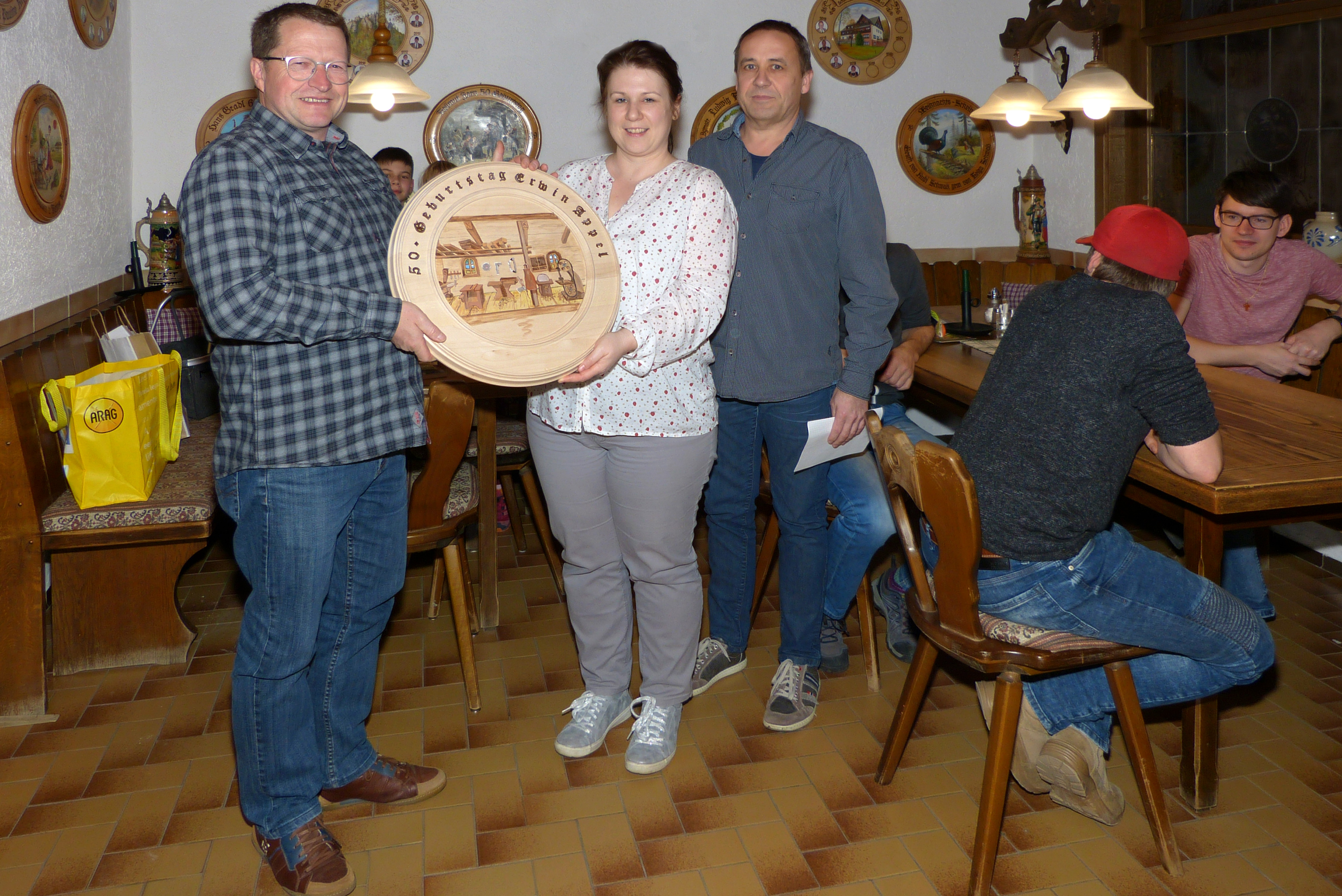Als Überraschung stiftet Erwin Appel aus Anlass seines 50. Geburtstags, den er im letzten Jahr begangen hat, eine schöne, in Handarbeit gestaltete Scheibe. Sie zeigt, direkt auf den Spender bezogen, eine Schreinerwerkstatt.