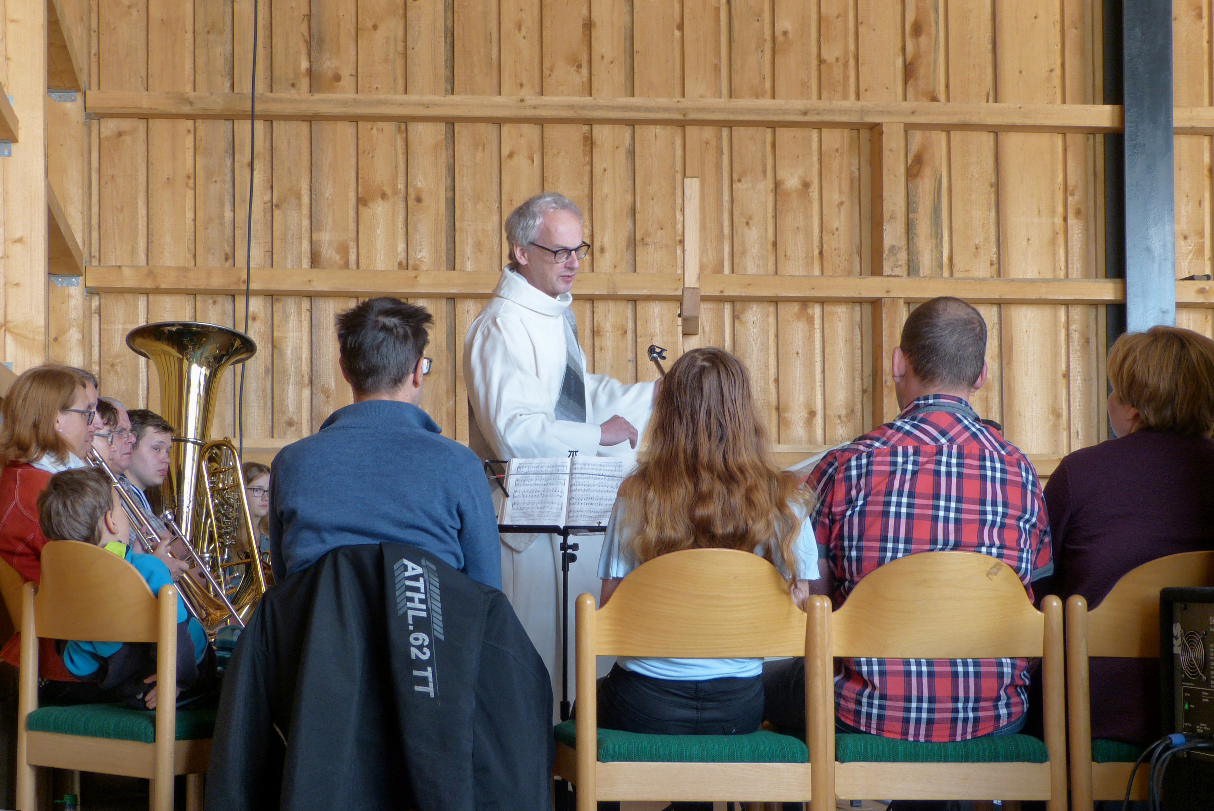 Schnell vergeht die Zeit und es treffen die Spielerinnen und Spieler des Posaunenchores ein, die auf der Bühne ihre Plätze einnehmen und mit dem Vorspielen beginnen. Auch die beiden Geistlichen, der evangelische Ortspfarrer der Kichengemeinde Pommelsbrunn, Pfarrer Johannes Schroll und der katholische Diakon Markus Weinländer treffen ein. Ziemlich schnell füllen sich die Halle und das Zelt der Bar mit den Teilnehmer/innen zum Gottesdienst. Pünktlich um 10:00 Uhr beginnen die beiden Geistlichen den Gottesdienst, bei dem sie sich abwechseln. Diakon Markus Weinländer hält die Festpredigt. Sie hat als Thema den Überfluss. Der Ausspruch: “ Zwischenzeitlich sterben mehr Menschen an Überernährung als an Hunger“, muss Jedermann/frau zum Nachdenken bringen. Es ist eine sehr eingehende Predigt. Der Posaunenchor begleitet den Gesang der Besucher.