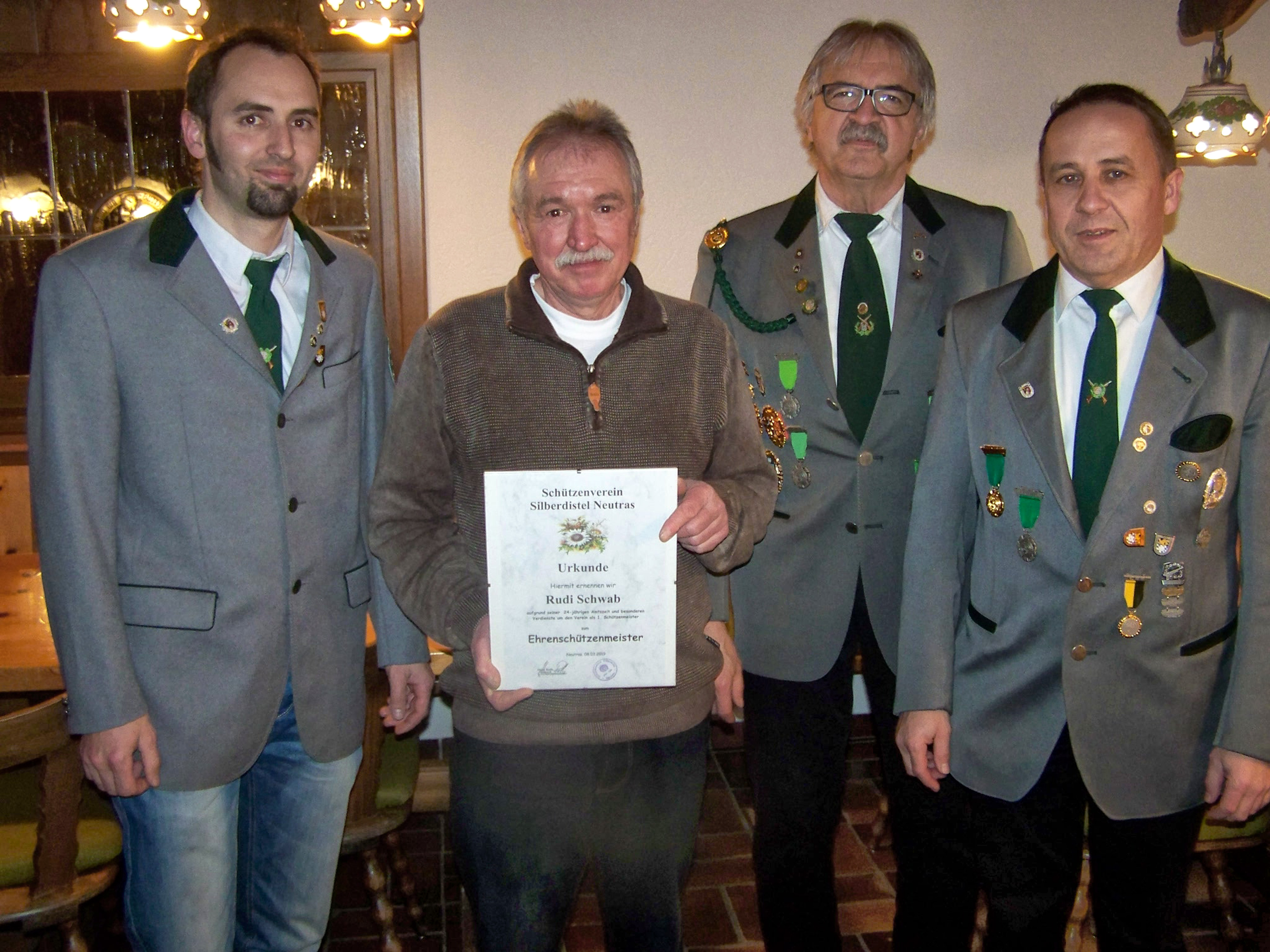Vier Schützenmeister von links: 2 SM Michael Loos, der neue Ehrenschützenmeister Rudi Schwab, Ehrenschützenmeister Johann Zimmermann und 1. Schützenmeister Hans Roth