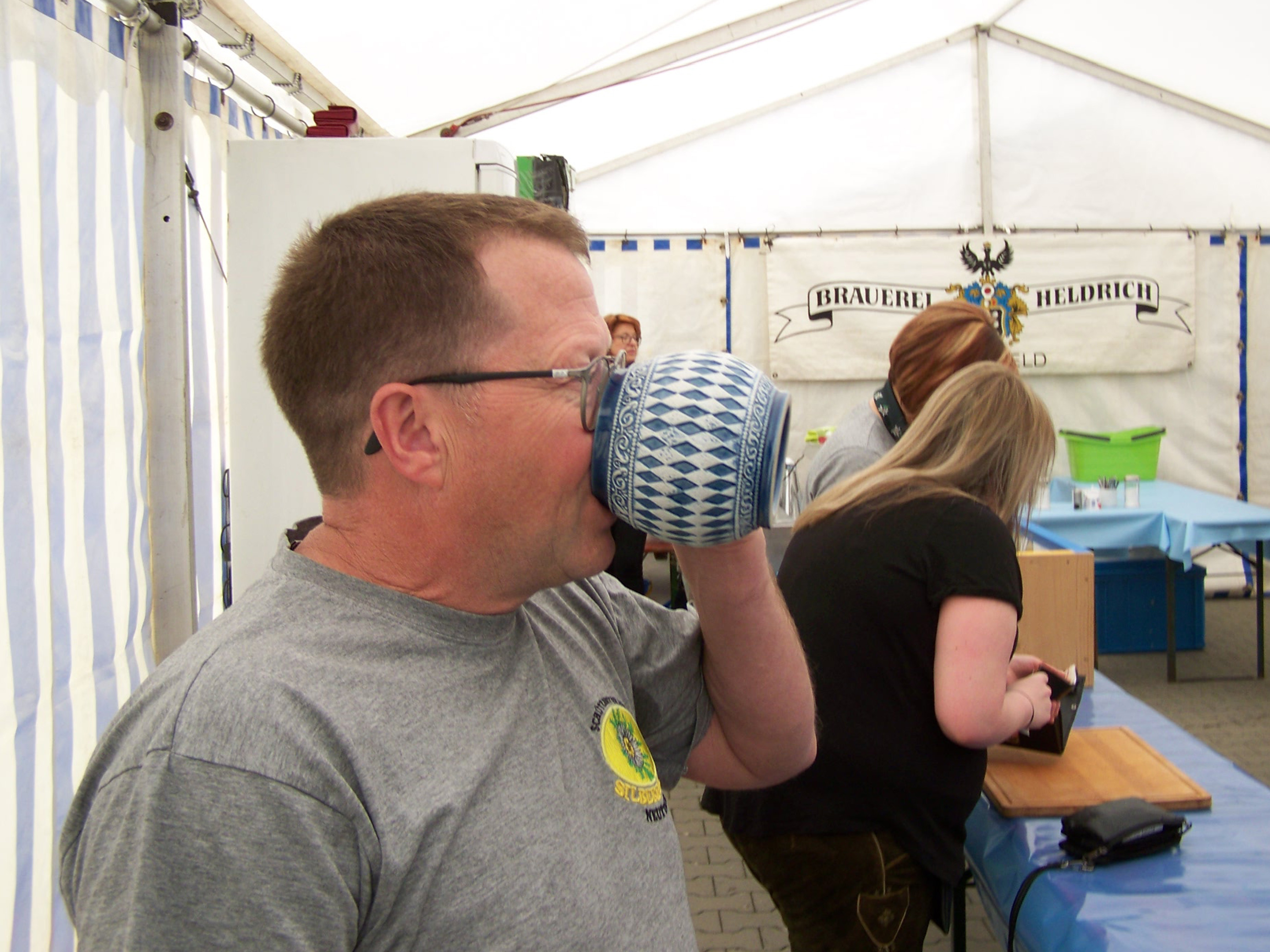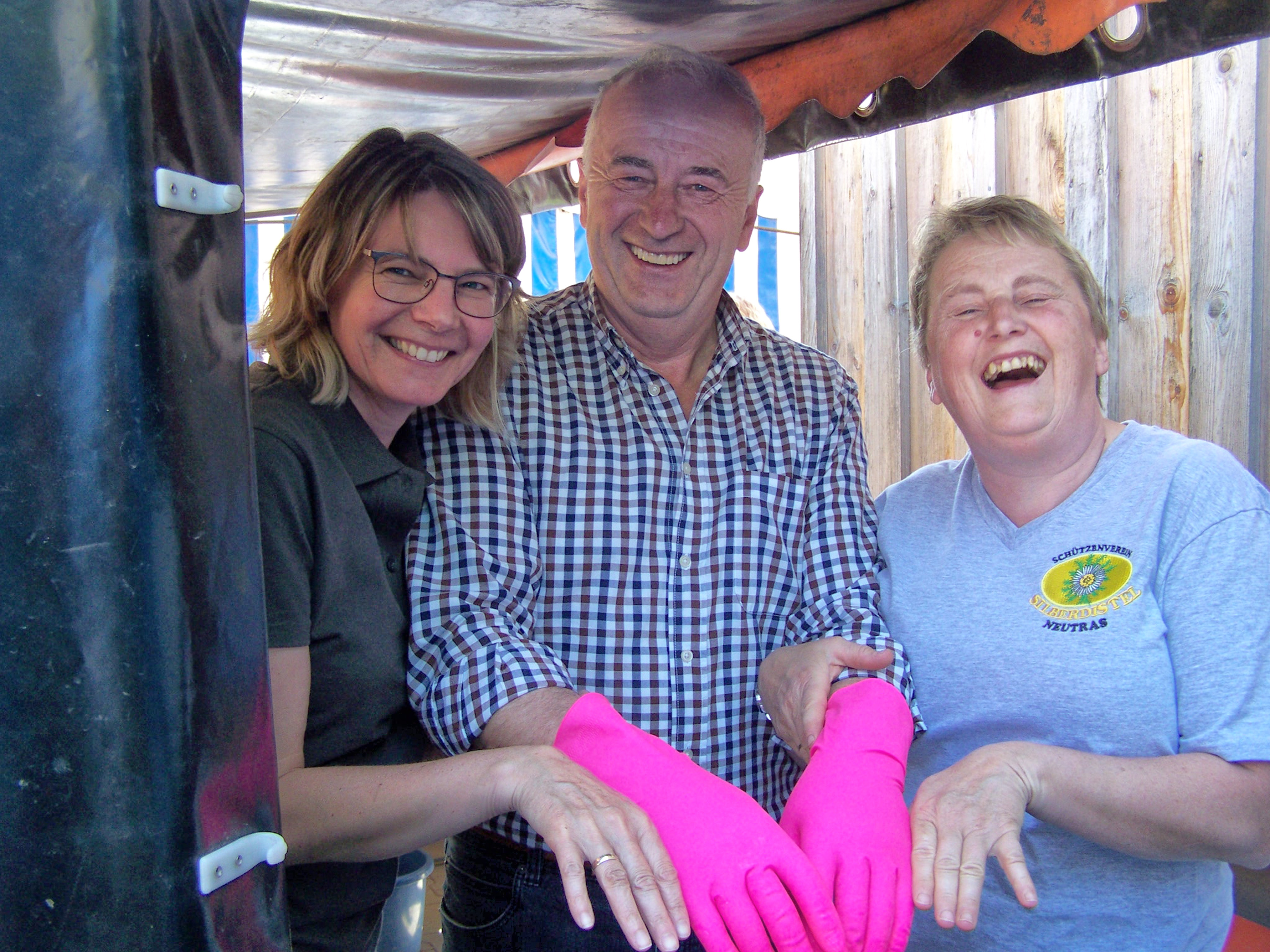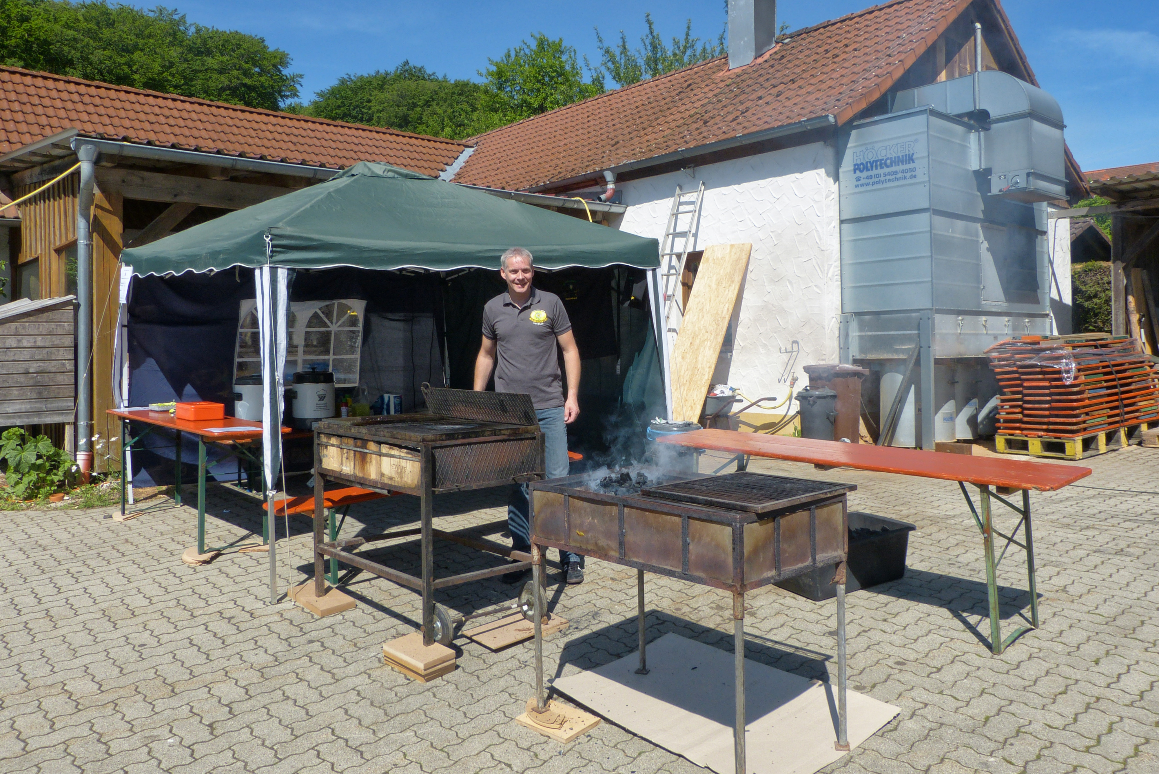 Heute heißt es für alle dienstbaren Geister: Sehr früh aufstehen, denn der Arbeitseinsatz beginnt bereits um 7:00 Uhr. Alle sind anwesend. Vom strahlend blauen Himmel lacht die Sonne und es verspricht ein herrlicher Tag zu werden. Es muss alles aufgeräumt und wieder auf Vordermann gebracht werden. Die Tische und Bänke müssen komplettiert und mit Tischdecken und Tischschmuck hübsch gemacht werden. Alle Arbeiten gehen ohne sichtbare Hektik aber gezielt und schnell voran. Es treffen immer mehr Torten ein, so dass bald jeder freie Platz im Kühlschrank belegt ist. Es ist schon im Vorfeld eine Augenweide und ein Angebot wie in der besten Konditorei. Helga und Rudi Schwab bringen früh die Salate, die im Kühlwagen verstaut werden.