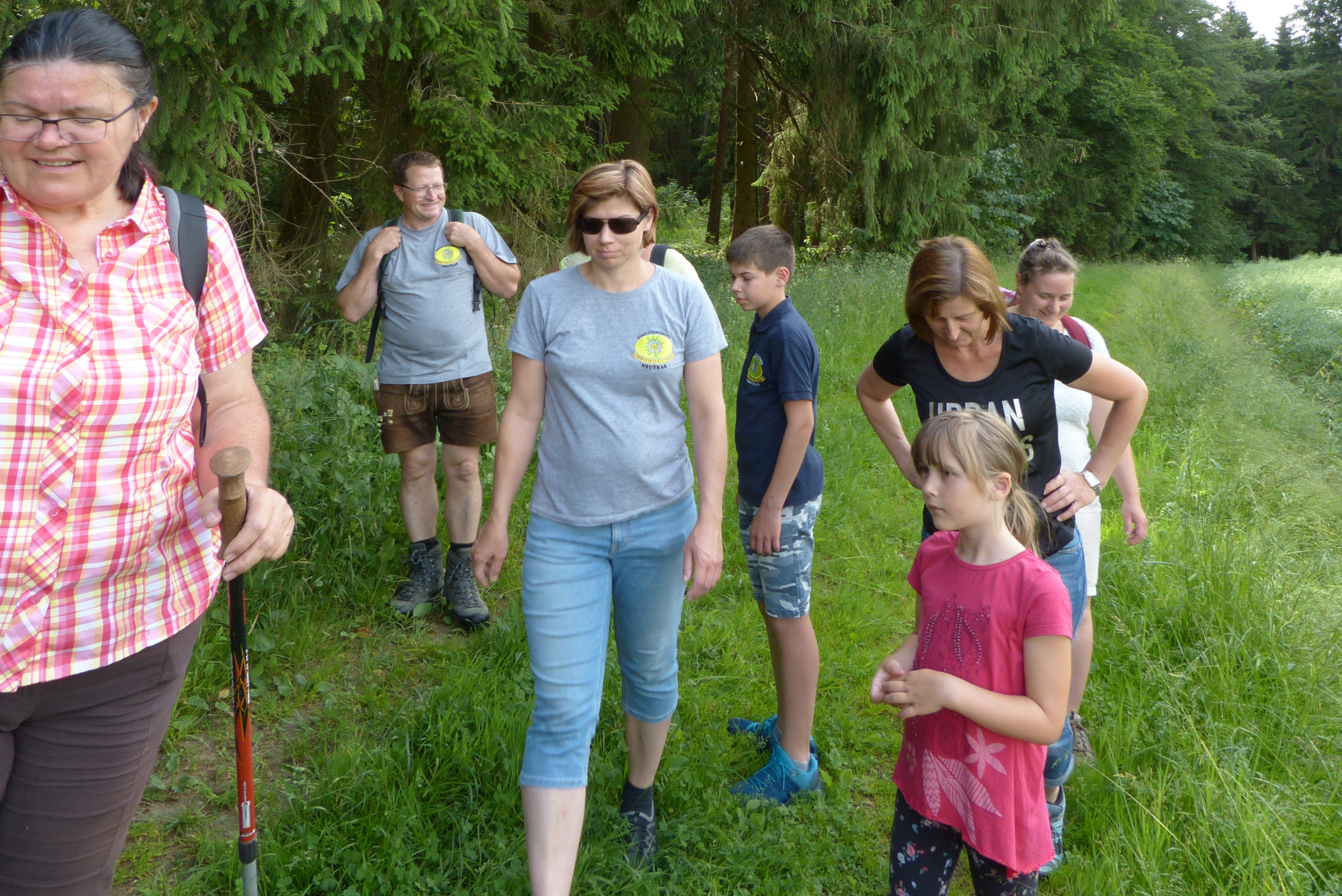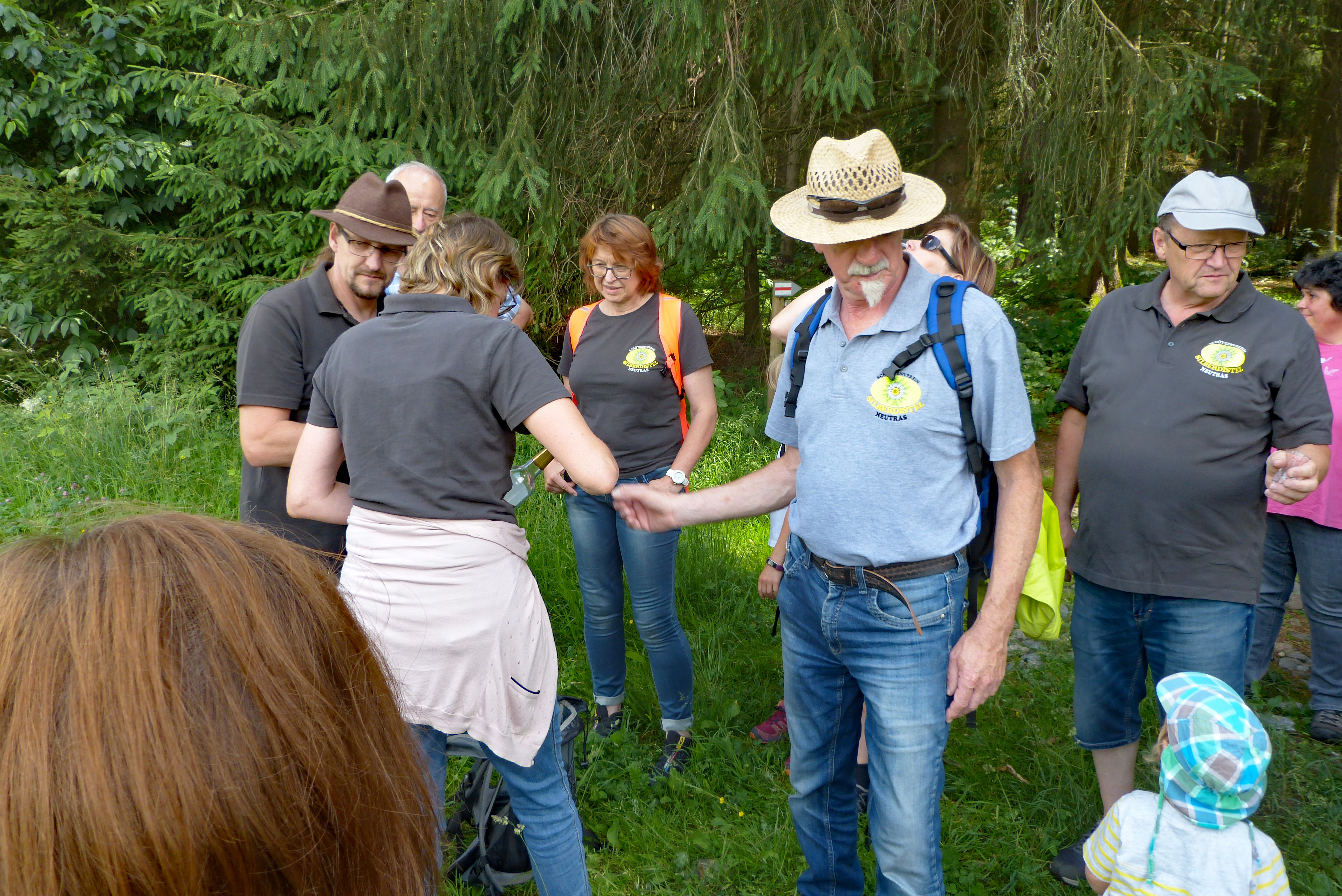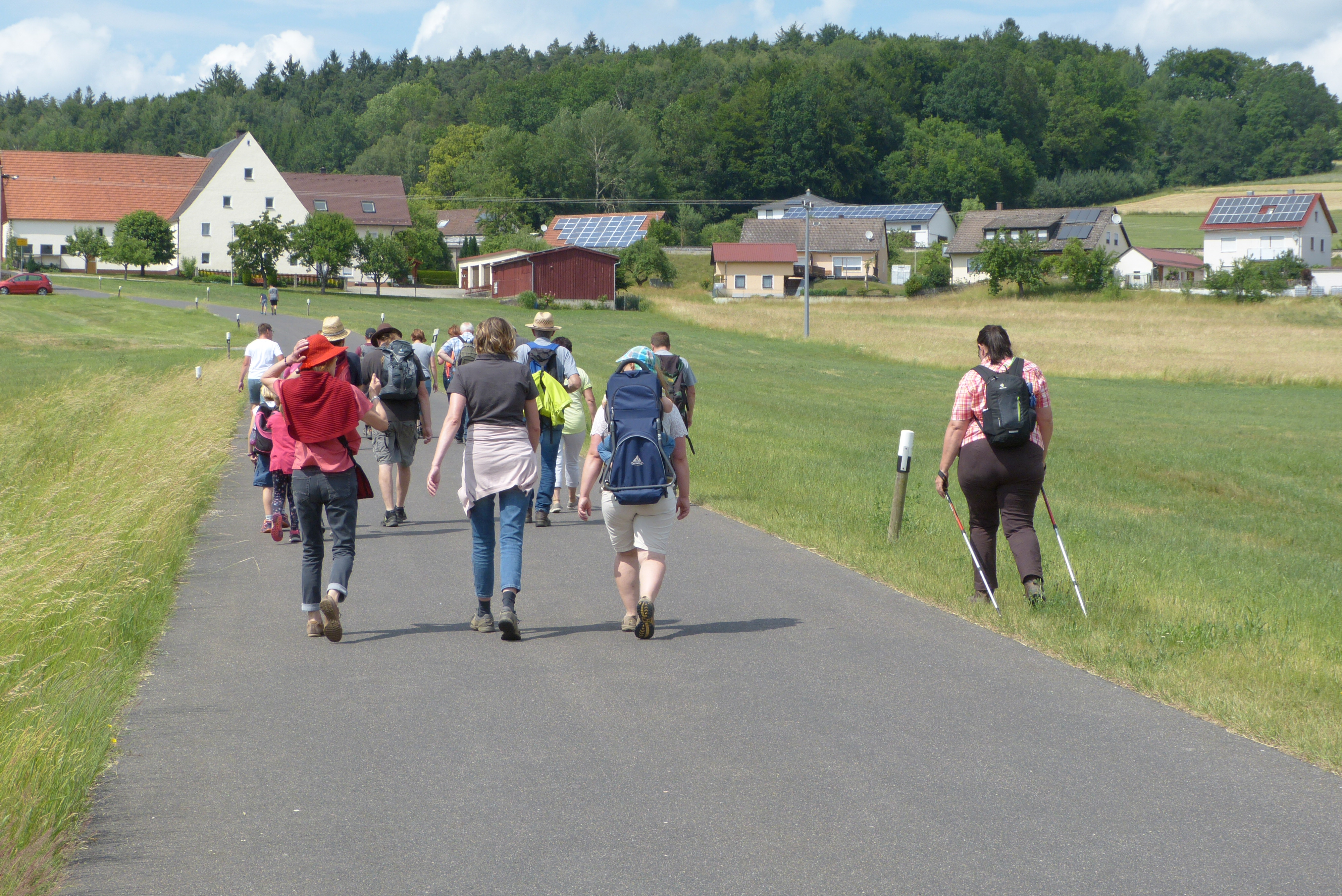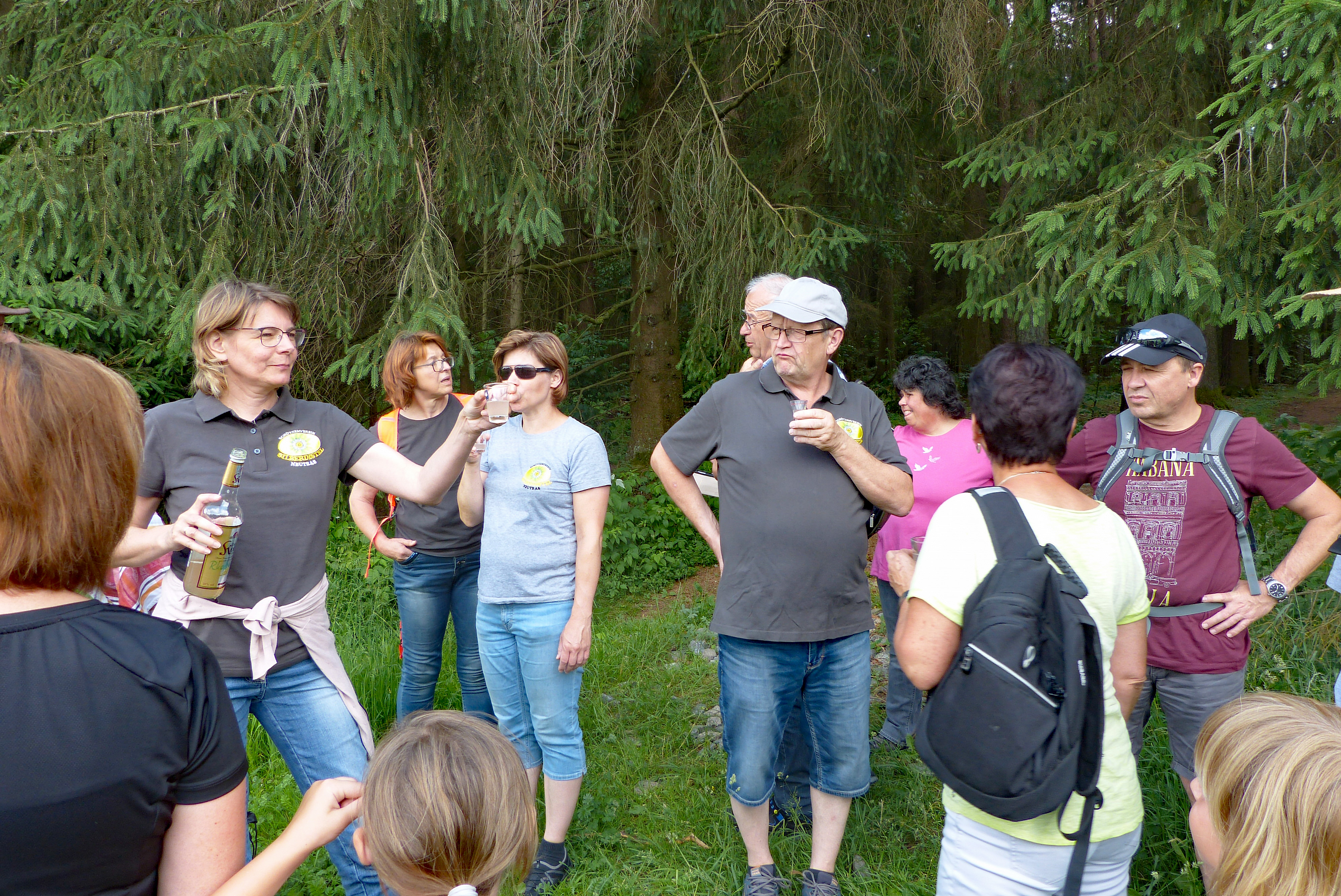 lässt Tanja „die Katze aus dem Sack“. Richtig gesagt: Sie holt den selbstgemachten Rhabarberschnaps aus dem Rucksack, der dann die Runde macht, bis die Flasche geleert ist. Er kommt bestens an. Nach dieser Stärkung geht es auf den Rest der Strecke. Leider ist von Niederricht über Kummerthal bis Fromberg als Weg nur die  Teerstraße. Die Sonne brennt dadurch noch etwas wärmer auf uns herab. Aber auch diese Strecke wird durch die Aussicht auf gute Bewirtung auch noch bewältigt. So kommen wir nach dem gut 7 km langen Marsch zwar etwas müde und ausgetrocknet im Wirtshof an, wo die zwei Musikanten aufspielen. Sehr schnell werden wir bedient.