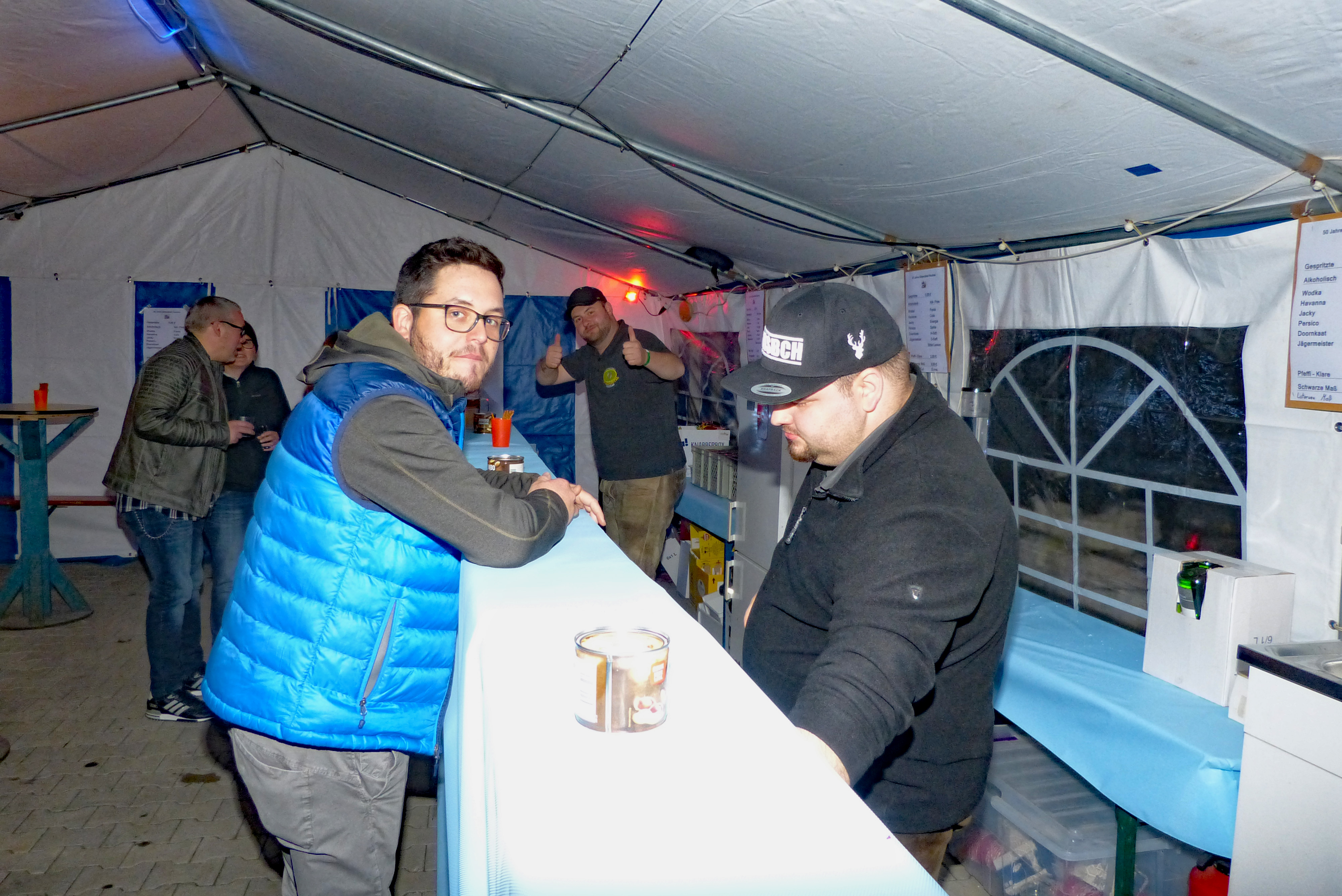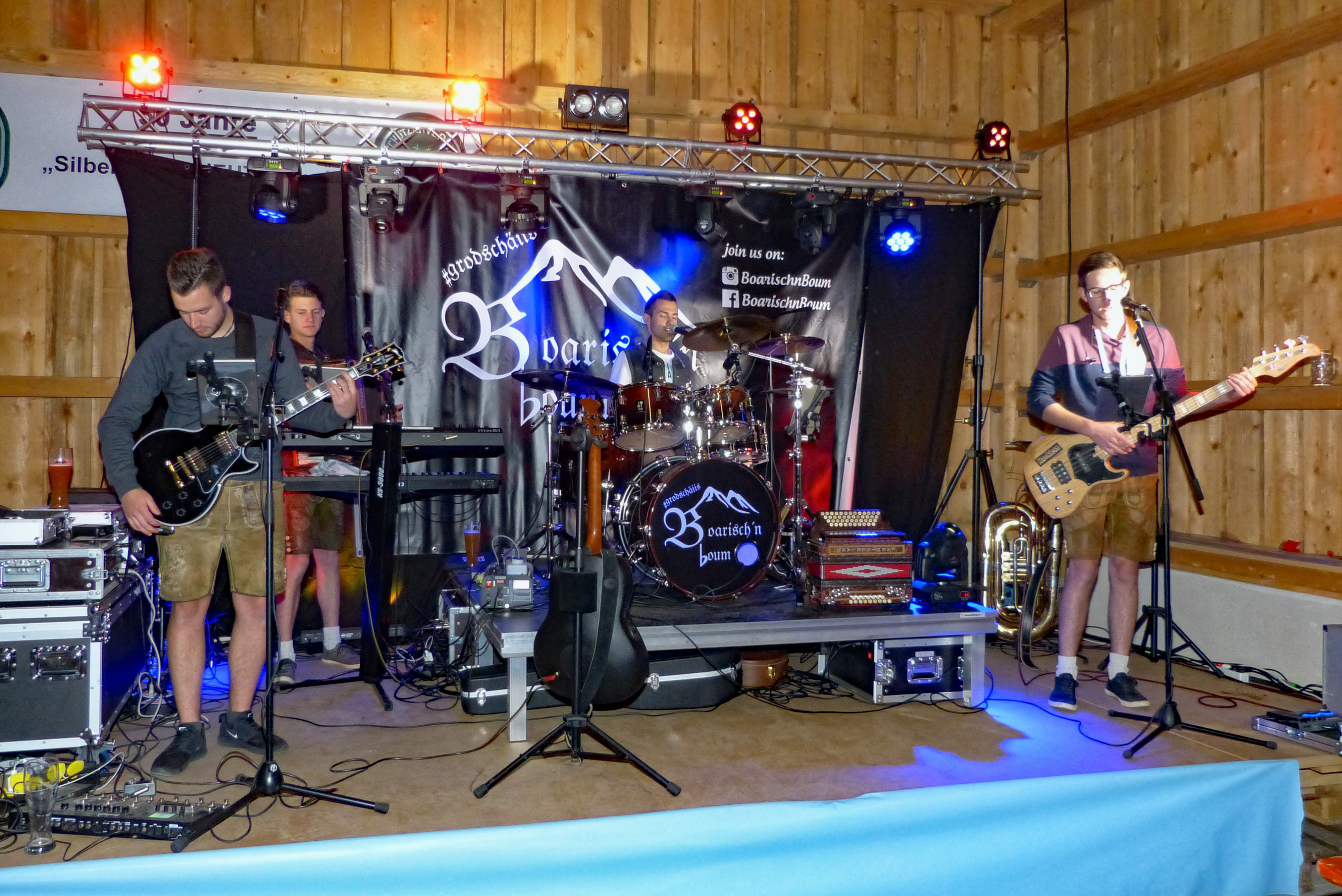 Der Termin mit den „Boarisch´n Boum“ rückt am Mittwoch näher und als diese mit dem Aufbau beginnen, ist dank der Zusammenarbeit aller Aktiven alles für den abendlichen Einsatz bereit. Die Kuchen- und Tortenbäckerinnen haben den Kühlschrank mit feinsten Backwaren bestückt. Es kann beginnen! Die Schänke, Essens- und Kaffeeausgabe, der Grill, das Geschirrmobil und nicht zuletzt die Bar sind bestens besetzt. Auch die Security ist eingetroffen. Aus der Bar sind im Vorfeld aus der Anlage von Sebastian schon heiße Töne zu hören. Sehr langsam treffen die Gäste ein. Es ist ziemlich frisch geworden und es muss geheizt werden. Das Geschäft an den „Tank- und Versorgungsstationen“ läuft sehr schleppend. Die „Boarisch´n Boum“ geben ihr Bestes. Sie bieten ein sehr abwechslungsreiches Programm, das ankommt. Leider wird der Andrang an Besuchern nicht viel größer, so dass die Halle nicht gefüllt wird, was sich auch auf den Barbetrieb auswirkt. Woran es liegt, dass der Besuch so schwach ist, kann vielleicht nicht nur an der kalten Witterung liegen. Wir wissen es nicht. Plakatiert wurde auf jeden Fall ausreichend.