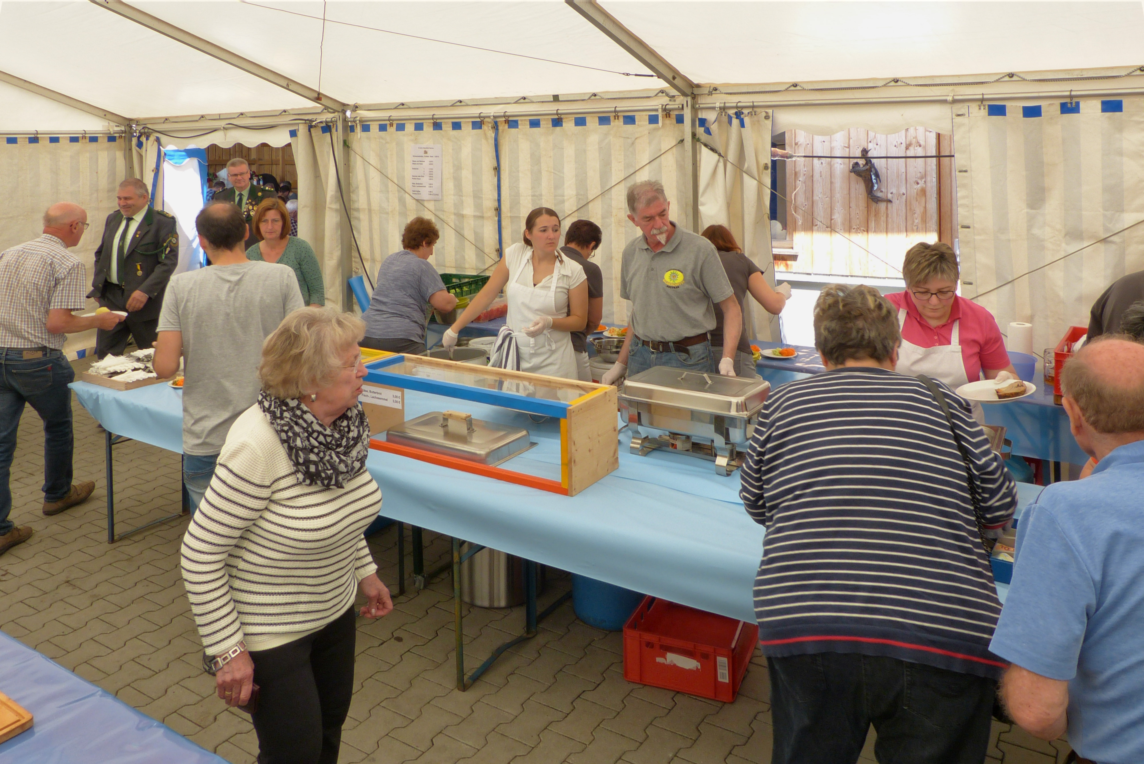 Als der Gottesdienst beendet ist, warten schon die ersten Besucher an der Schänke auf ihre Getränke. Die ganze Familie Siggelkow hat die Grillstation voll in Betrieb und kann die ersten Hungrigen schnell bedienen. So ist es auch an der Ausgabe für Kaffee und Kuchen, die bestens von fleißigen Helferinnen besetzt ist. Dank der vorausschauenden Vorbereitung des Essens für die Hauptmahlzeit, Braten mit Klos und Salatteller, durch die Wirtsleute und Vereinsmitglieder Helga und Rudi Schwab mit ihren Helferinnen, kann bereits um 11:00 Uhr mit der Essensausgabe begonnen werden. Die Teller dazu, die im Geschirrmobil vom Reinigungsteam vorgewärmt werden, müssen sehr schnell wieder bestückt werden, da großer Andrang an der Ausgabe herrscht. Dort läuft es dank der „wirtsmäßigen“ Organisation durch Helga mit dem ganzen Team wie am Fließband ab. Jede Frau hat ihre feste Aufgabe. Die Mannschaft, die bedient, ist bestens aufgestellt - richtig professionell wickeln sie Bedienung der Gäste ab.