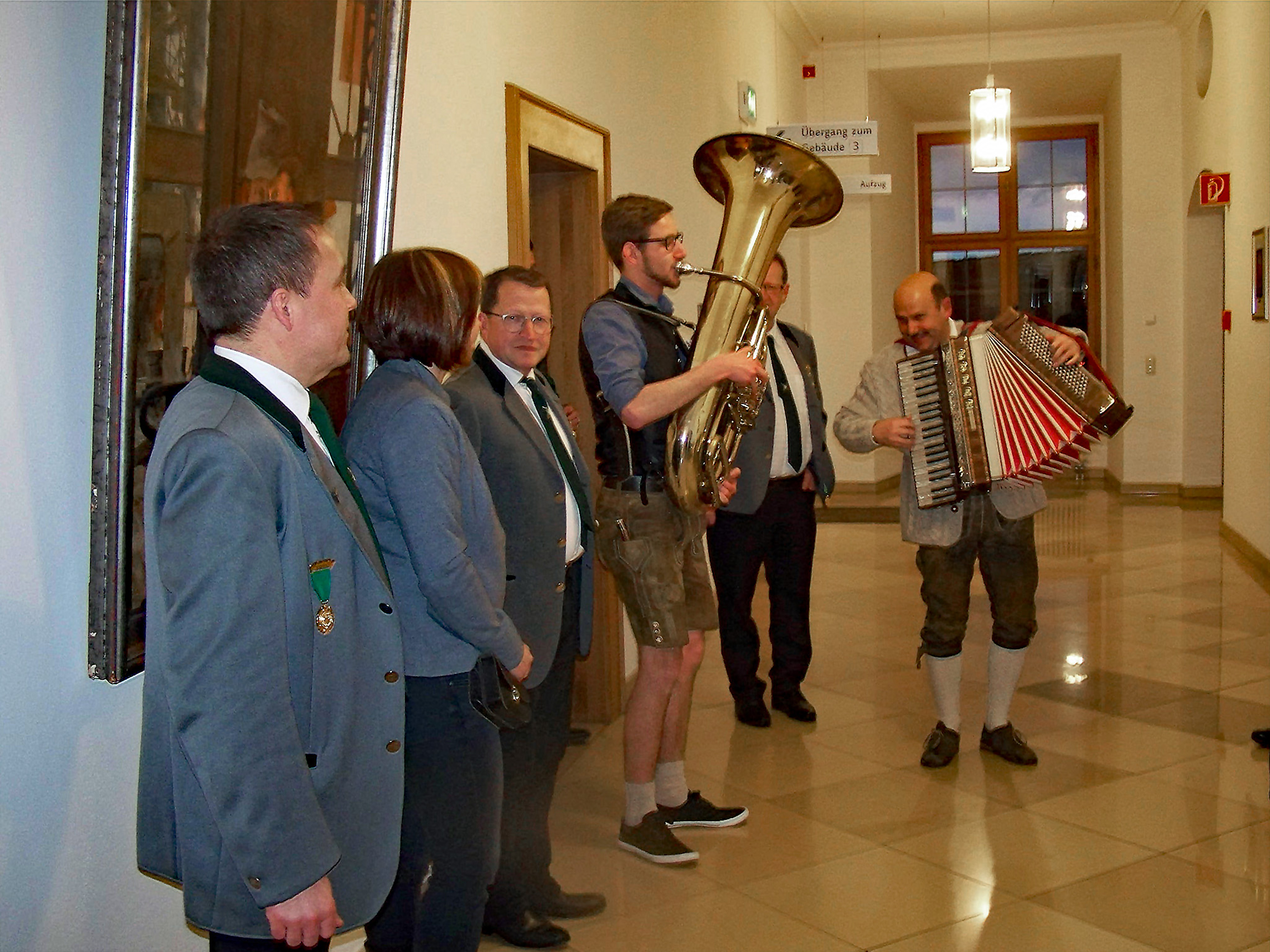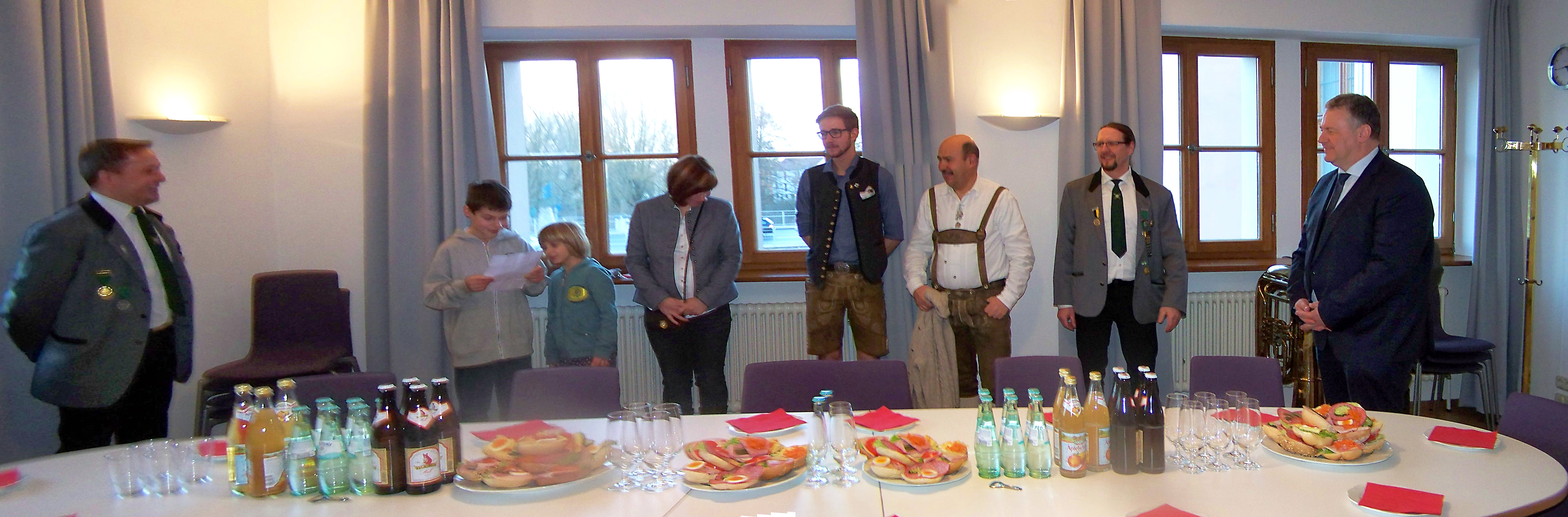 Nun geht es in ein Empfangszimmer, wo bereits Getränke und eine reichhaltige Brotzeit aufgetischt sind. Nach eine paar Musikstücken tragen Max und Johanna in Form eines lustigen, sinnigen Gedichtes dem Landrat die Patenschaft an, die er mit einem „Ja gerne!“ beantwortet.