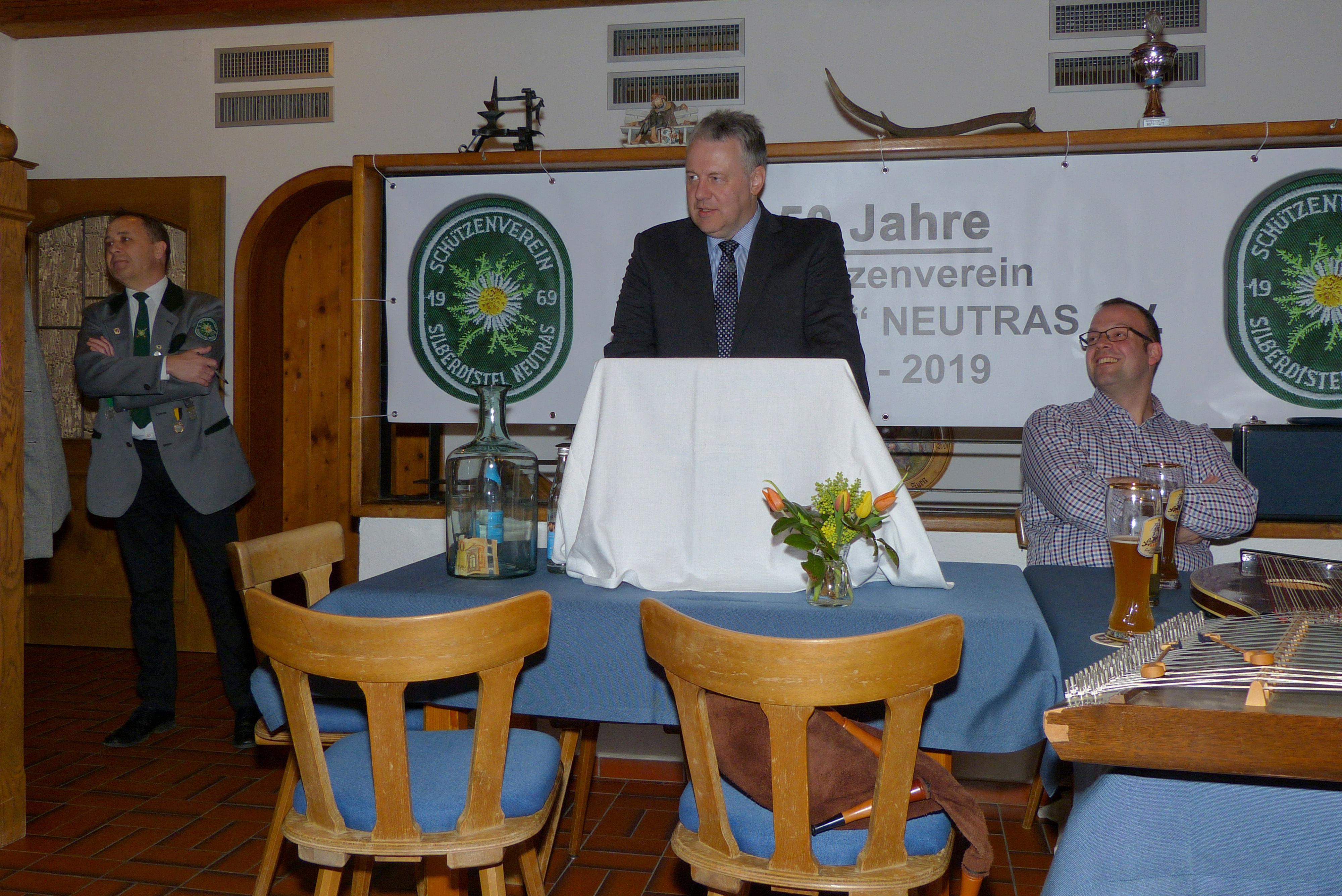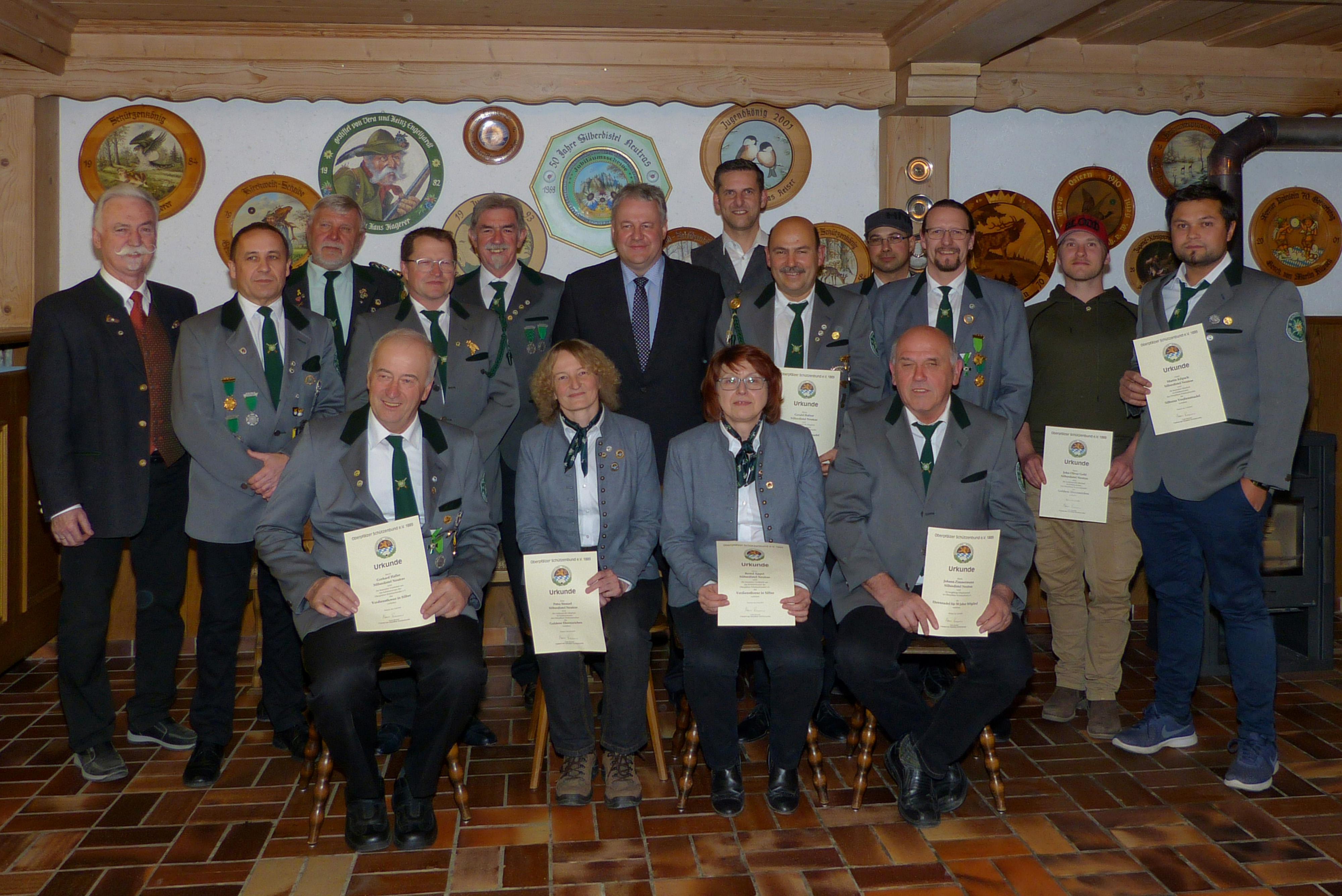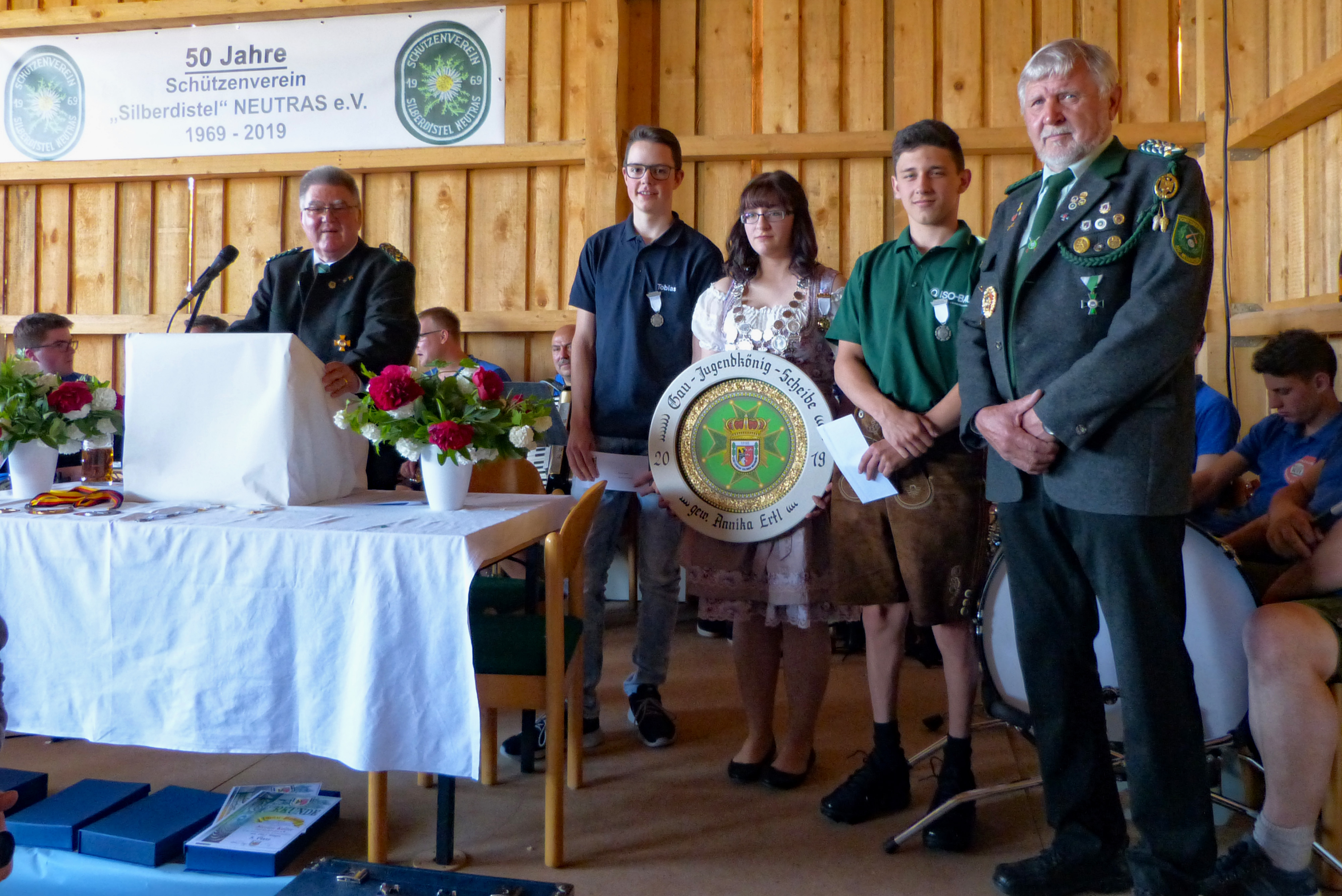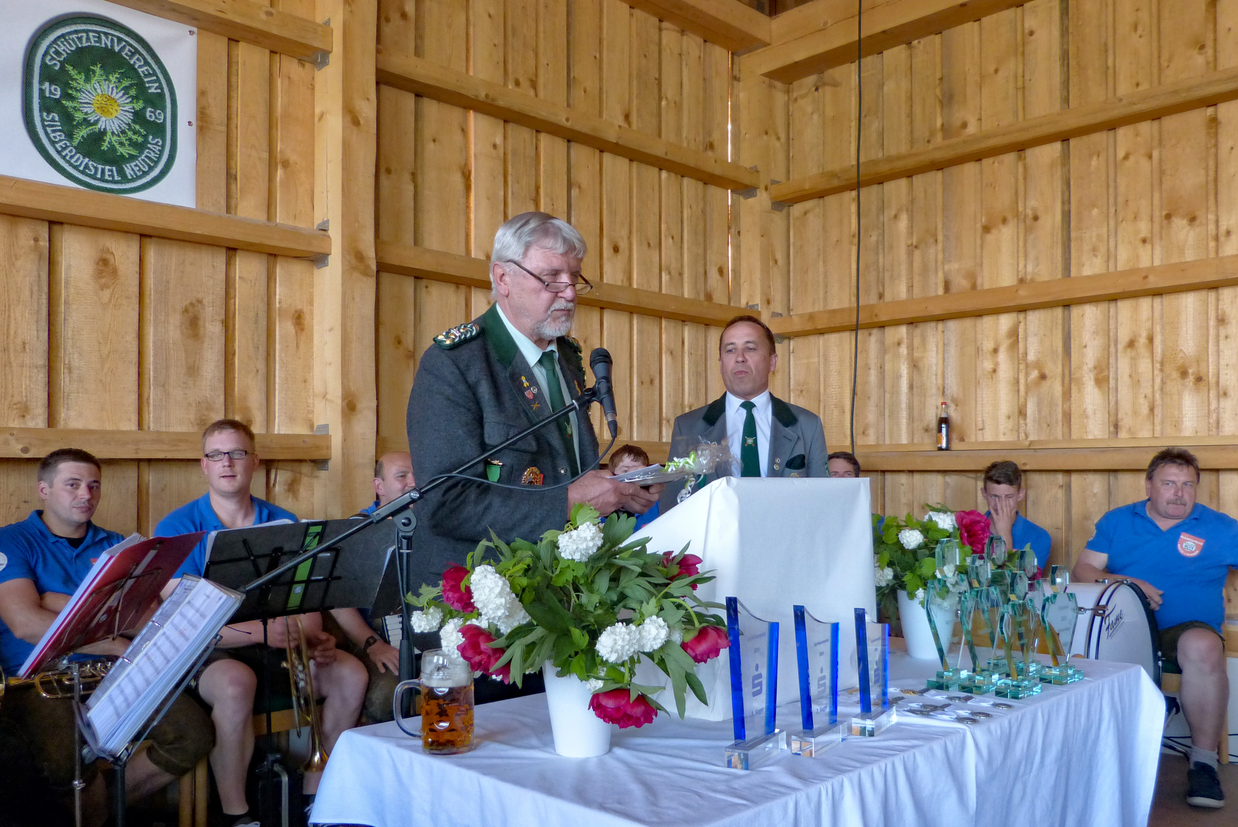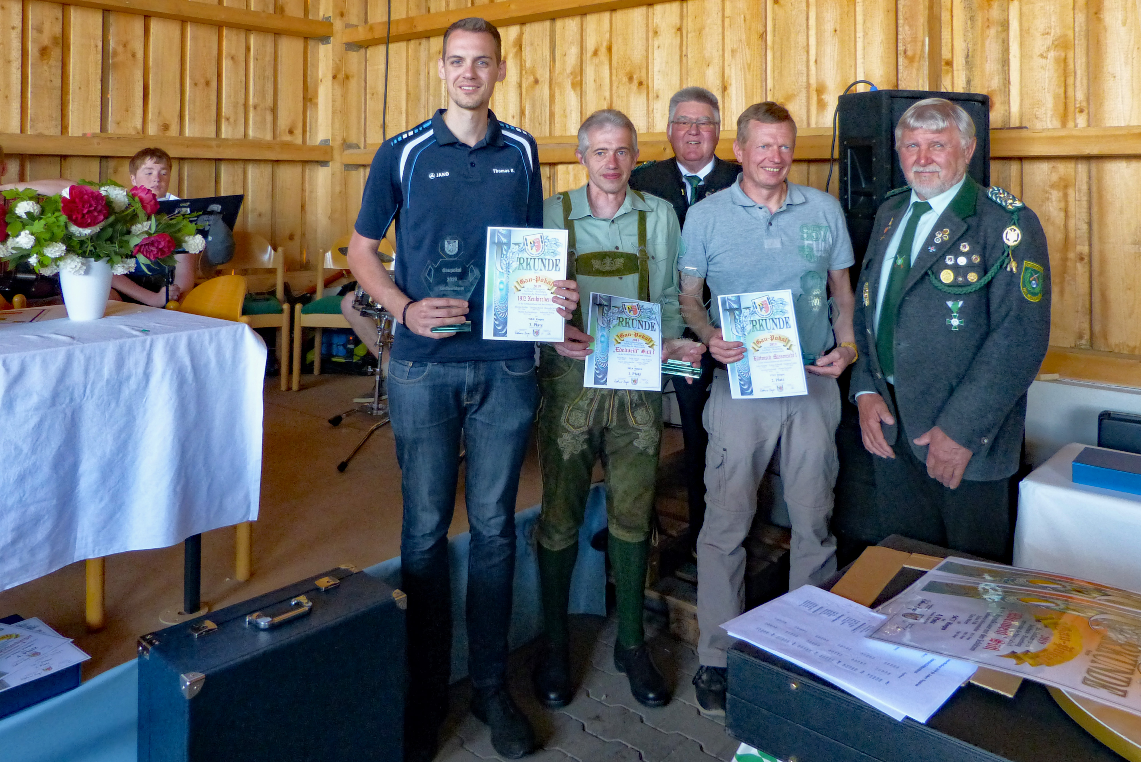 Um 16:00 Uhr ist die Preisverteilung des Jubiläums-, Gau- und Sparkassenpokalschießens angesetzt. Beim Gauschießen ist die Proklamation des Gaukönigs, der Gauliesl und des Gaujugendkönigs mit Rittern und Zofen im Programm. Dazu sind der Schirmherr, der Landrat des Landkreises Amberg-Sulzbach, Richard Reisinger, 1. Gauschützenmeister und Gauehrenmitglied Dietmar Beyer, 1. Gauschießleiter und Gauehrenschützenmeister Wolfgang Moll, Gauehrenschützenmeister und OSB-Ehrenmitglied Karl Federer, Gauehrenmitglied Leo Kurz, so wie der Erste Bürgermeister der Gemeinde Etzelwang, Roman Berr und der Erste Bürgermeister der Gemeinde Neukirchen, Winfried Franz, eingetroffen. Sie begrüßt der Erste Schützenmeister Hans Roth zusammen mit den anwesenden Vertretern der Schützenvereine und den Teilnehmern am Schießen.