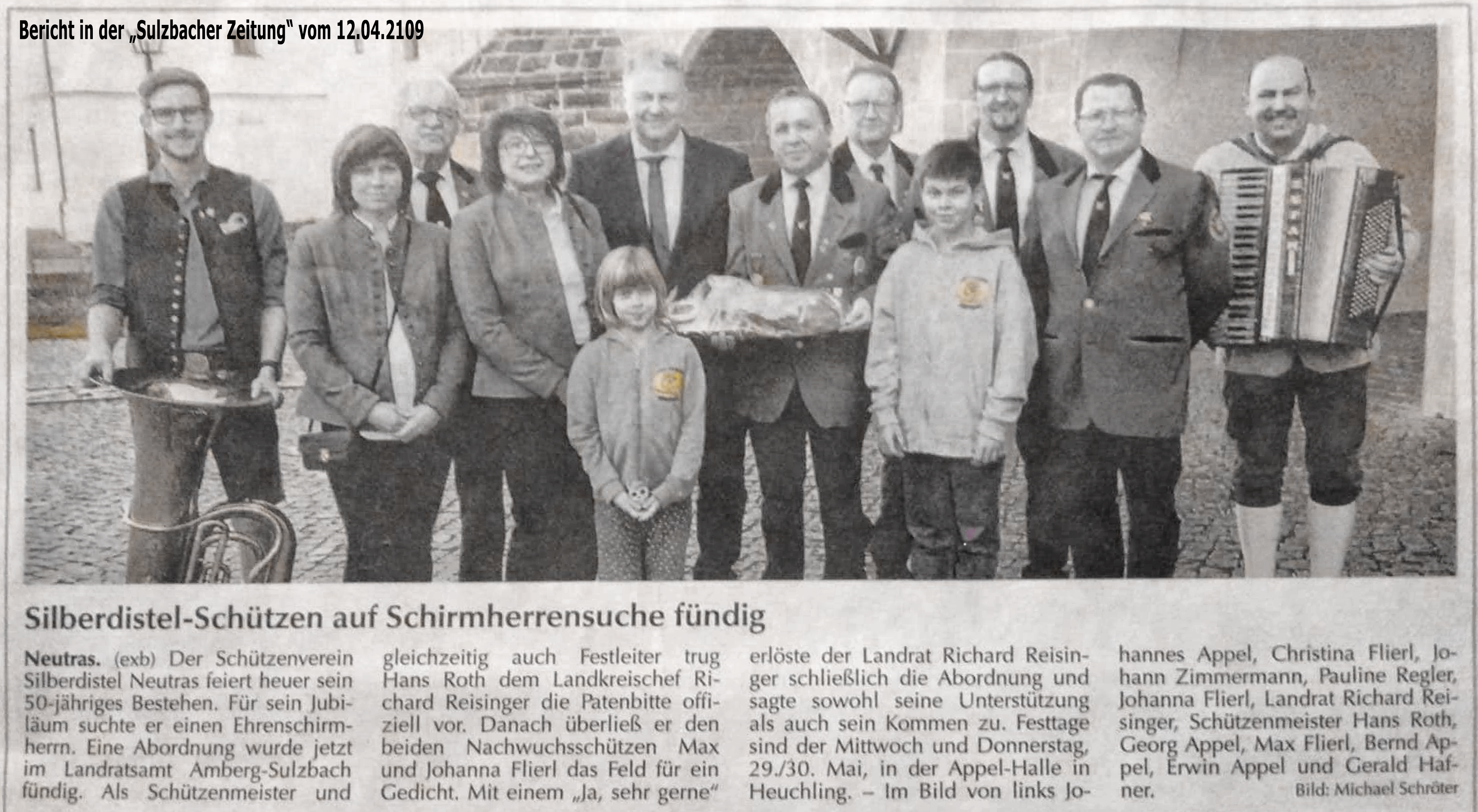 So treffen wir uns pünktlich im Hof des Landratsamtes in Amberg. Wir, das sind Hafner Gerald mit seiner „Quetschn“ und Appel Johannes mit der Tuba. Des weiteren, 1. SM Roth Hans, Oberschießleiter Appel Georg, Schriftführerin Regler Pauline, Kassiererin Flierl Christine mit Johanna und Max, Jugendleiter Appel Bernd, Beisitzer Appel Erwin und ESM Zimmermann Johann - also in einer Mannschaftsstärke von elf Personen.