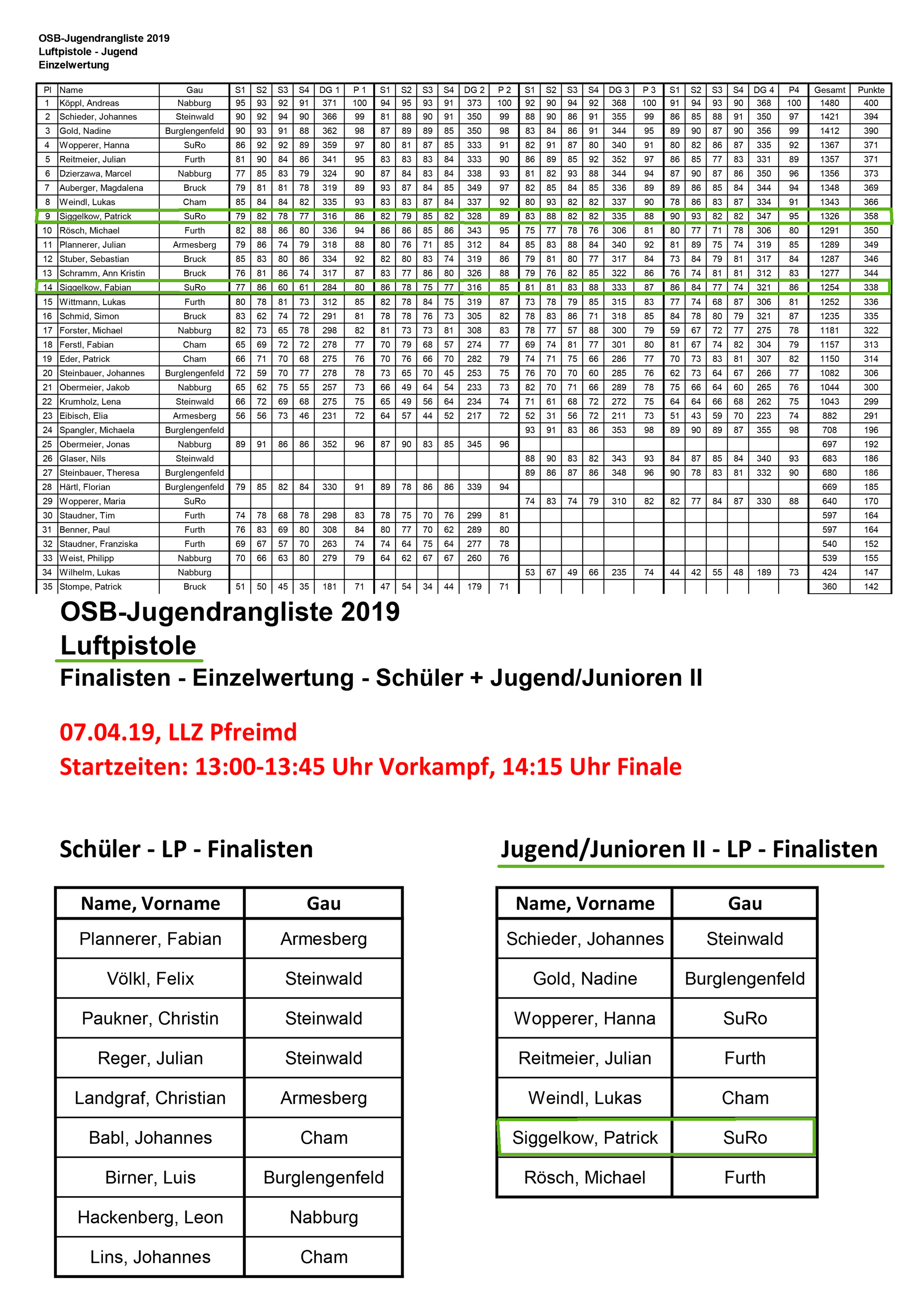 OSB Jugendrangliste 2019 Luftgewehr u. Luftpistole