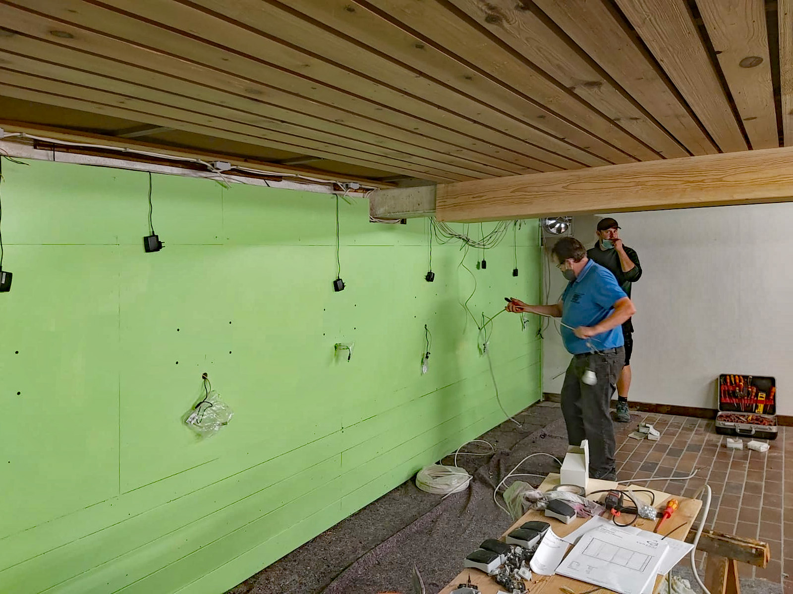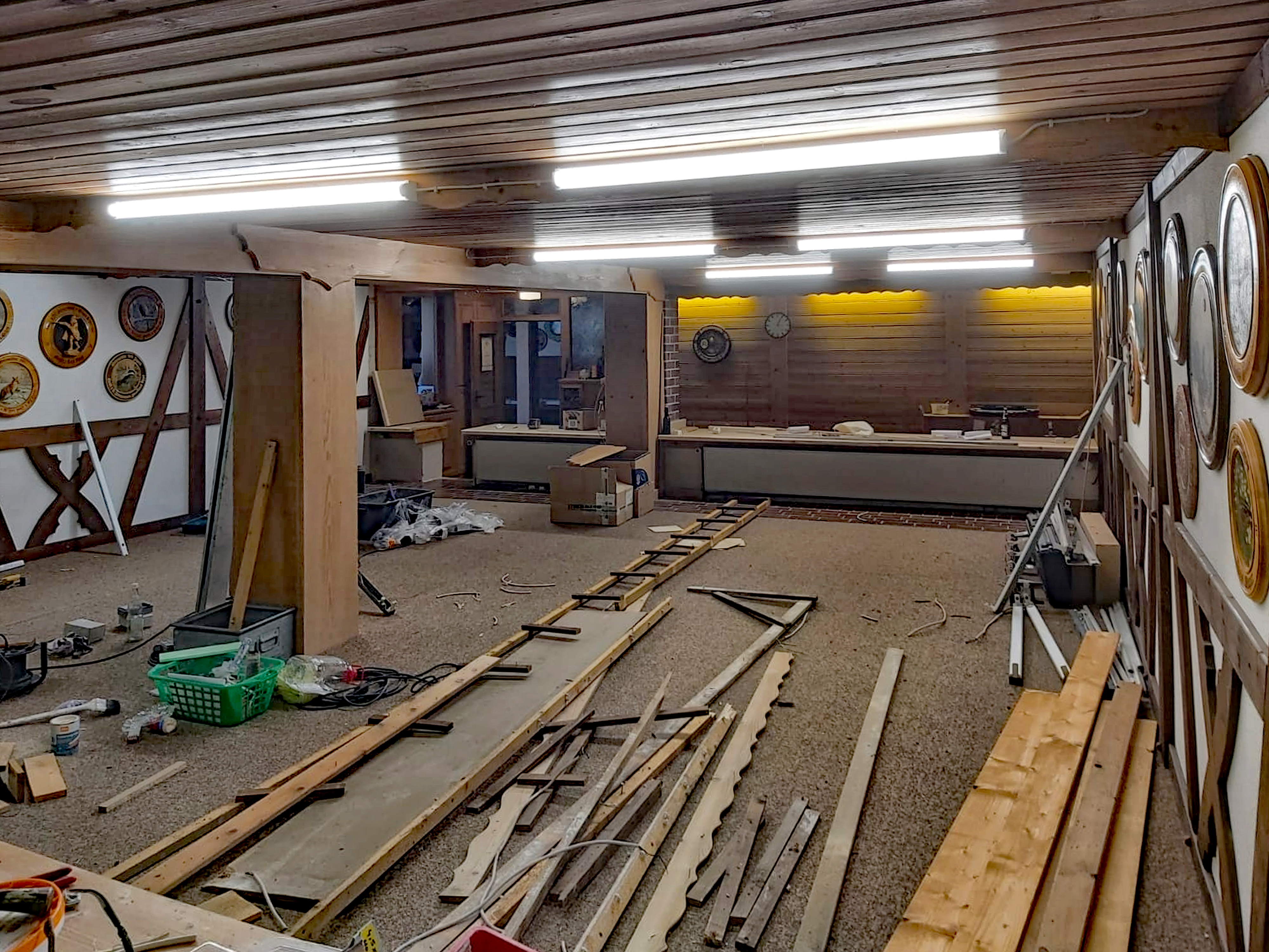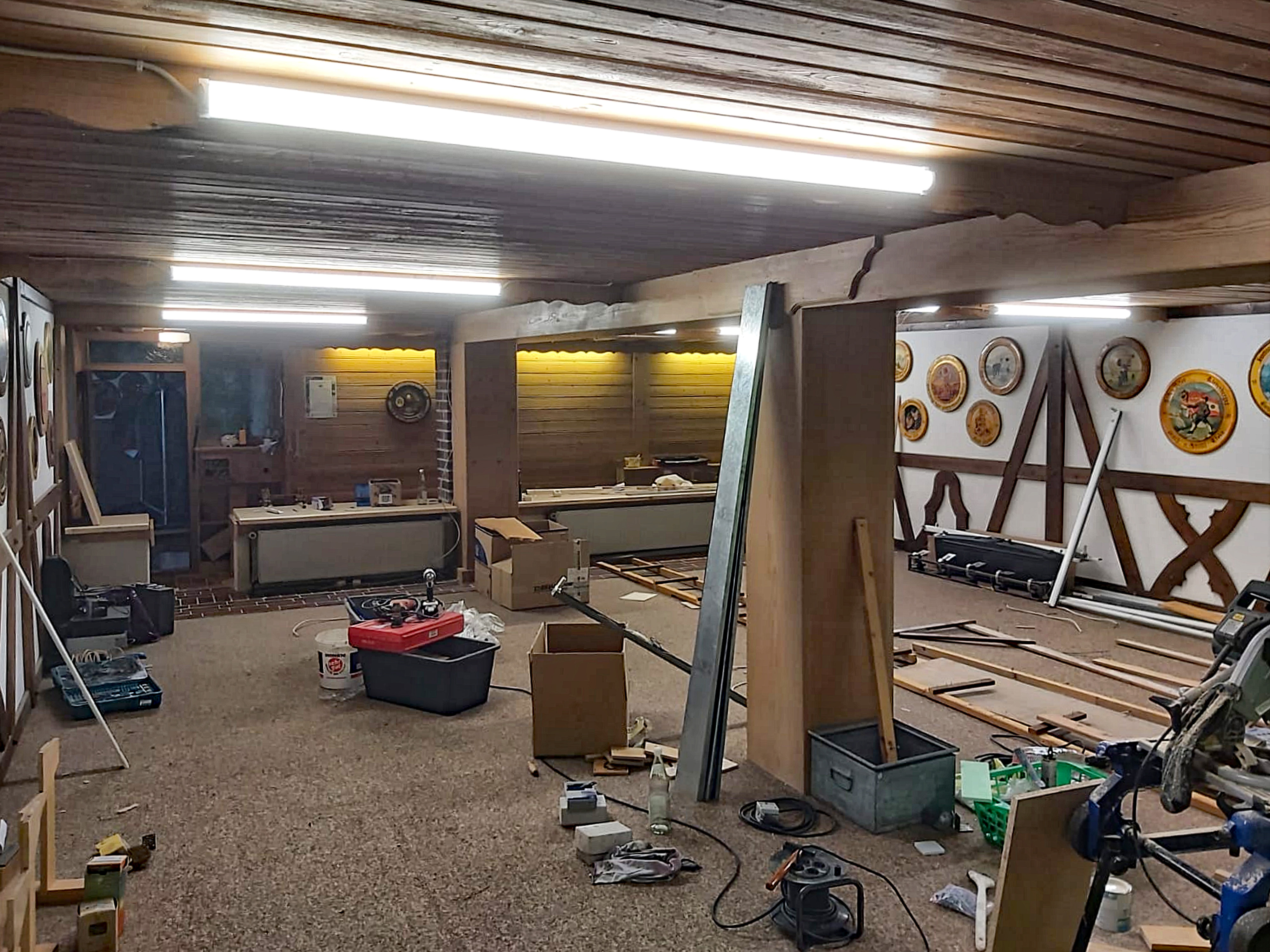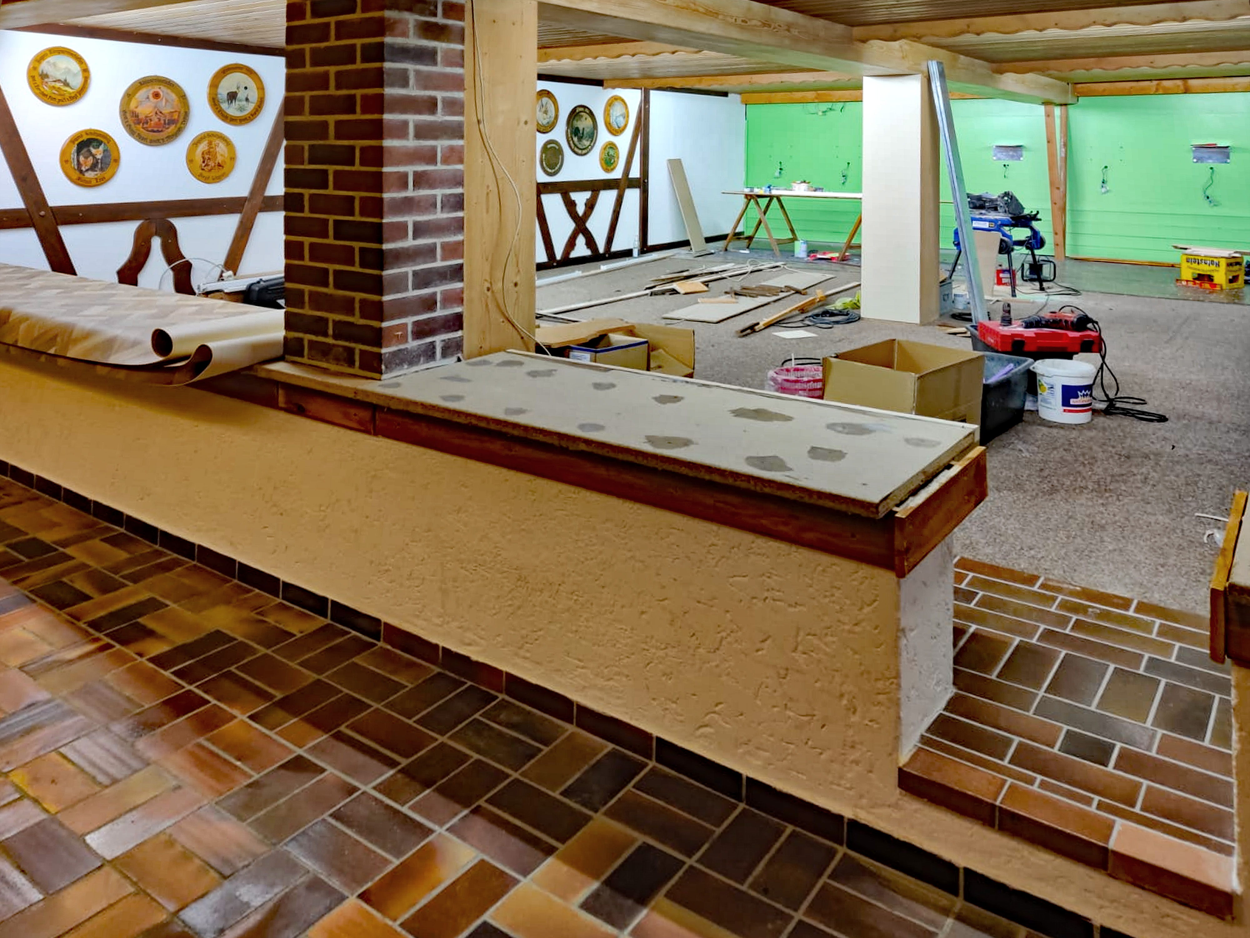 Am Montag, 20. April bauen Schorsch und Hans die Seilzuganlage, so wie die vordere Verblendung ab. Am Dienstag, 21. April Vormittag montieren Haller Gerd und Schützenkönig Gradl Hans die Platte des Standes ab, nachdem vorher mühsam der im letzten Jahr neu aufgeklebte Teppichboden entfernt wurde. Schorsch und Hans übernehmen am Nachmittag wieder die Vorderfront und das Verputzen. Die beiden Mannschaften sprechen sich in den folgenden Tagen mit den Arbeiten immer ab. Dadurch ist immer nur eine Gruppe am Stand. In der Zwischenzeit ist „Elektrospezialist“ Lett Sebastian mit im Einsatz. Alte Leitungen umlegen und neu verkabeln - spät und nach Arbeitsschluss. Gerd und König Hans bringen die Platte auf die niedrigere Höhe wieder an. Ab 27. April kümmert sich Ehrenschützenmeister Zimmermann Johann um den Belag des Schützenstandes. Mit Gradl Hans und Gerd wird dieser nicht ganz problemlos, doch dann erfolgreich, aufgebracht. Johann installiert die Steckdosen und die Kabelkanäle für die Bildschirme so wie die Verkabelung derselben. In der Zwischenzeit haben Schorsch und SM Hans die Front fast komplett installiert. D.h.: Es sind die Leitungen für die Kugelfänge (Strom und EDV) verlegt. Die Steckdosen dazu sind gesetzt ( immer unter Sebastian ). Die DISAG-Kugelfänge mit Opticore-Messrahmen sind montiert. Die Wand erstrahlt in schönstem Grün und ist wieder komplett. Die neue LED-Deckenbeleuchtung mit den Blenden ist montiert und funktionsbereit. Welch eine Helligkeit !!!. Auch die Trägerverkleidung, die von 2. SM Loos Michael angefertigt ist, ist wieder von Gerd und König Hans angebracht. Nicht vergessen werden darf die ganze Verlegung der EDV-Leitungen, die bis in den Aufenthaltsraum durch die jeweiligen Wände geführt werden müssen. Alles Arbeiten von Schorsch und SM Hans in Kombination mit Sebastian und der Verstärkung durch Jugendleiter Appel Bernd. Auch der Großbildschirm im Aufenthaltsraum, mitsamt versteckter Verkabelung, ist schon angebracht. Was an Schrauben, Platten und sonstigem Holz benötigt wird, kommt von Appel Erwin.