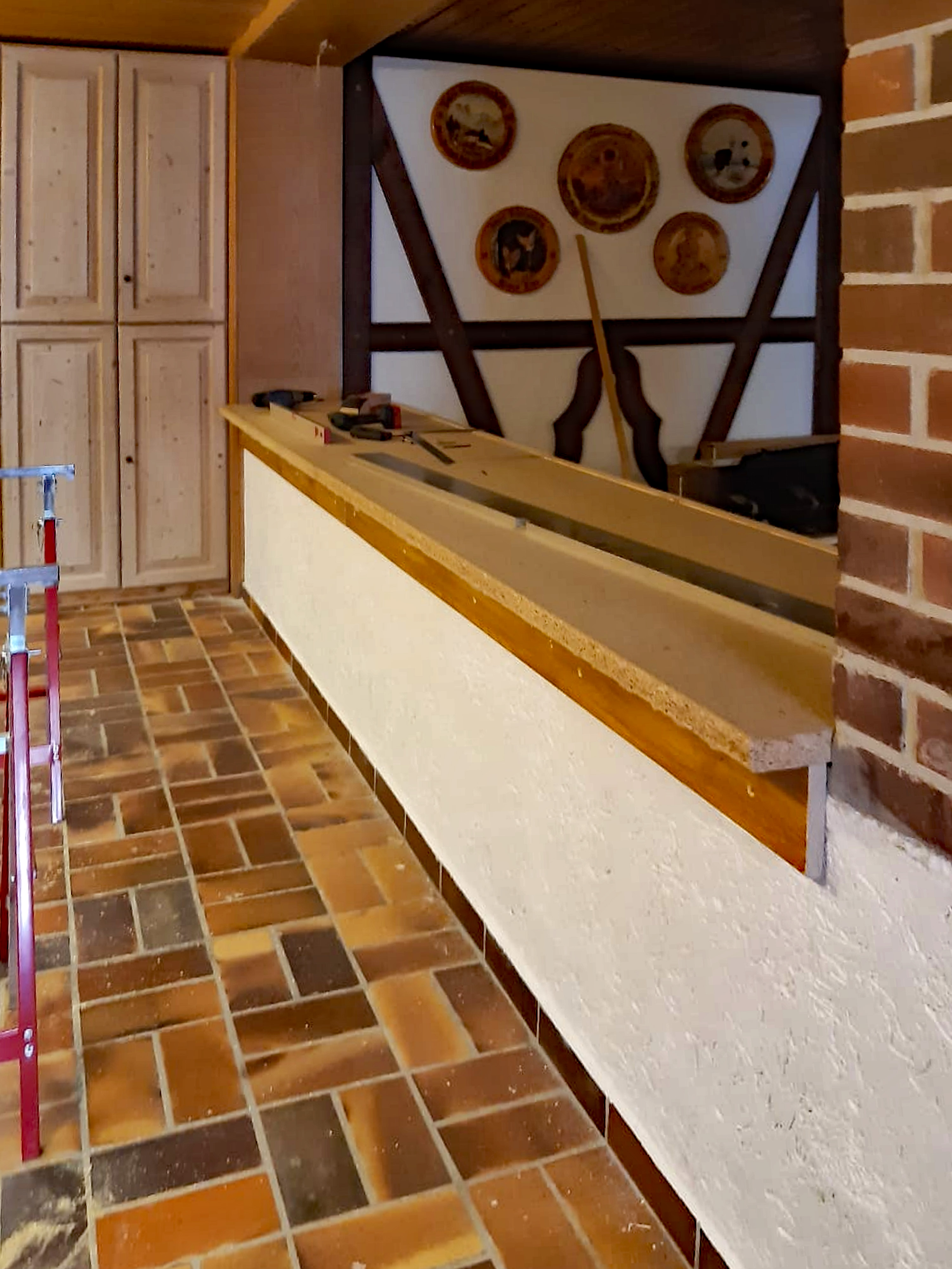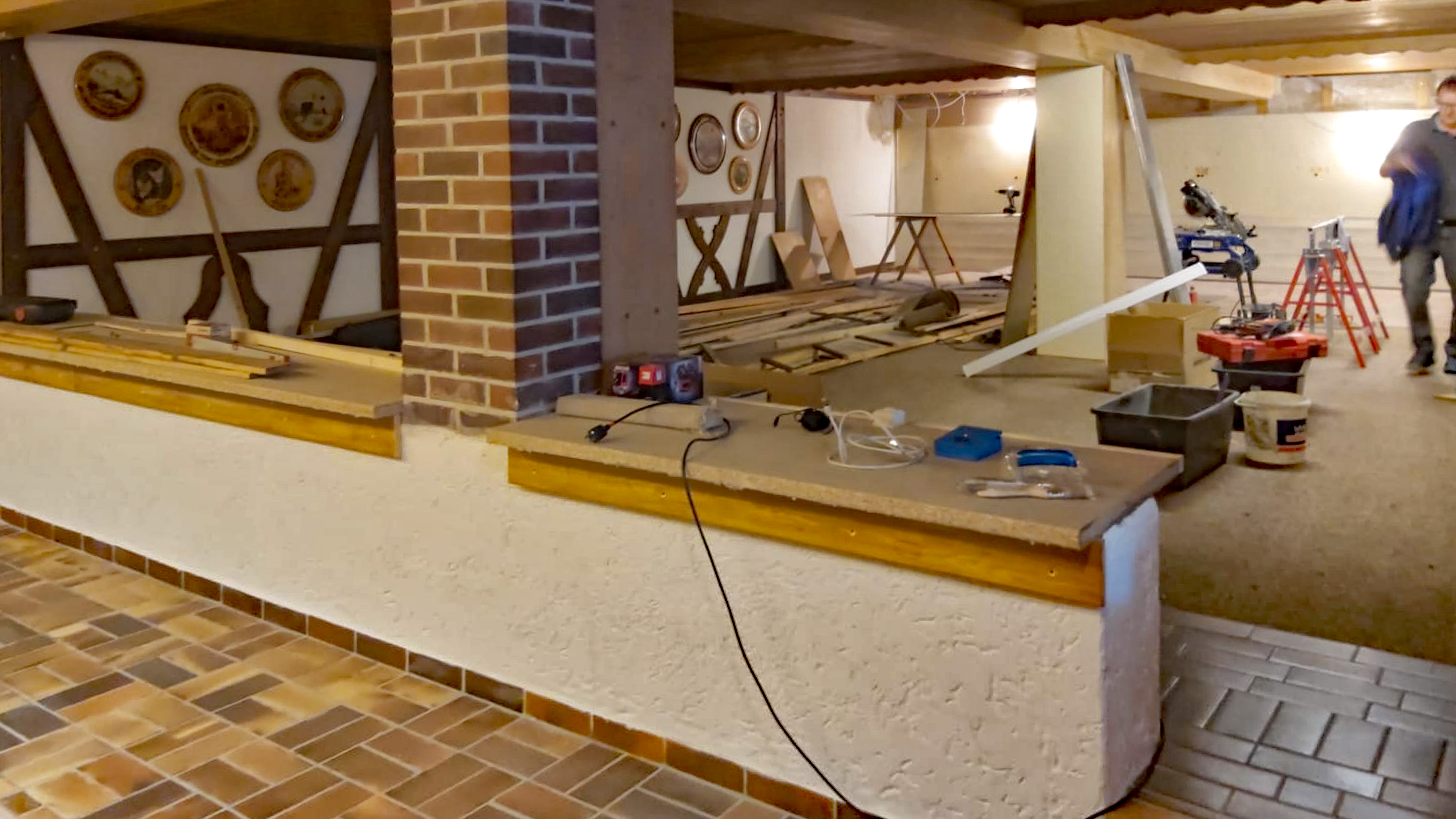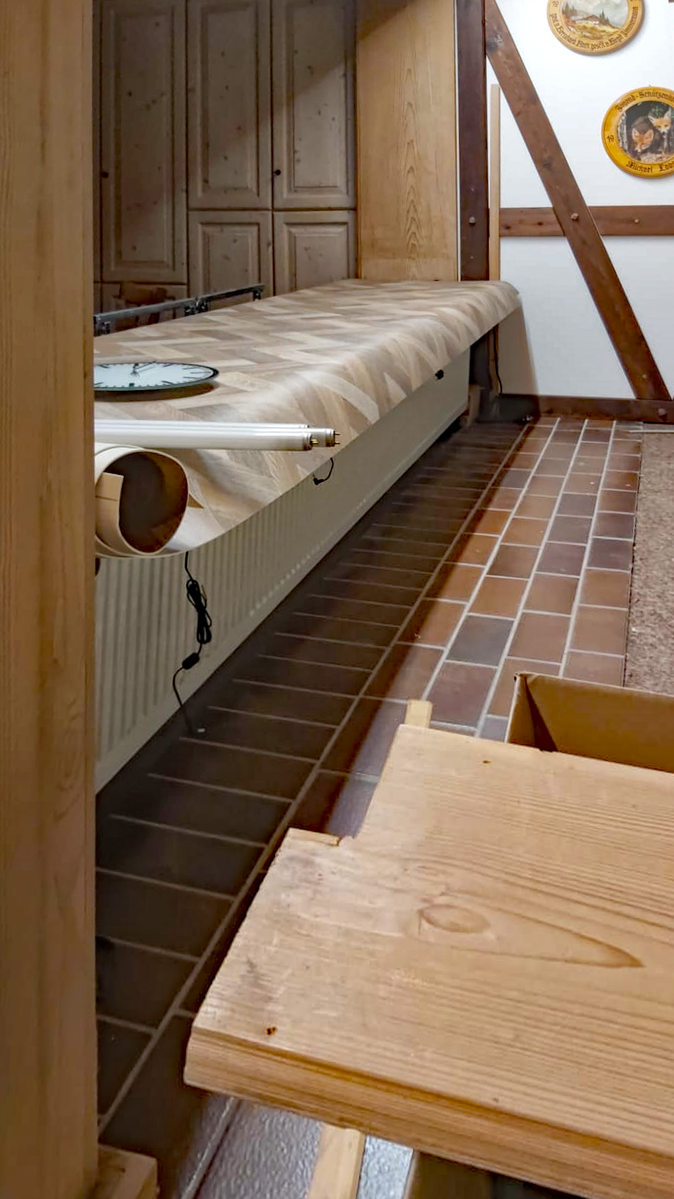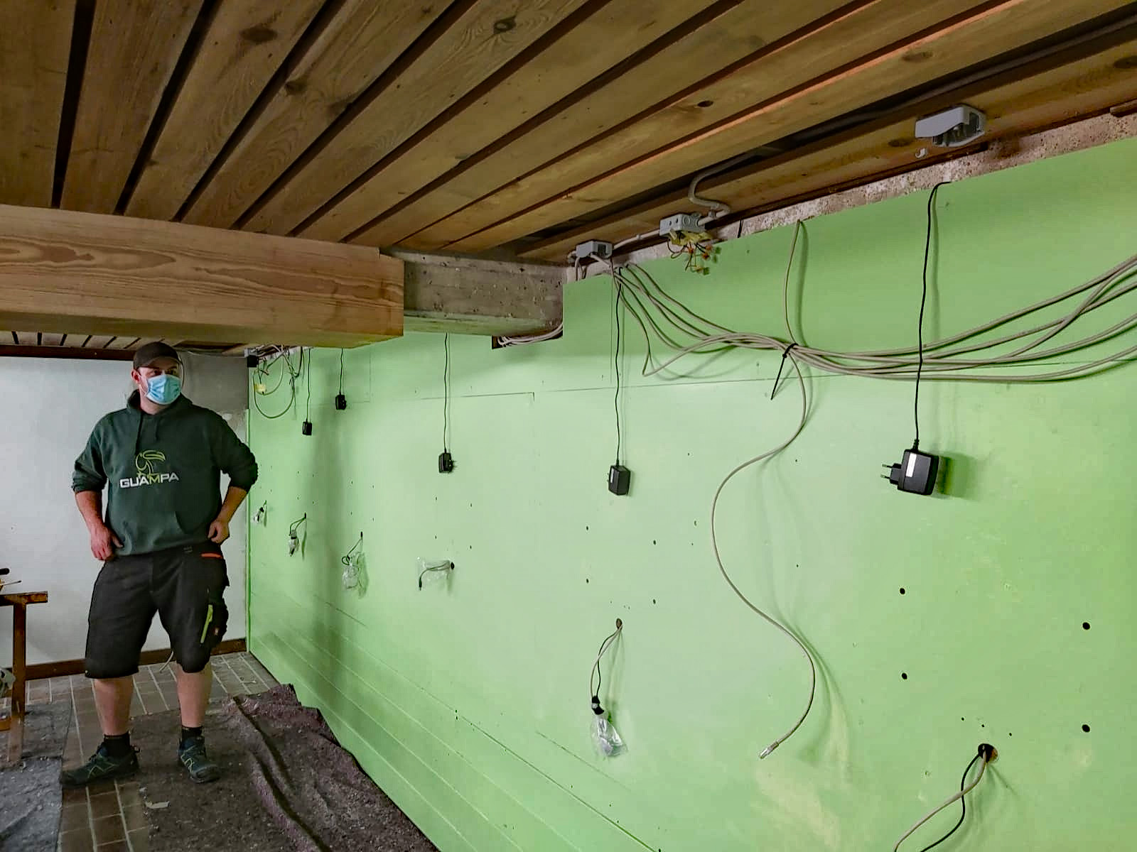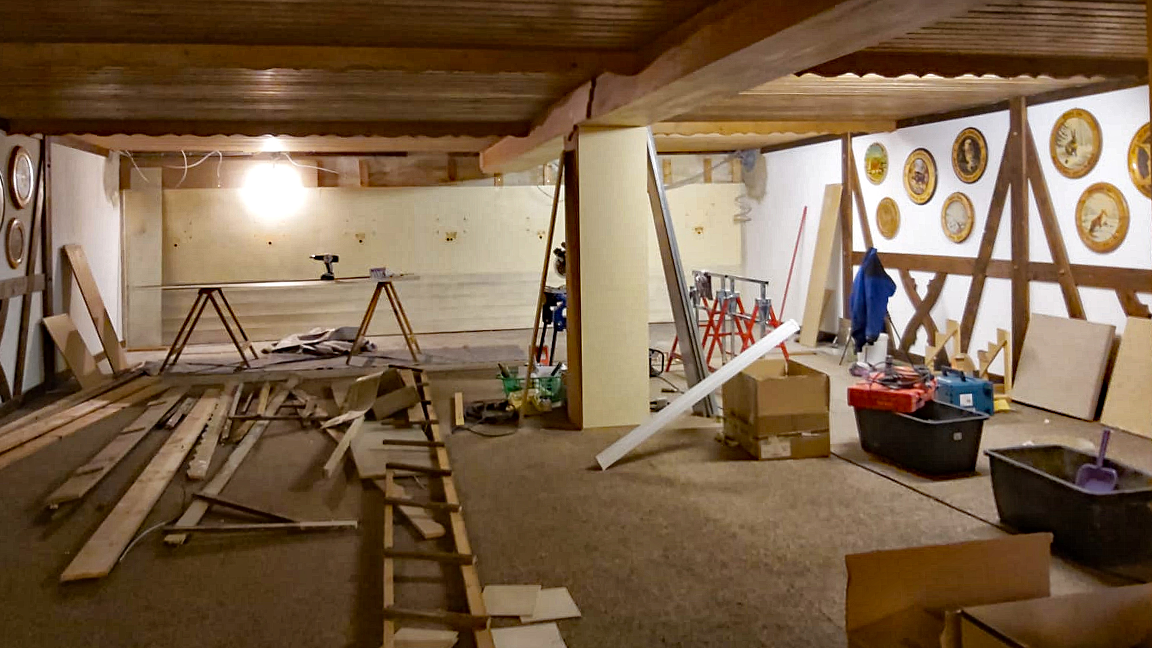Am Montag, 20. April bauen Schorsch und Hans die Seilzuganlage, so wie die vordere Verblendung ab. Am Dienstag, 21. April Vormittag montieren Haller Gerd und Schützenkönig Gradl Hans die Platte des Standes ab, nachdem vorher mühsam der im letzten Jahr neu aufgeklebte Teppichboden entfernt wurde. Schorsch und Hans übernehmen am Nachmittag wieder die Vorderfront und das Verputzen. Die beiden Mannschaften sprechen sich in den folgenden Tagen mit den Arbeiten immer ab. Dadurch ist immer nur eine Gruppe am Stand. In der Zwischenzeit ist „Elektrospezialist“ Lett Sebastian mit im Einsatz. Alte Leitungen umlegen und neu verkabeln - spät und nach Arbeitsschluss. Gerd und König Hans bringen die Platte auf die niedrigere Höhe wieder an. Ab 27. April kümmert sich Ehrenschützenmeister Zimmermann Johann um den Belag des Schützenstandes. Mit Gradl Hans und Gerd wird dieser nicht ganz problemlos, doch dann erfolgreich, aufgebracht. Johann installiert die Steckdosen und die Kabelkanäle für die Bildschirme so wie die Verkabelung derselben. In der Zwischenzeit haben Schorsch und SM Hans die Front fast komplett installiert. D.h.: Es sind die Leitungen für die Kugelfänge (Strom und EDV) verlegt. Die Steckdosen dazu sind gesetzt ( immer unter Sebastian ). Die DISAG-Kugelfänge mit Opticore-Messrahmen sind montiert. Die Wand erstrahlt in schönstem Grün und ist wieder komplett. Die neue LED-Deckenbeleuchtung mit den Blenden ist montiert und funktionsbereit. Welch eine Helligkeit !!!. Auch die Trägerverkleidung, die von 2. SM Loos Michael angefertigt ist, ist wieder von Gerd und König Hans angebracht. Nicht vergessen werden darf die ganze Verlegung der EDV-Leitungen, die bis in den Aufenthaltsraum durch die jeweiligen Wände geführt werden müssen. Alles Arbeiten von Schorsch und SM Hans in Kombination mit Sebastian und der Verstärkung durch Jugendleiter Appel Bernd. Auch der Großbildschirm im Aufenthaltsraum, mitsamt versteckter Verkabelung, ist schon angebracht. Was an Schrauben, Platten und sonstigem Holz benötigt wird, kommt von Appel Erwin.